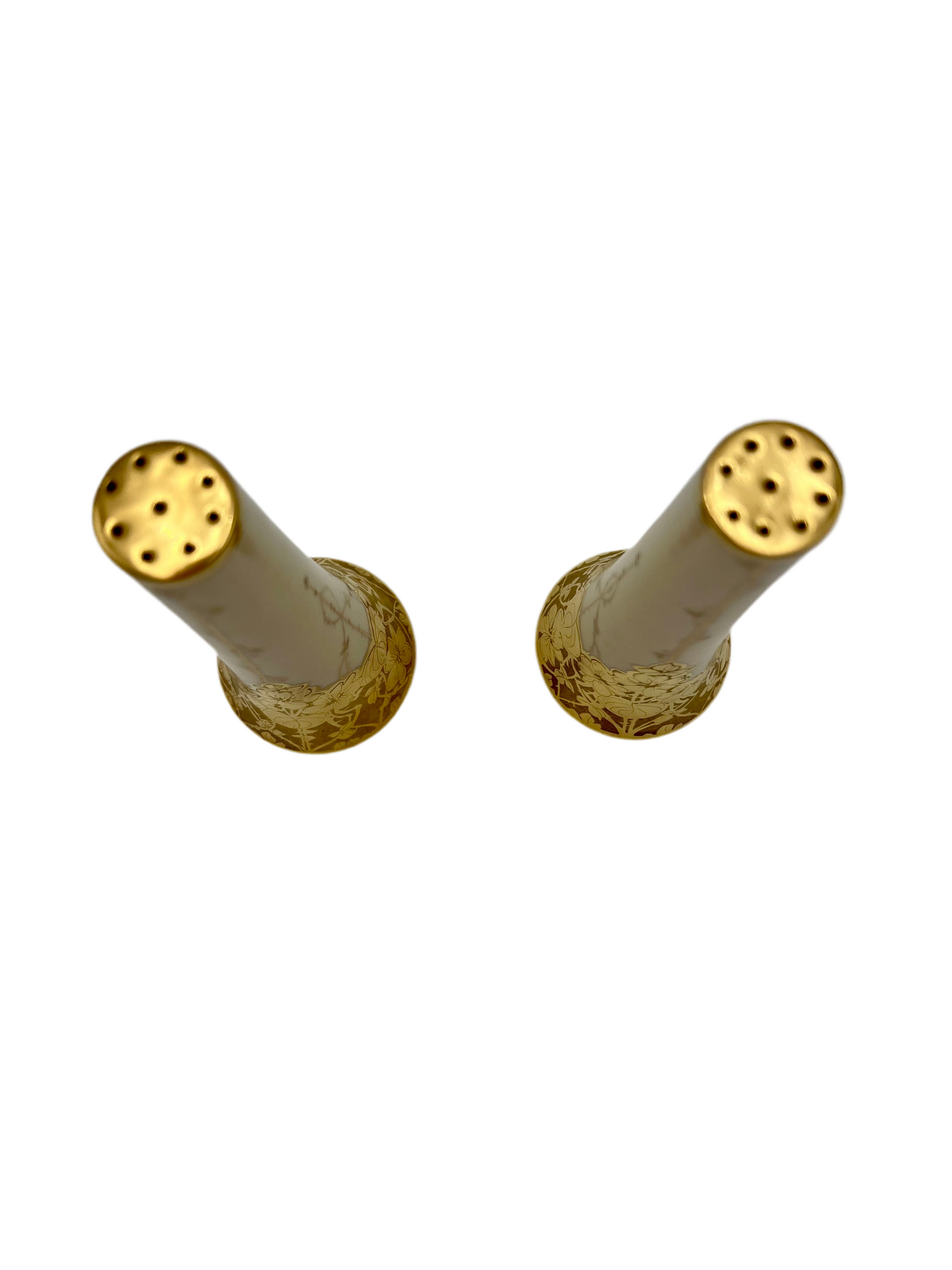 These rare tall Steiner Studio shakers are perfect for display in a china cabinet, as part of a gold gilt porcelain collection, or as a standout accent at your next dinner party.
