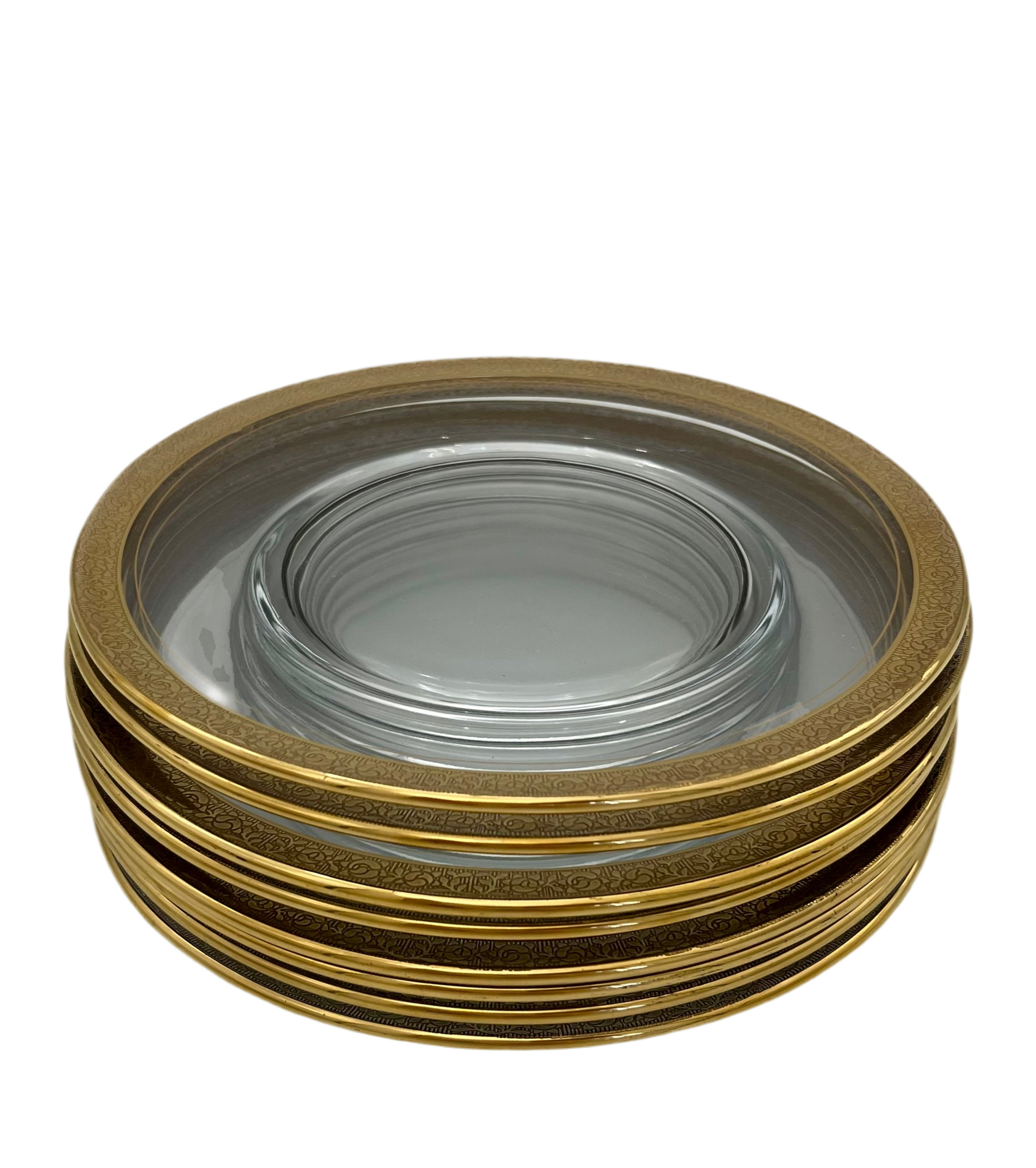 Excellent vintage condition. This exquisite set of eight (8) crystal luncheon or dessert plates showcases a luxurious 22K gold encrusted rim with a finely detailed rose and leaf motif. The crystal center glows with clarity and light reflection, creating an elegant contrast against the rich gold border.