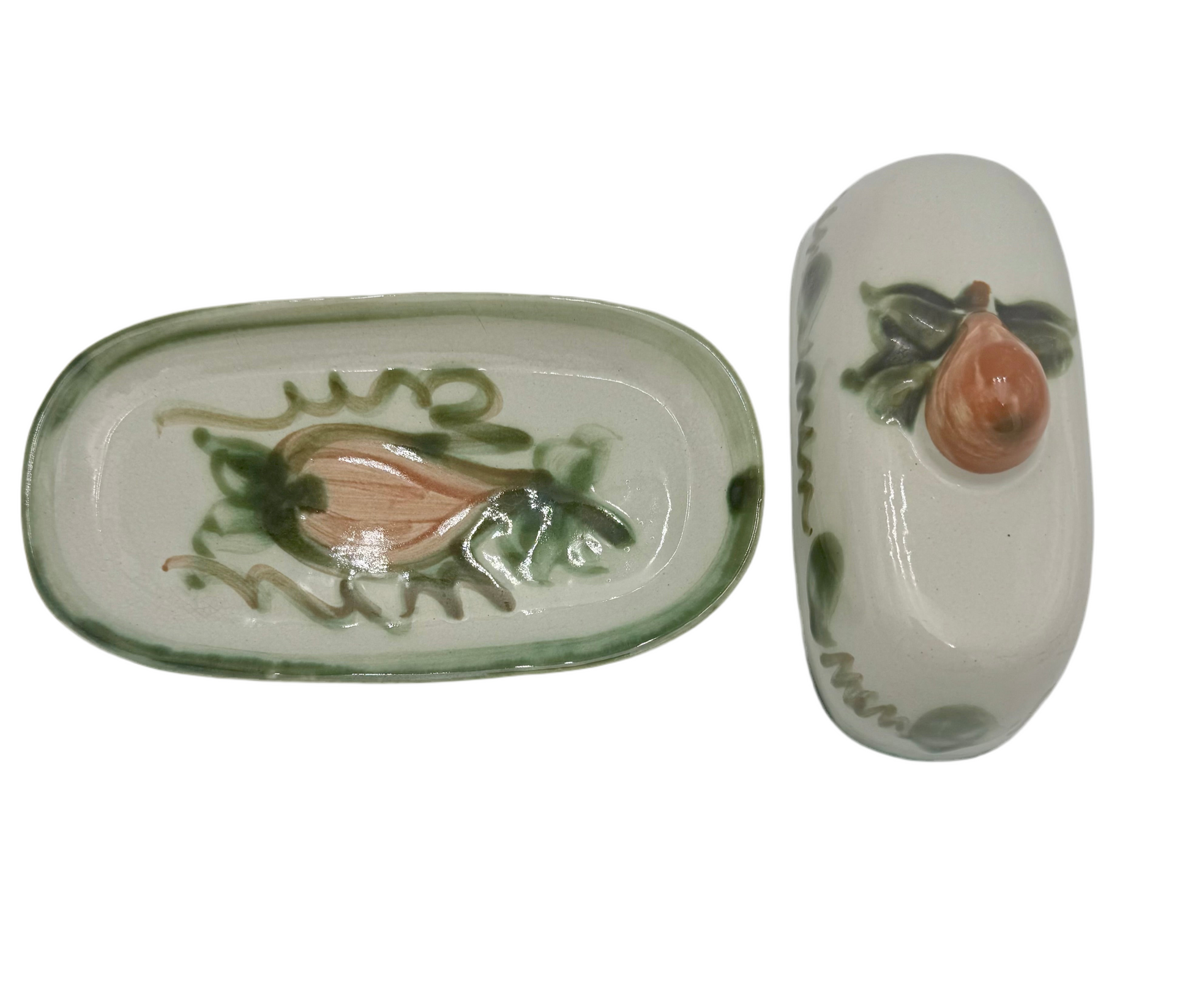 This vintage ceramic covered butter dish, crafted by the Louisville Stoneware Company in Kentucky, showcases the iconic Harvest pattern introduced in 1954. Hand-painted with delicate brown pears and vines on an off-white background, it reflects the artistry of John B. Taylor. Large and substantial, this collectible piece combines vintage charm with timeless elegance, making it a distinguished addition to any refined collection.