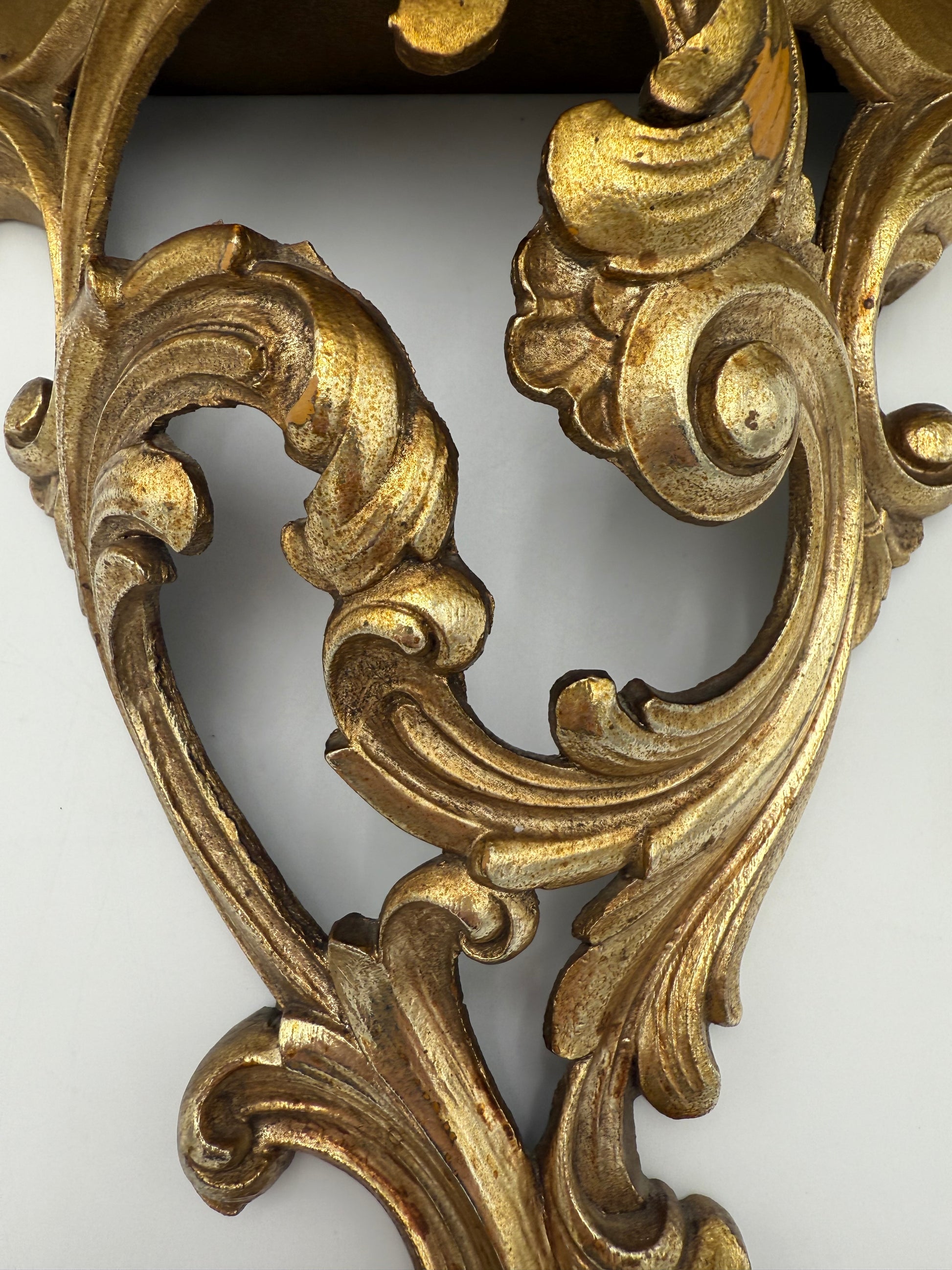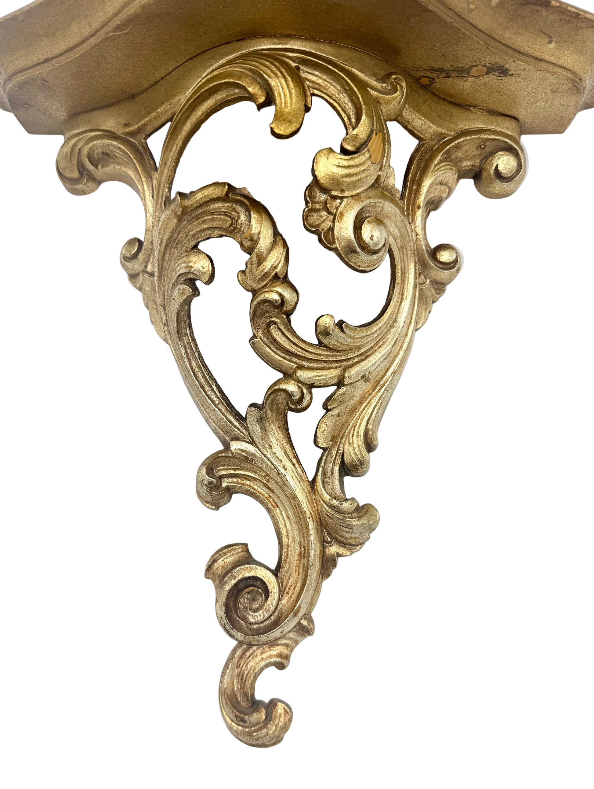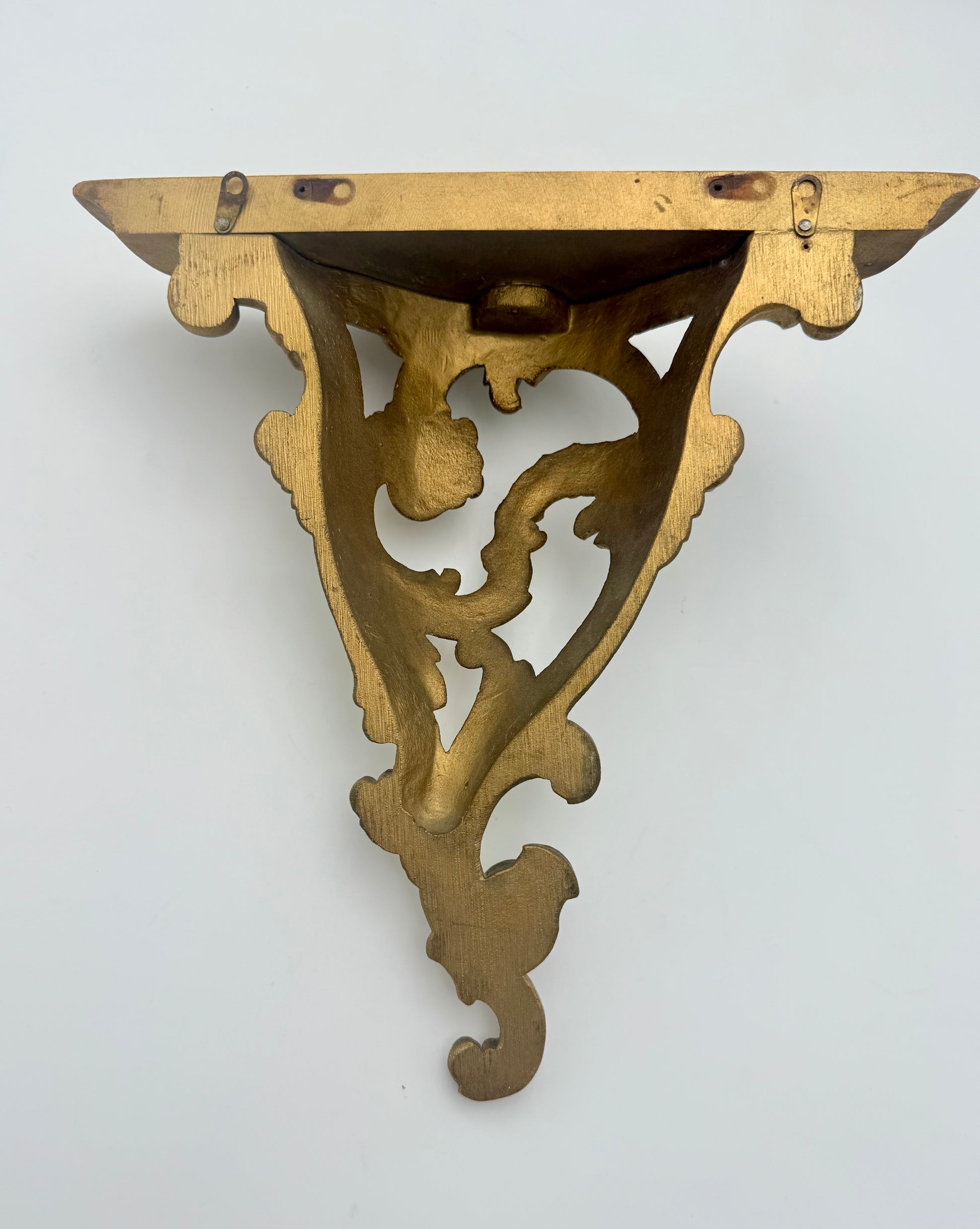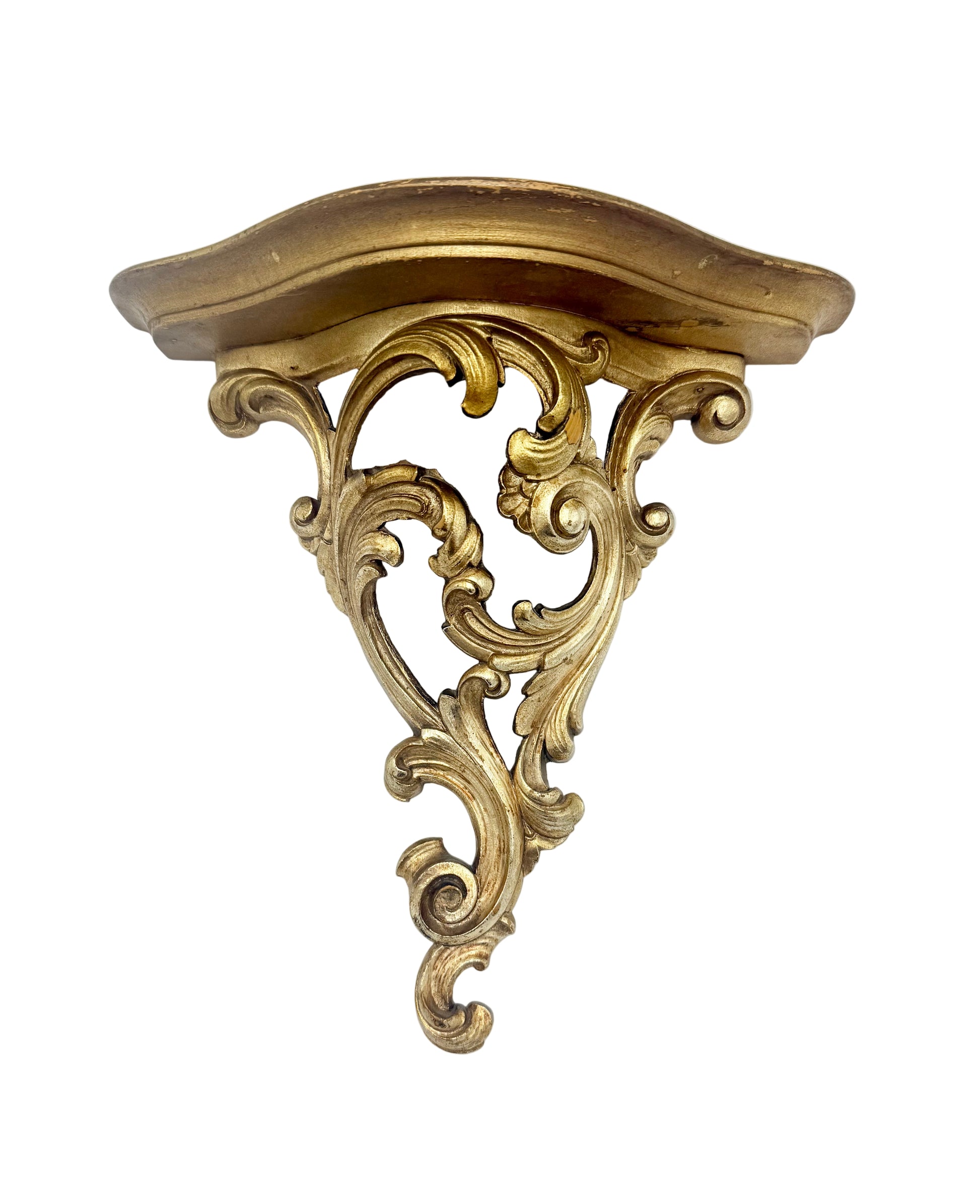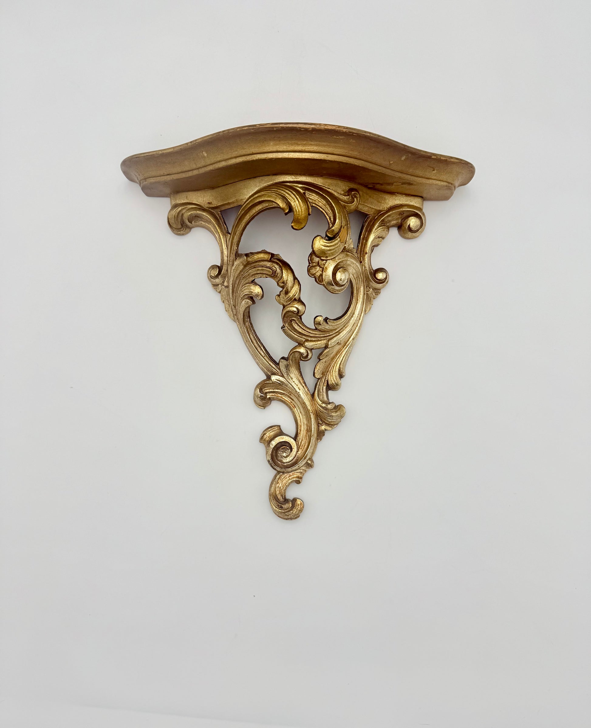 Embodying the elegance of Hollywood Regency style, this vintage 1970s Syroco gold wood wall shelf offers a sophisticated vintage accent for your space. Its intricate gold scroll design gracefully frames a practical plate slit atop the shelf, ideal for displaying cherished plates or decorative items. It's also perfect for showcasing knick-knacks or keepsakes, or even a Bluetooth speaker!  This oh so fabulous wood sconce shelf combines timeless charm with functional appeal.