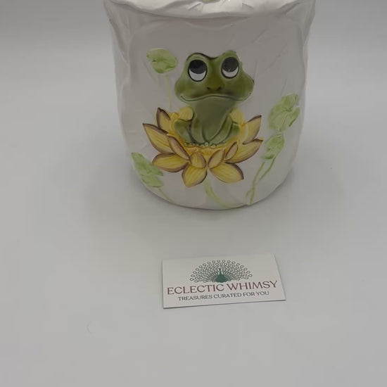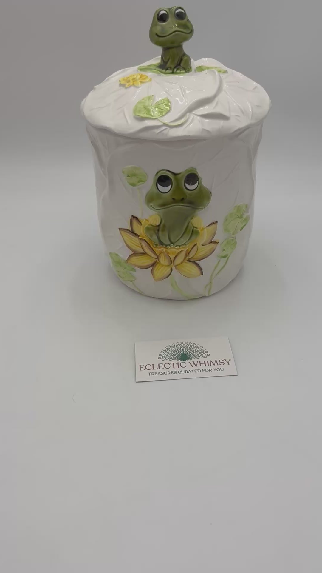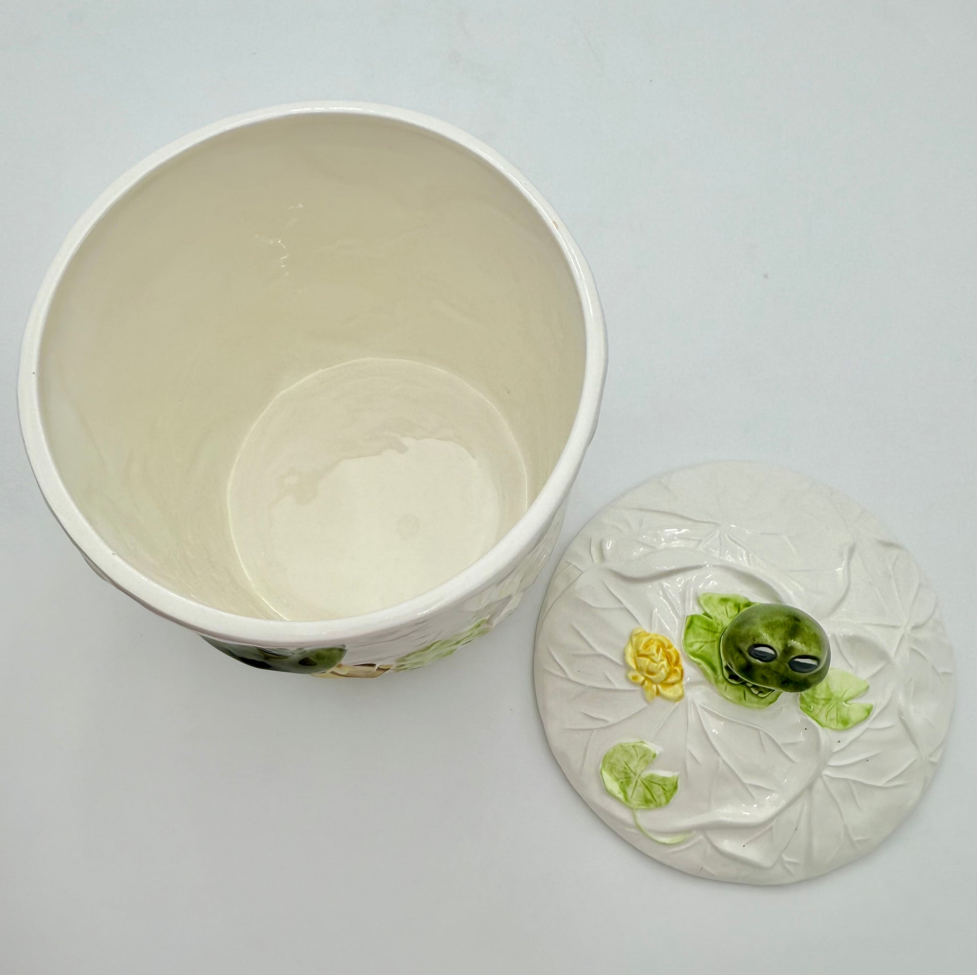This particular canister is from that original 1976 release, celebrated for its rich color, high-gloss glaze, and signature double-frog design (one perched on the lid, another nestled beside a lily flower on the base). It’s one of the most beloved pieces from the line — cheerful, nostalgic, and instantly recognizable to vintage collectors.
