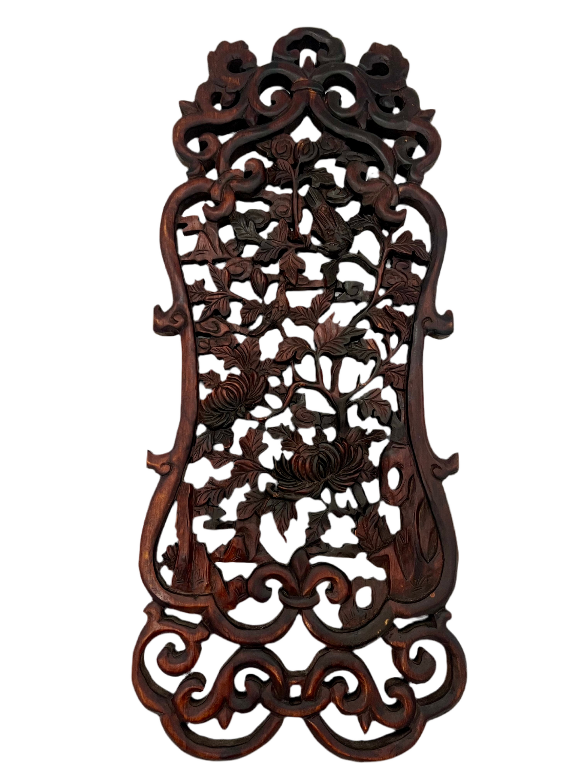 Elevate your home with this striking antique Chinese hardwood panel, richly hand-carved in openwork relief. Standing at 24 inches tall, this piece features an intricate design of songbirds perched among chrysanthemums and blossoming branches—a classic Chinese motif symbolizing longevity, vitality, and harmony with nature.