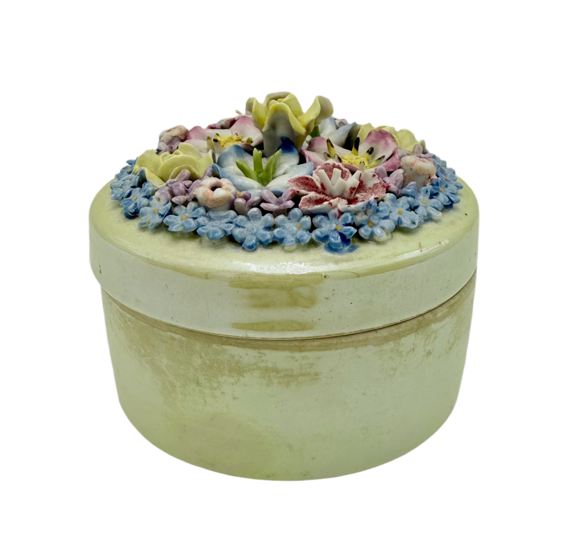 This exquisite antique Elfinware porcelain box, dating back to the 1920s, features an ornate raised floral design on its iridescent light green lid. Originally crafted as a powder box, its high-quality porcelain construction ensures lasting elegance. Perfect for storing jewelry or cherished trinkets, this piece carries a refined charm and a rich history, having survived WWII. A sophisticated addition to any collection or vanity.  So pretty!
