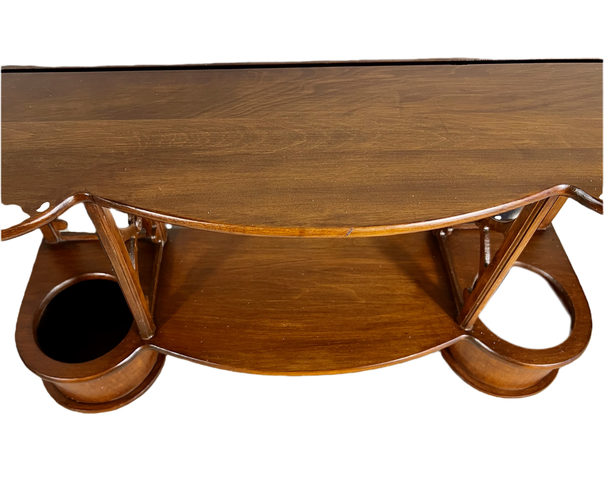 Bring Victorian elegance into your home with this antique Gothic Revival wall shelf, dating from the late 19th century. Beautifully refurbished, this unique piece features arched fretwork supports, rich wood grain, and two recessed jardinière holders perfect for displaying plants, flowers, or decorative vessels.