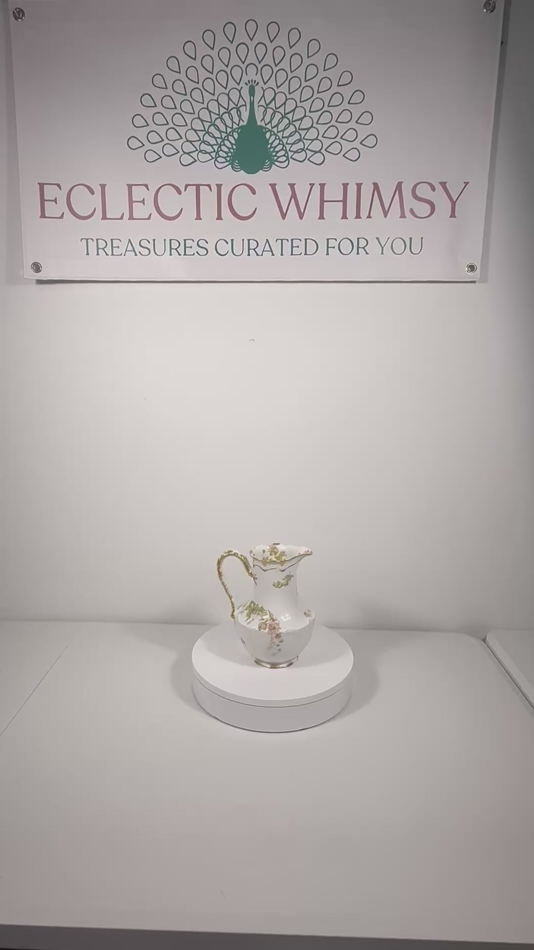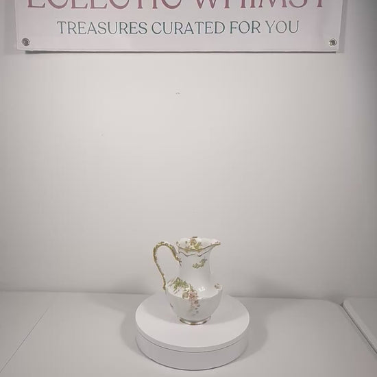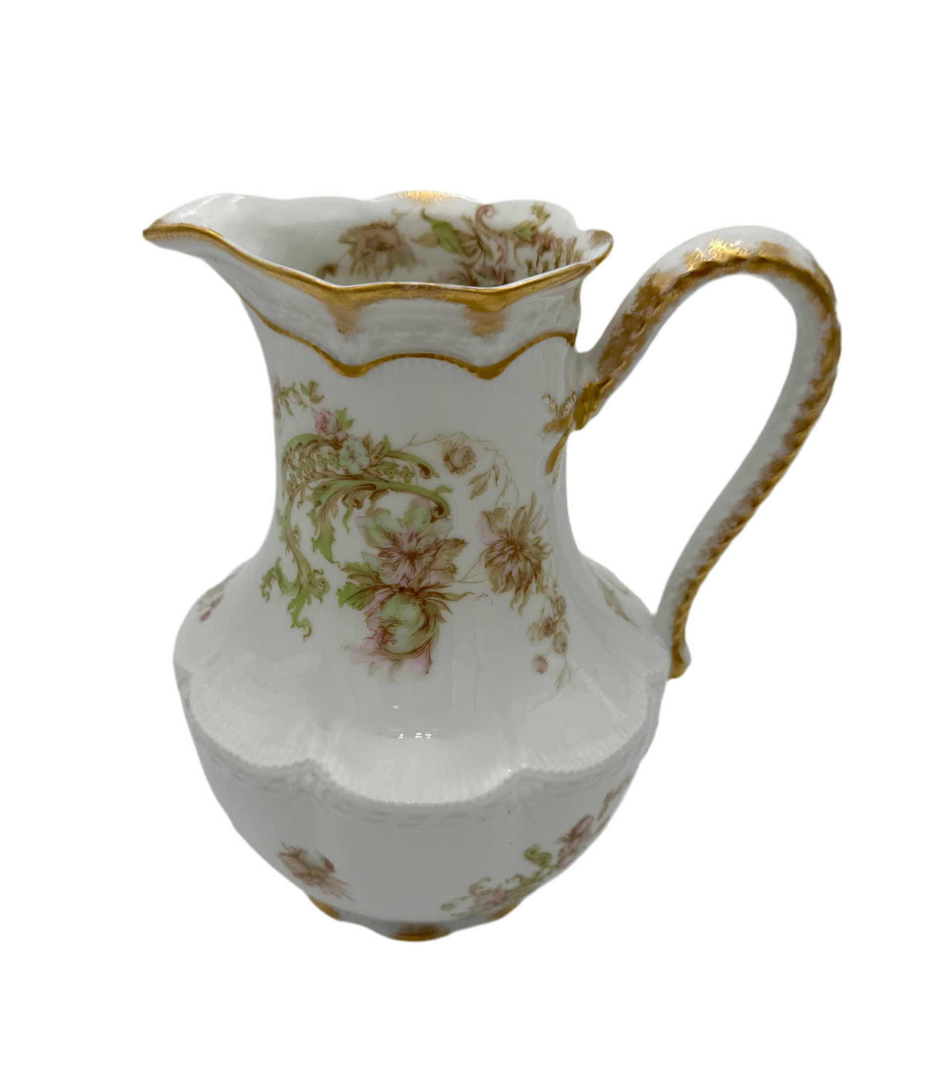 This exquisite antique Haviland & Co. Limoges porcelain pitcher captures the romantic artistry of the late 19th century. Handcrafted in Limoges, France between 1888–1895, it features a softly scalloped rim, delicate floral transfers in blush pink and sage green, and hand-applied gold gilt accents that shimmer along the edges and handle.