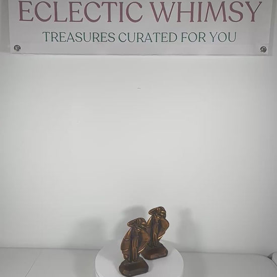 Step back into the bold, geometric glamour of the 1920s with this stunning pair of antique Art Deco bookends titled “Miss Moderne.” Sculpted in streamlined relief, the stylized female figure embodies the Jazz Age fascination with modern beauty, speed, and movement.