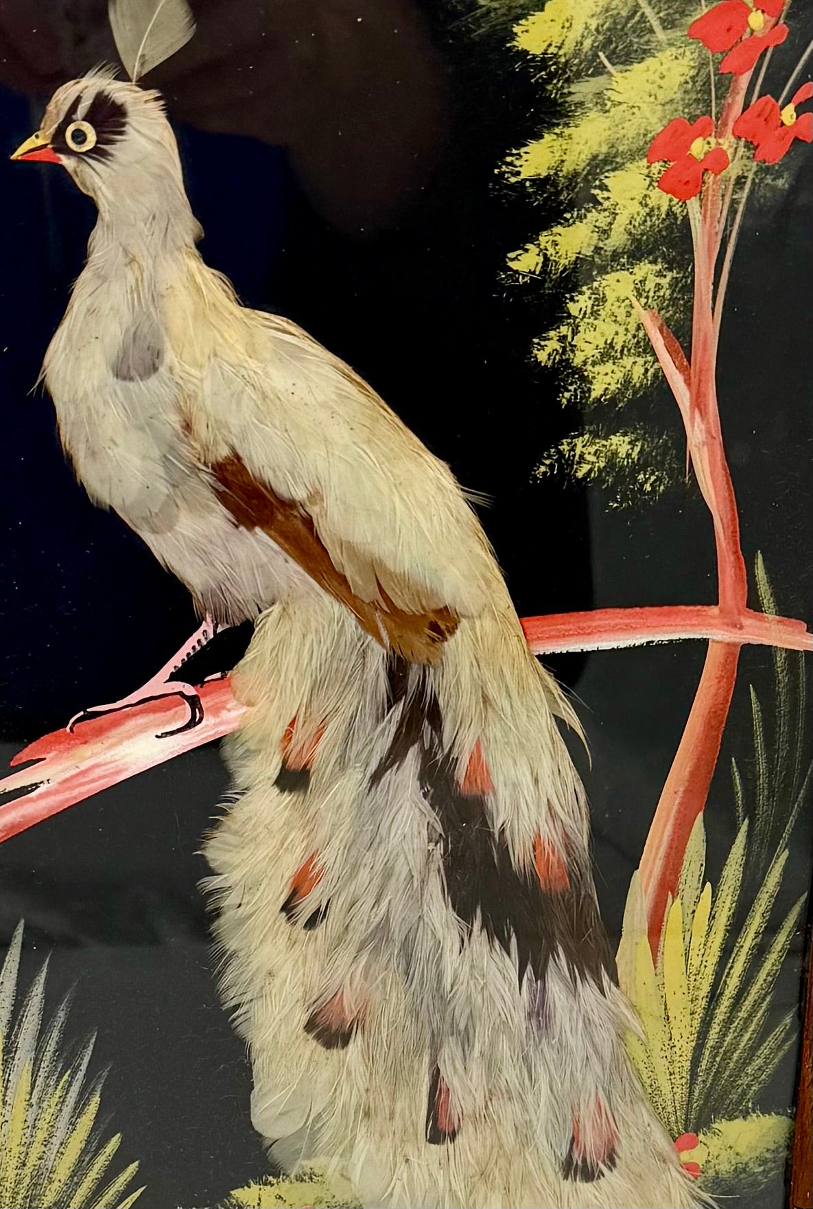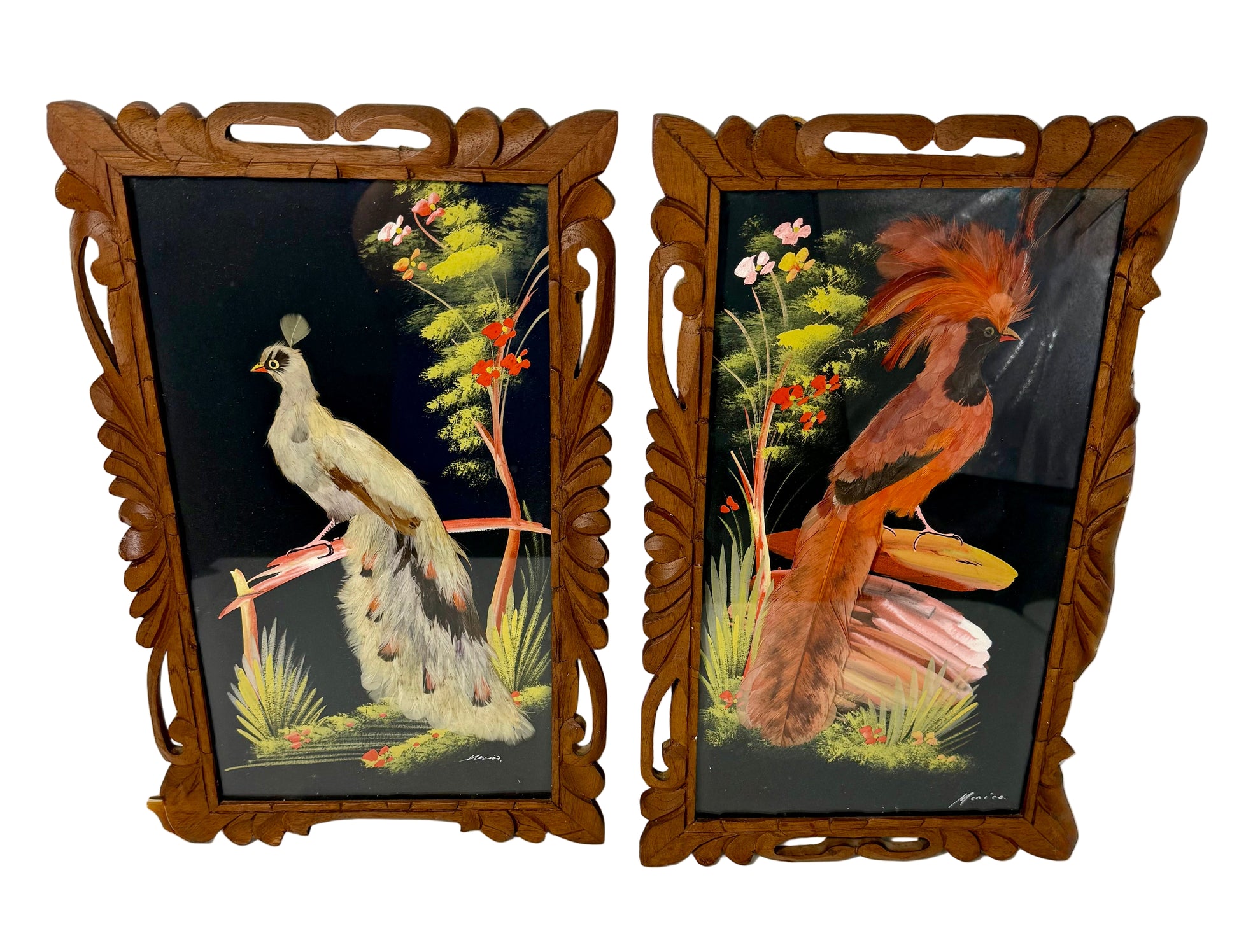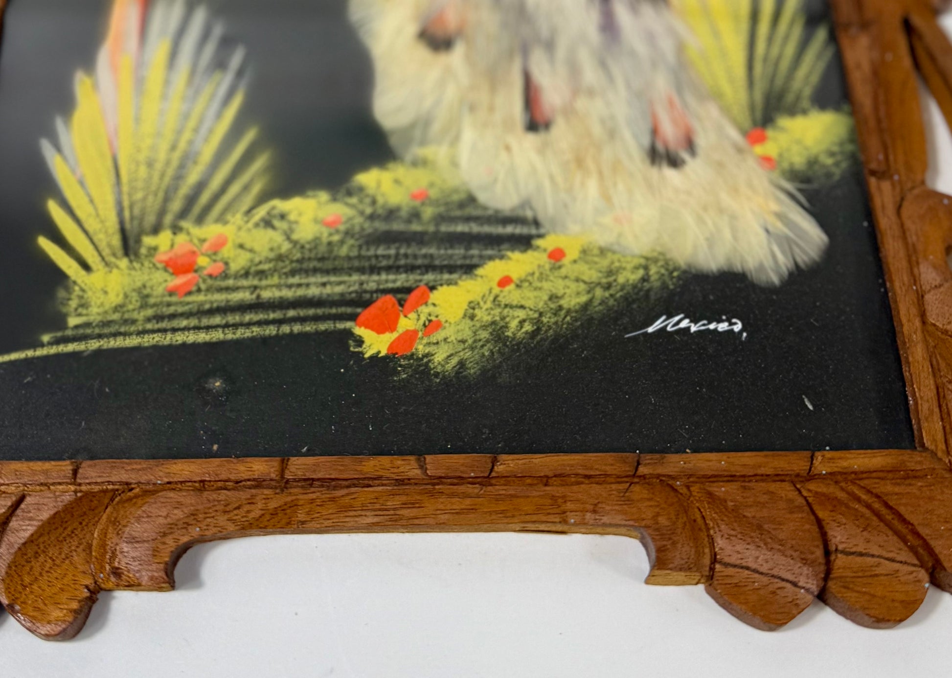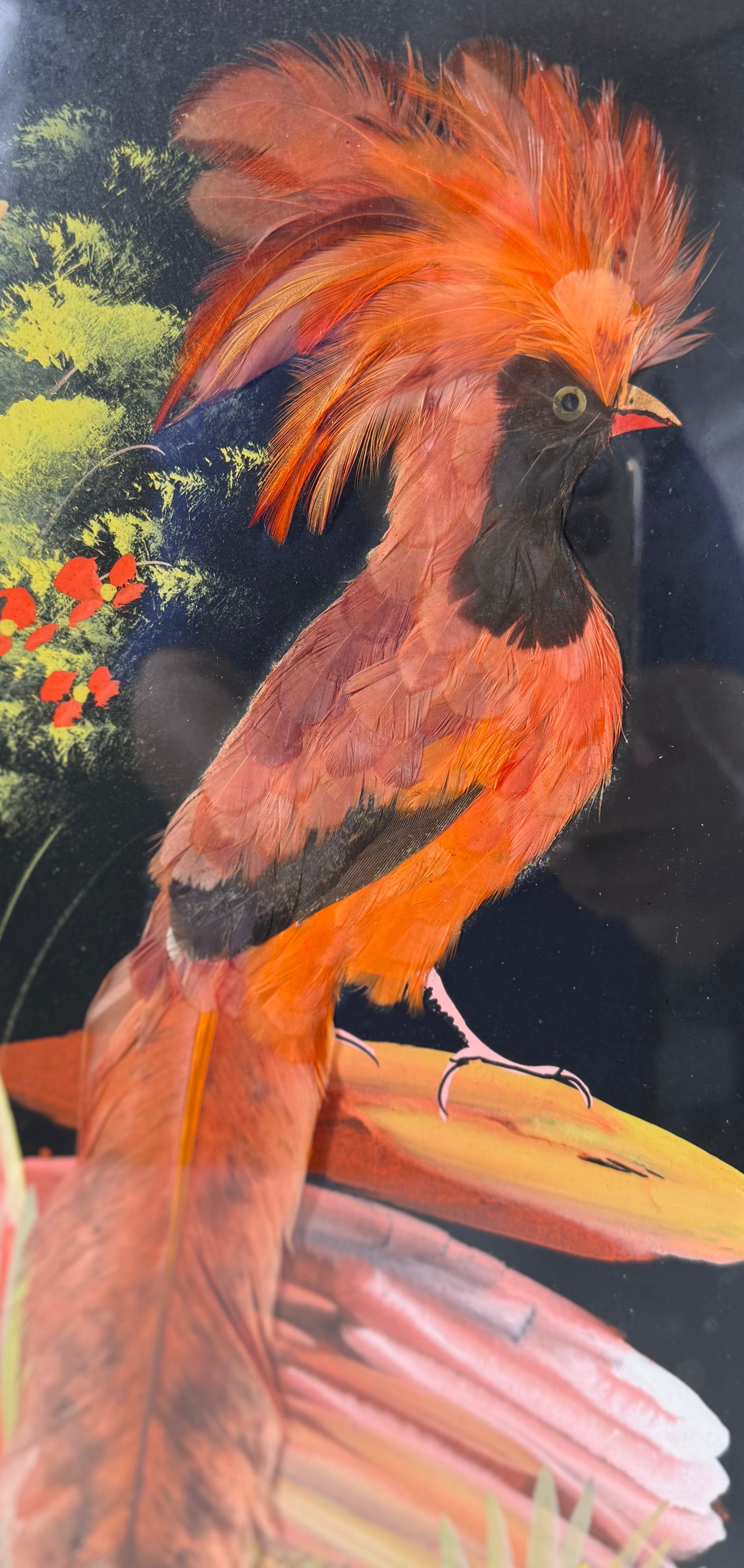 A breathtaking pair of vintage Mexican feather artworks, each featuring a brilliantly detailed exotic bird made entirely from real feathers. These handmade pieces showcase the exquisite artistry of mid-century Mexico, where artisans layered dyed feathers over hand-painted backdrops to create lifelike tropical birds bursting with color and personality.