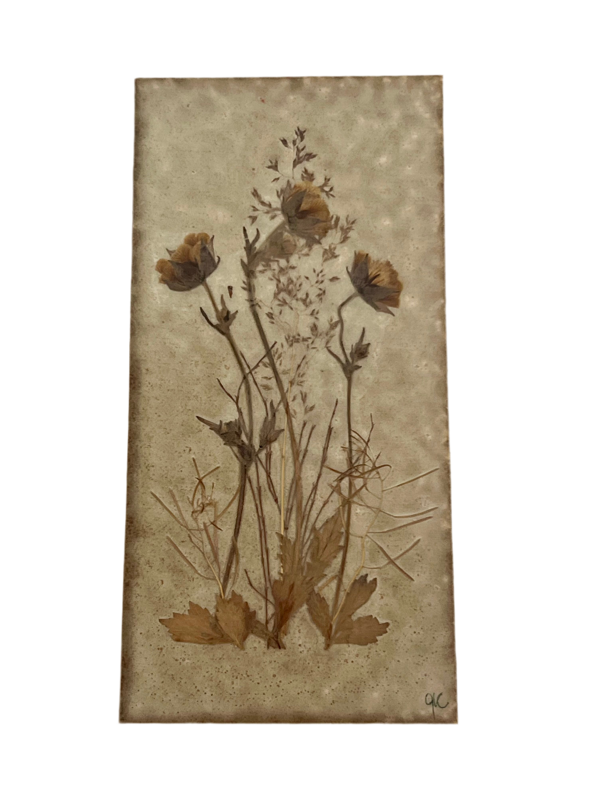 This example is signed AC on the lower right corner, one of the known artisans who contributed to the Danish Handicraft pressed-botanical series. The flowers retain excellent definition and warm coloration, with delicate stems and grasses clearly visible in the fired surface.