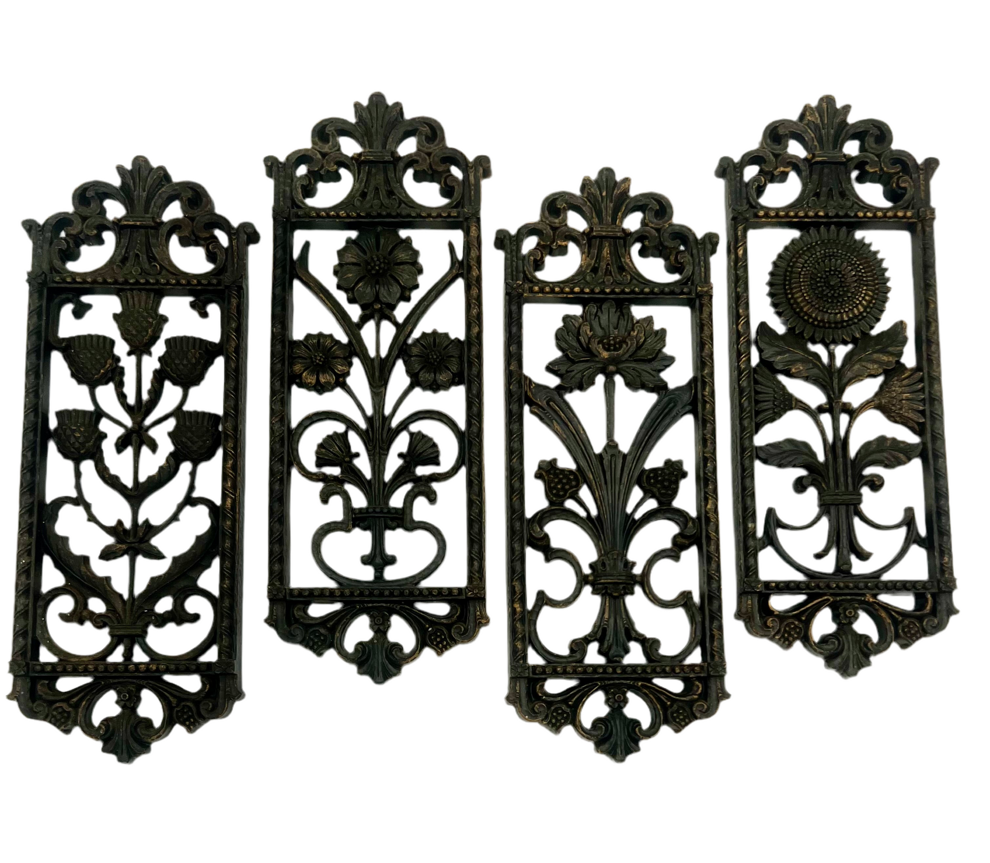 A beautiful matched set of four vintage Burwood Products Co. wall plaques, crafted in the late 1960s–70s and designed to mimic the look of antique wrought iron. Each plaque features a unique stylized floral motif—thistle, daisy, lotus, and sunflower—surrounded by ornate Gothic Revival scrollwork and a rich dark bronze finish with subtle gold highlights.
