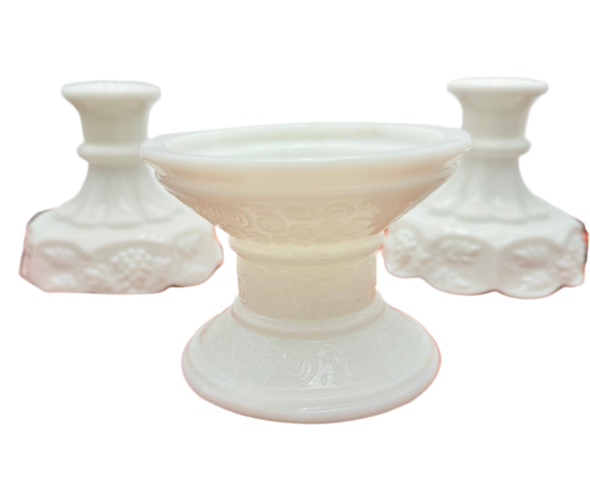 Add a touch of charm to your space with this playful trio of Eclectic Whimsy curated milk glass candle holders. Featuring two Westmoreland scalloped grapevine patterned candle holders.  Each piece cleverly reverses to double as a dish, perfect for small treasures or snacks. Featuring a pillar candle holder adorned with a delicate rcircular design.  These white milk glass beauties bring vintage whimsy and versatile style to any room.  The trio together shine!  So pretty!