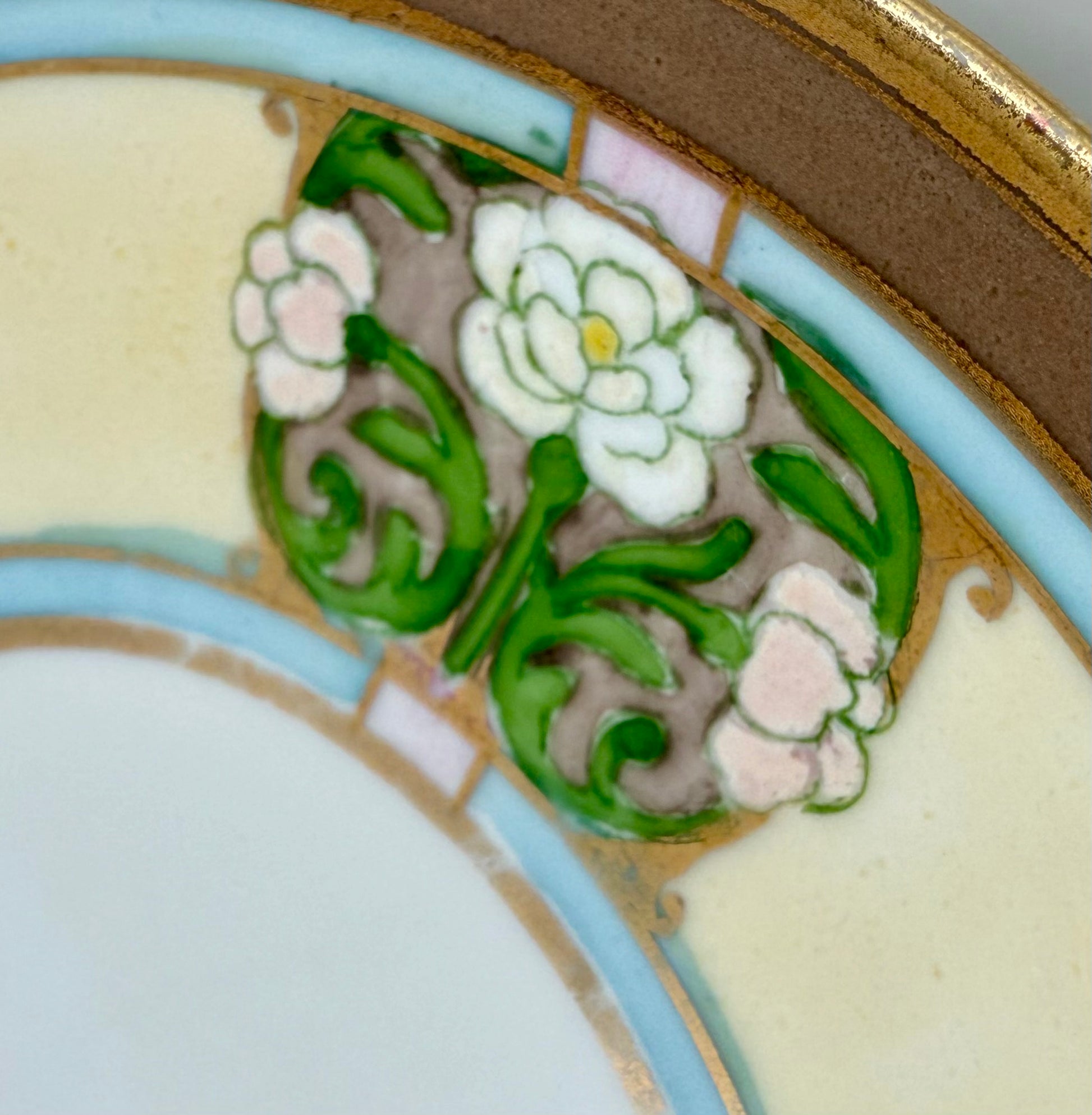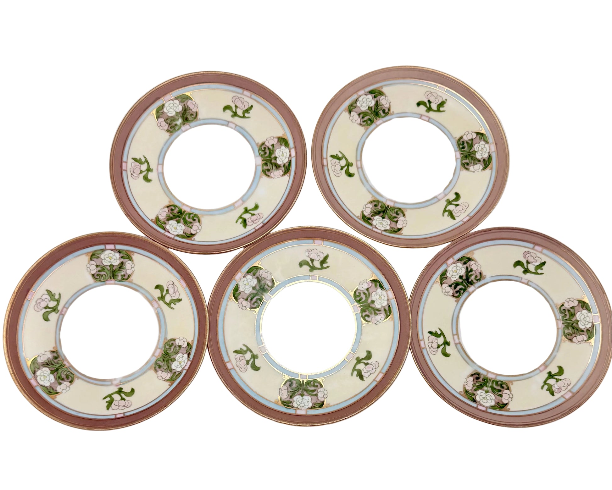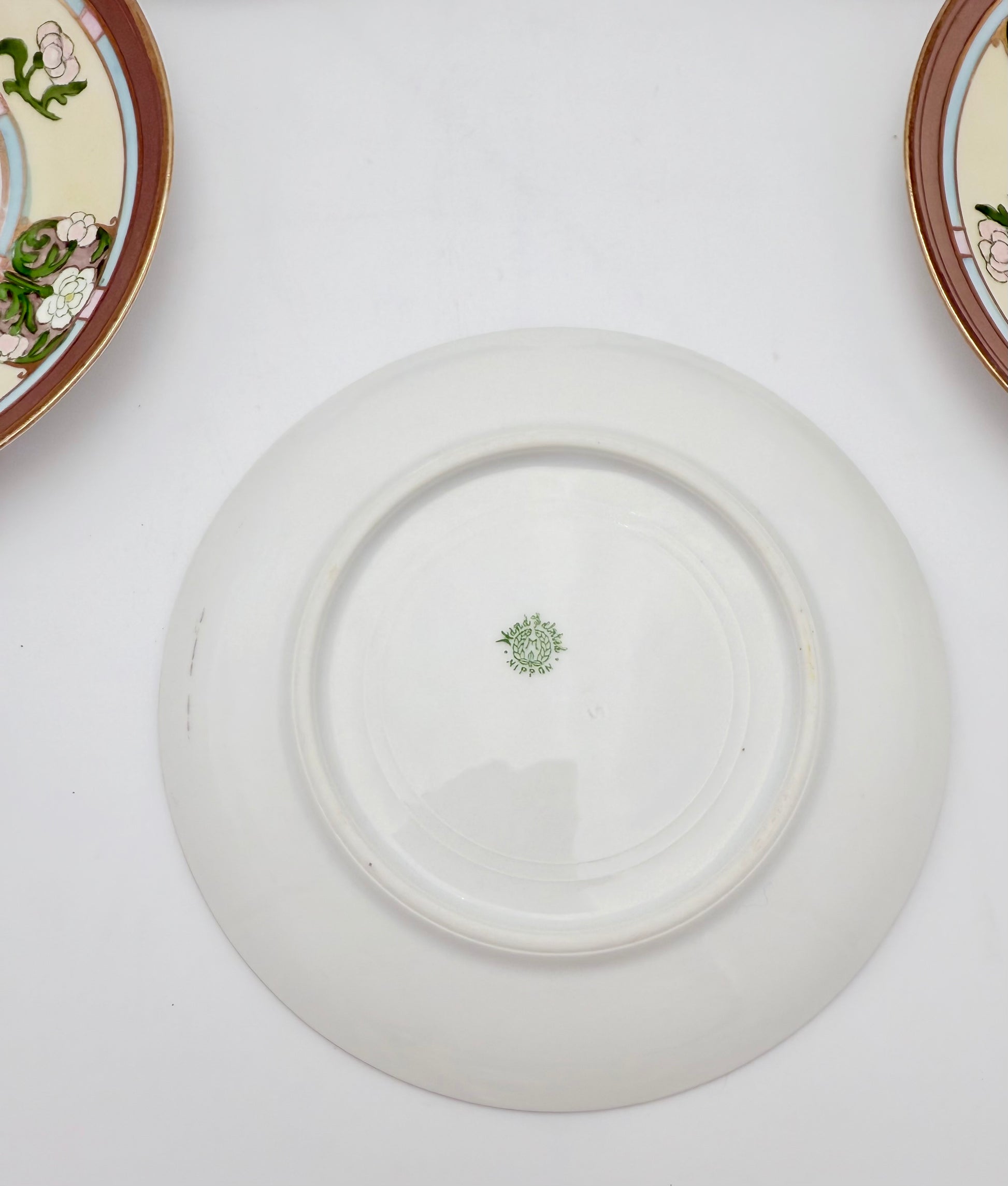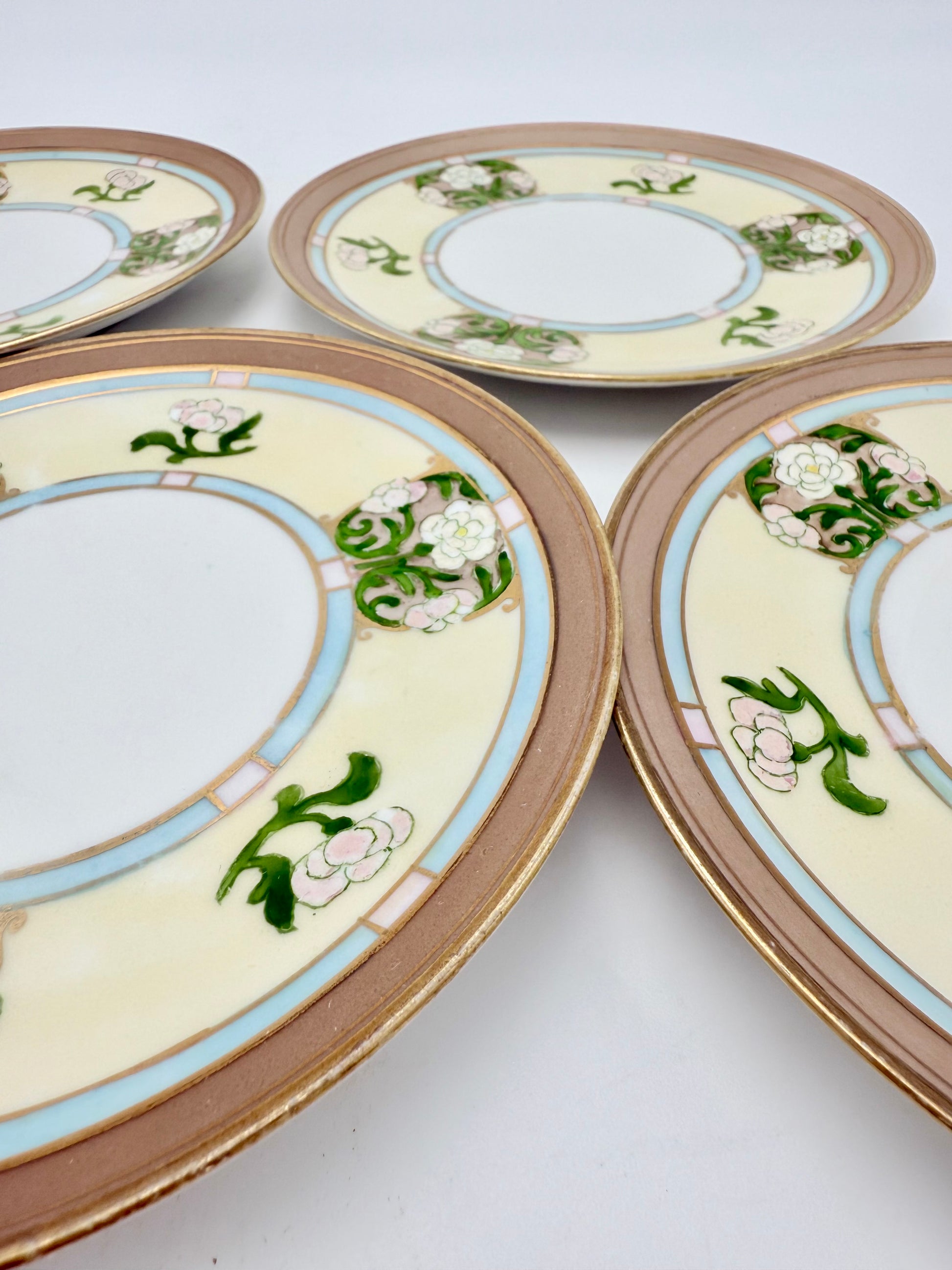 A beautiful set of five hand painted Nippon bread and butter plates crafted by the Morimura Brothers, the early makers behind Noritake. These plates feature the sought-after green M-in-wreath Nippon backstamp used between 1911 and 1921. Each plate is decorated with raised enamel florals, soft pastel banding, and gilt details along the rim and inner circle.