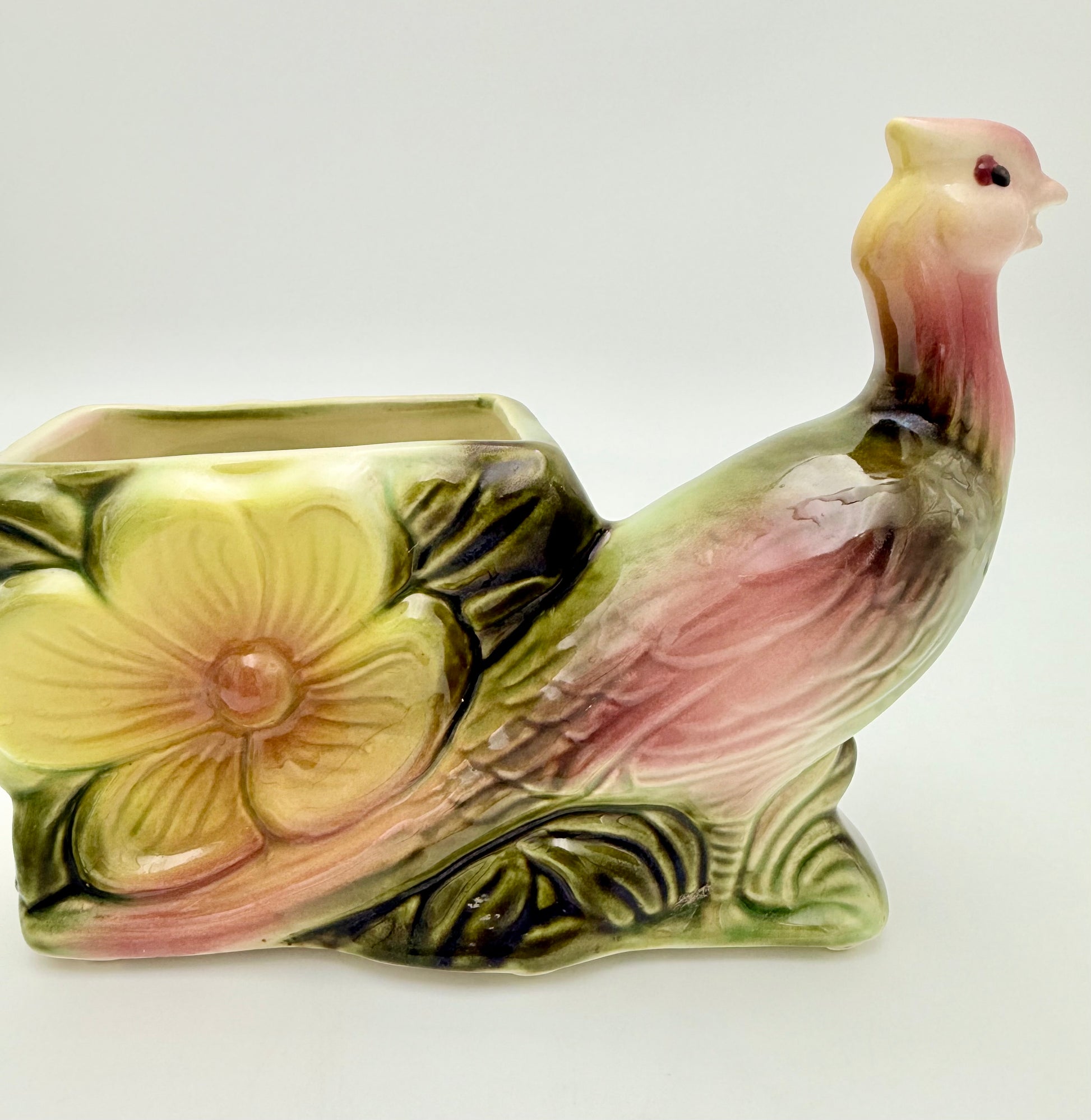 A beautiful mid-century Hull Pottery figural planter featuring a detailed pheasant beside a floral box planter, marked “Hull 61 USA.” This piece showcases Hull’s classic 1940s–1950s airbrushed shading in soft greens, yellows, and pinks, with a glossy finish and sculptural depth. A charming addition to any vintage pottery collection and perfect for displaying small plants, succulents, or as a whimsical accent in an Eclectic Whimsy–styled vignette.