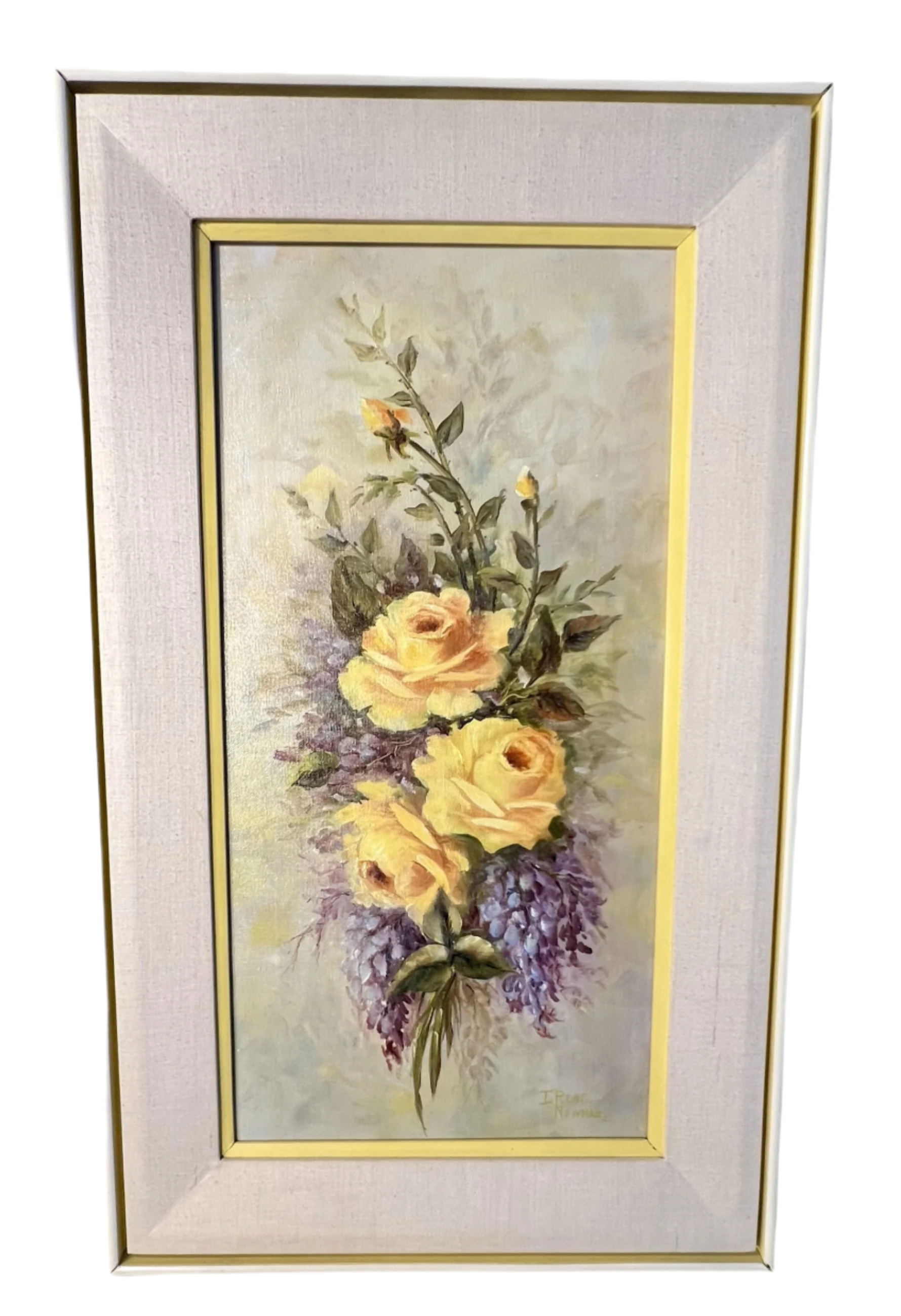 Painted by Irene Newman, a regional decorative artist active in Texas during the late 1970s–1980s. Her work was known for its gentle color palettes, graceful florals, and classic gold-trimmed framing—often sold through Texas galleries and home décor boutiques. The original sale price for this piece was $78, making it a cherished example of accessible, handcrafted art from that era.