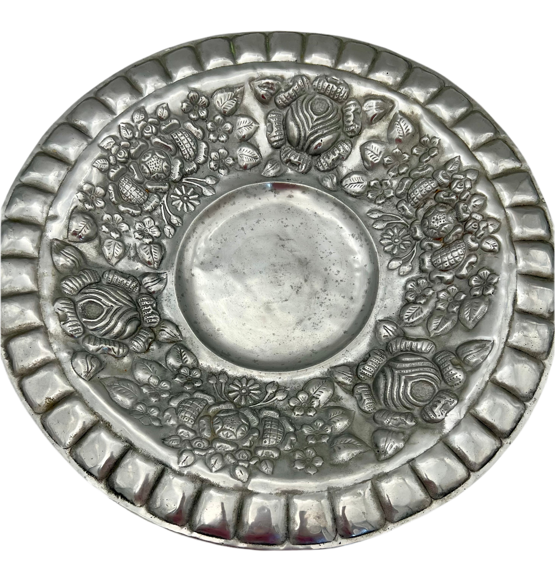 This vintage 1950s pewter tray is a stunning showcase of hand-embossed artistry. The intricate floral and botanical motifs bloom across the surface, giving it a lush, storybook quality that feels both regal and rustic. Its silvery pewter sheen carries a soft, timeworn glow — that lovely kind of patina that only comes with age and good use.