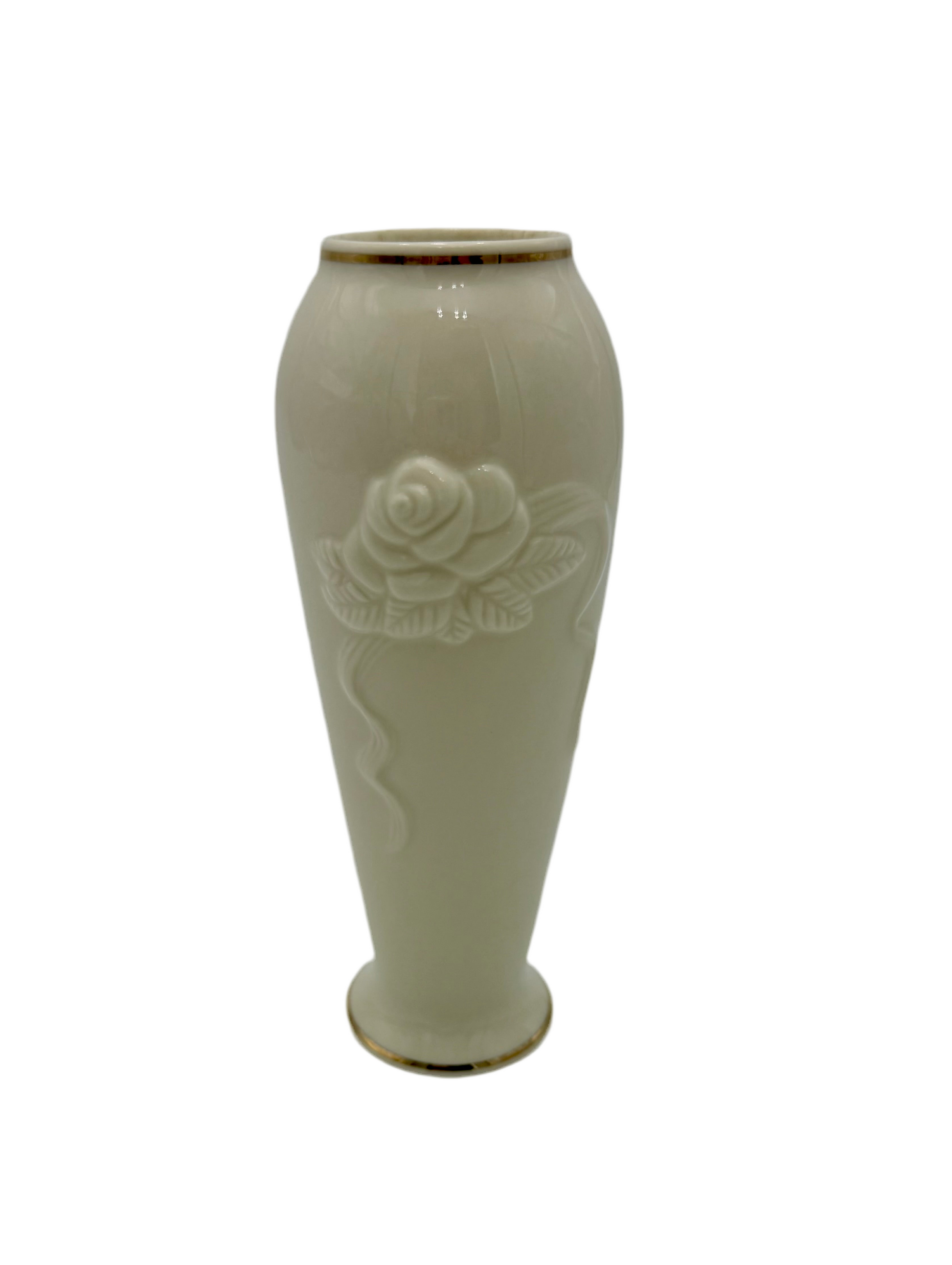 Add a touch of whimsy to your space with this ivory Lenox Rose Blossom Bud Vase. Crafted from porcelain, it features a charming raised rose design with delicate ribbons and a luxurious 24k gold trim. Perfect for showcasing a single bloom or brightening any nook with its playful elegance.
