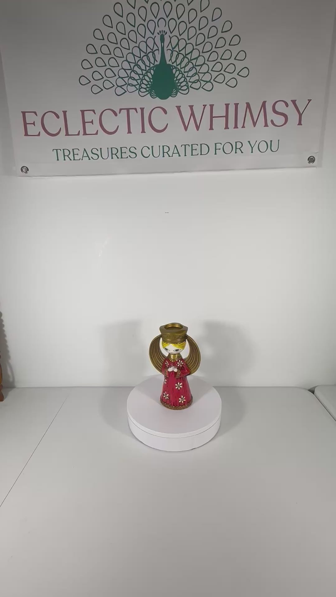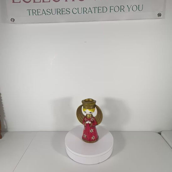 This charming midcentury Christmas angel candleholder from the1960s, made in Japan, boasts gorgeous details you’ll adore. Dressed in a festive red outfit dotted with white daisies, she shines with gold wings and a ornate gold crown. Whether you light a candle or let her stand solo, this vintage beauty brings a whimsical holiday glow to any space. Perfect for adding a nostalgic touch to your seasonal décor!
