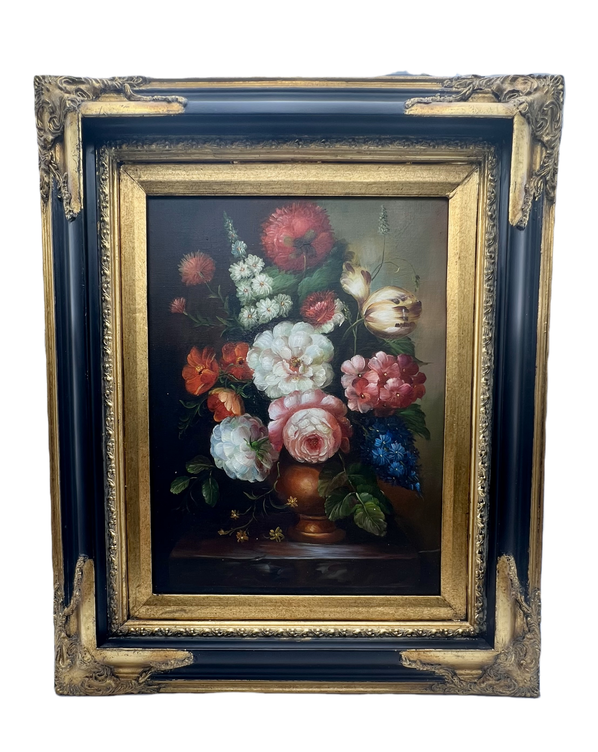 The painting is beautifully detailed, with vibrant colors and naturalistic shading that make the blooms appear almost lifelike. It is presented in a striking black and gilt ornate wooden frame, which enhances its antique charm and gives it a gallery-quality presence.