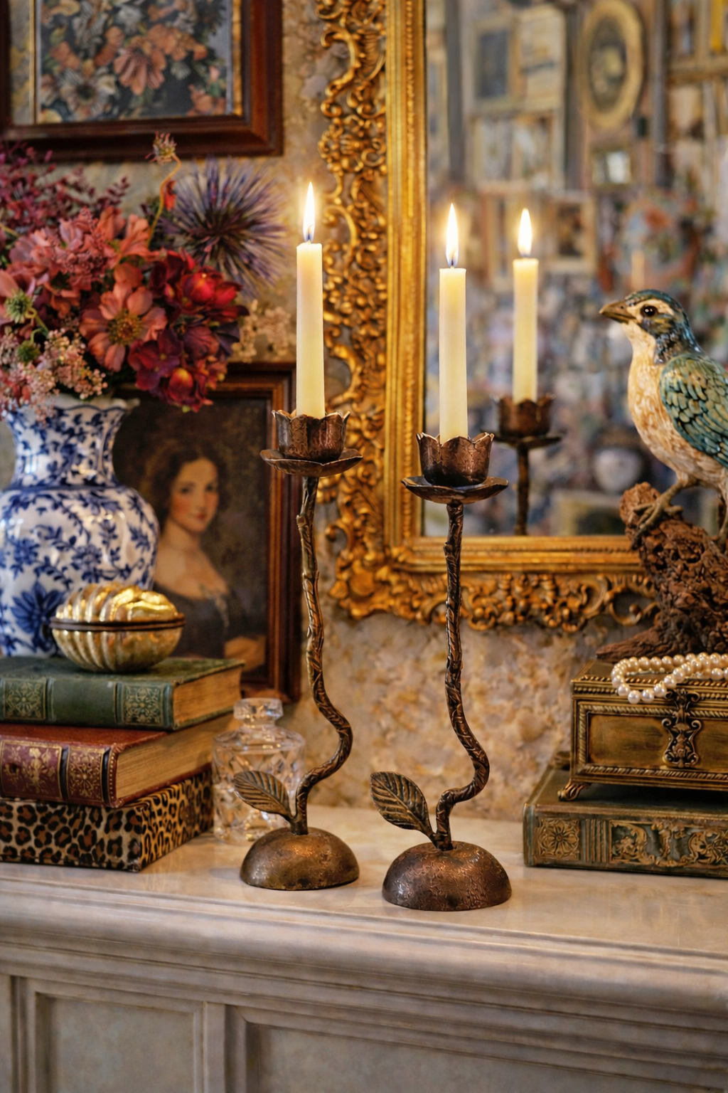 Sculptural vintage candlesticks featuring organic botanical stems with leaf detailing and floral bud candle cups.