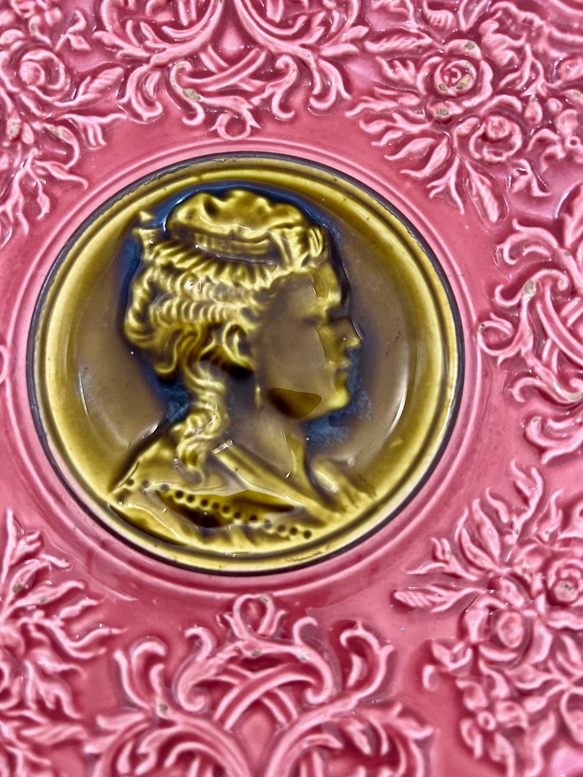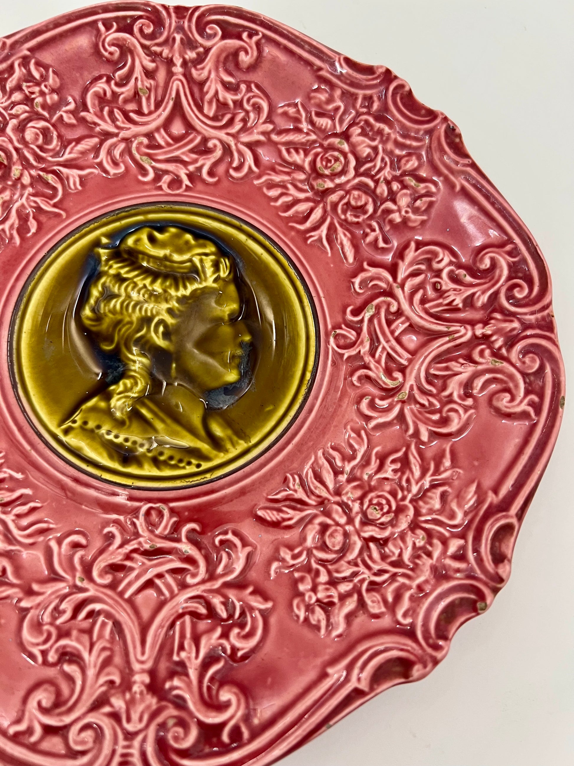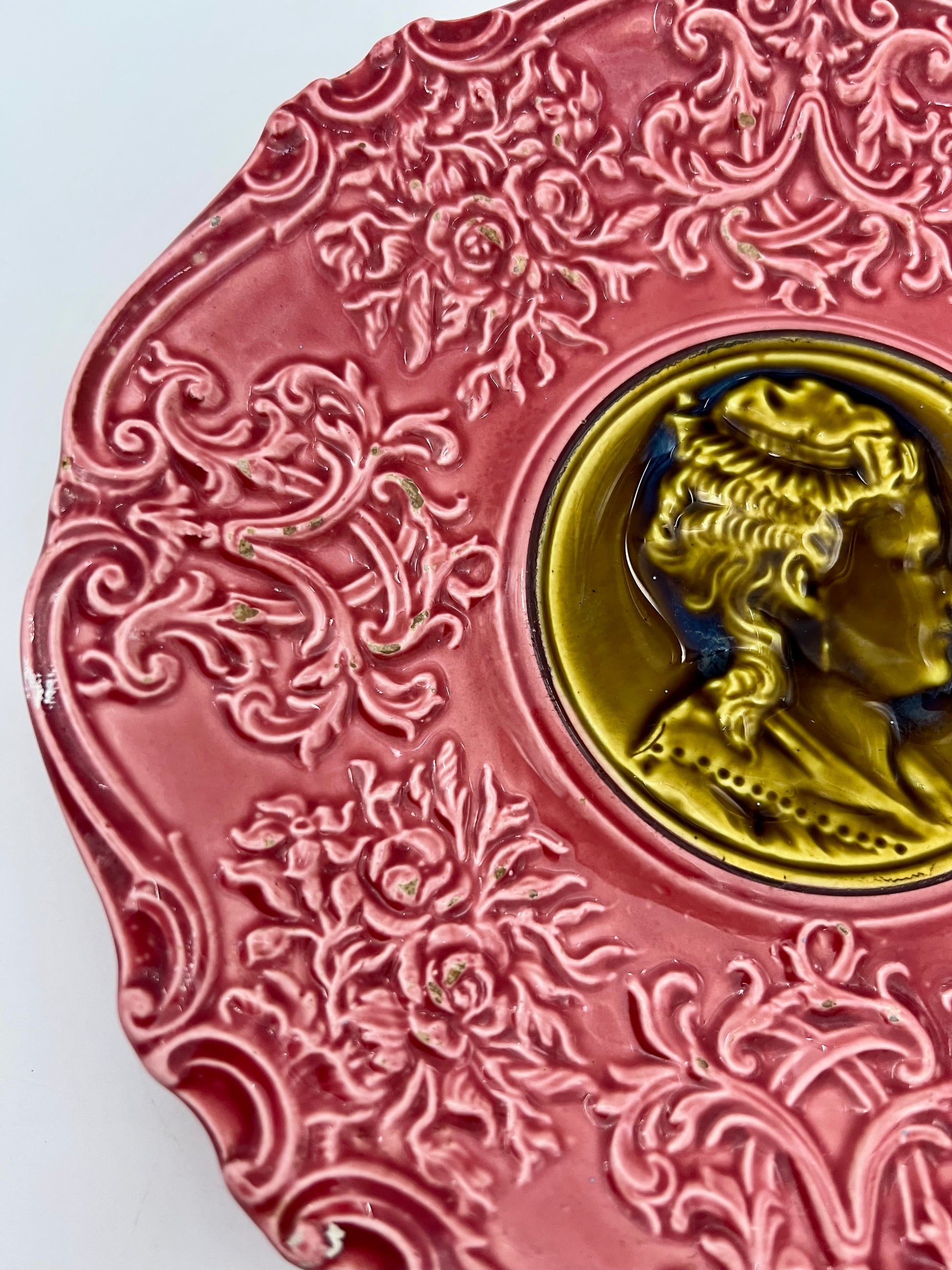 ANTIQUE VILLEROY & BOCH SCHRAMBERG MAJOLICA CAMEO PLATE – PINK WITH OLIVE PORTRAIT MEDALLION, CIRCA 1880s