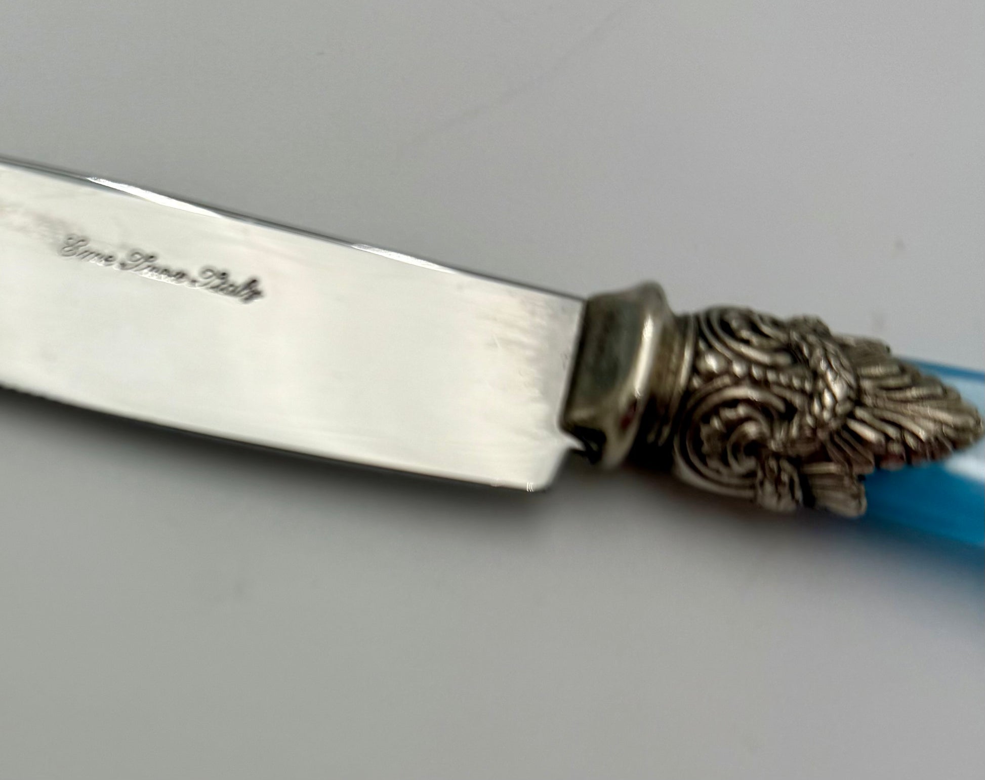 Material: Stainless steel with pearlescent blue acrylic handles and ornate silver-toned ferrules
