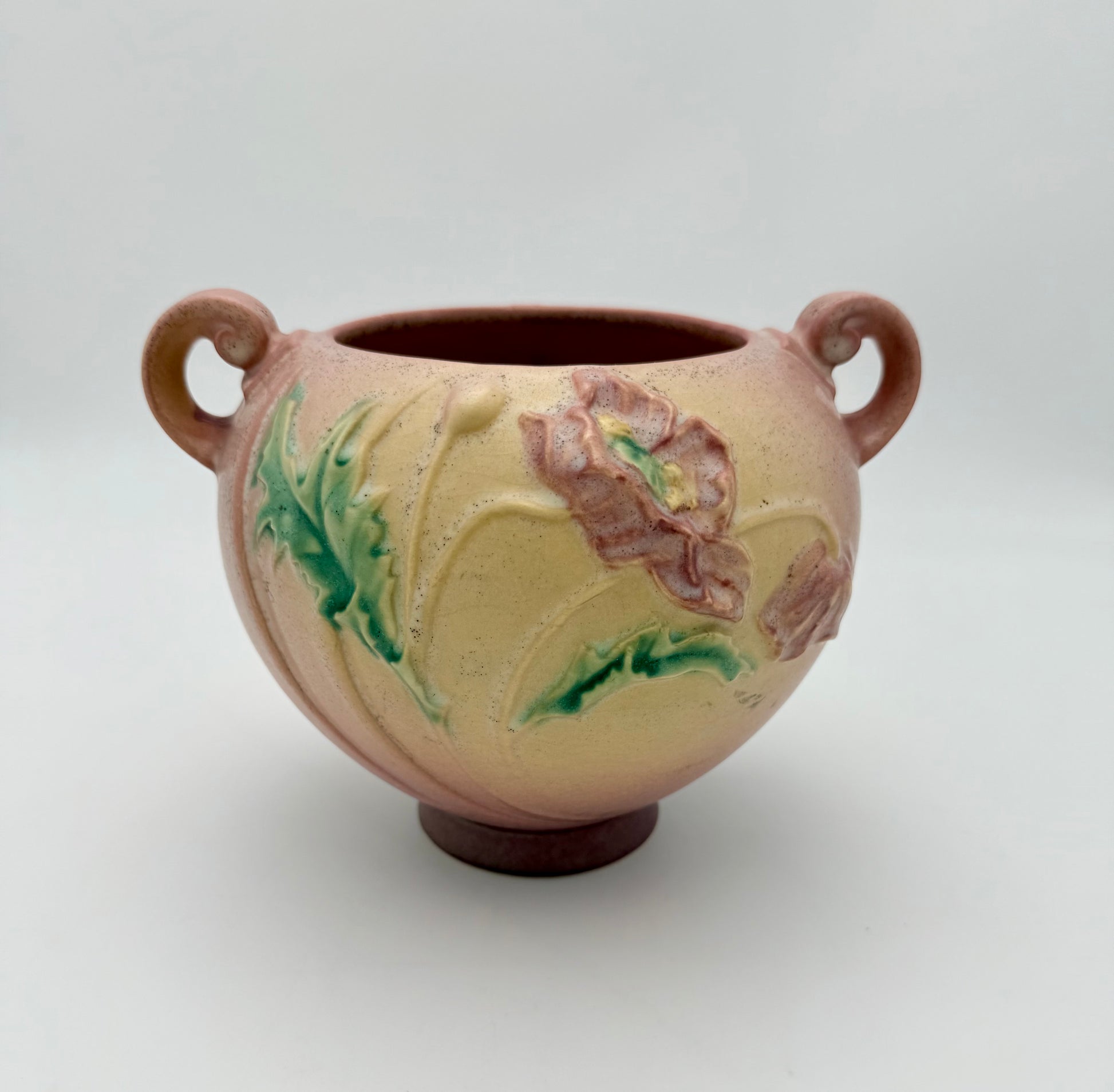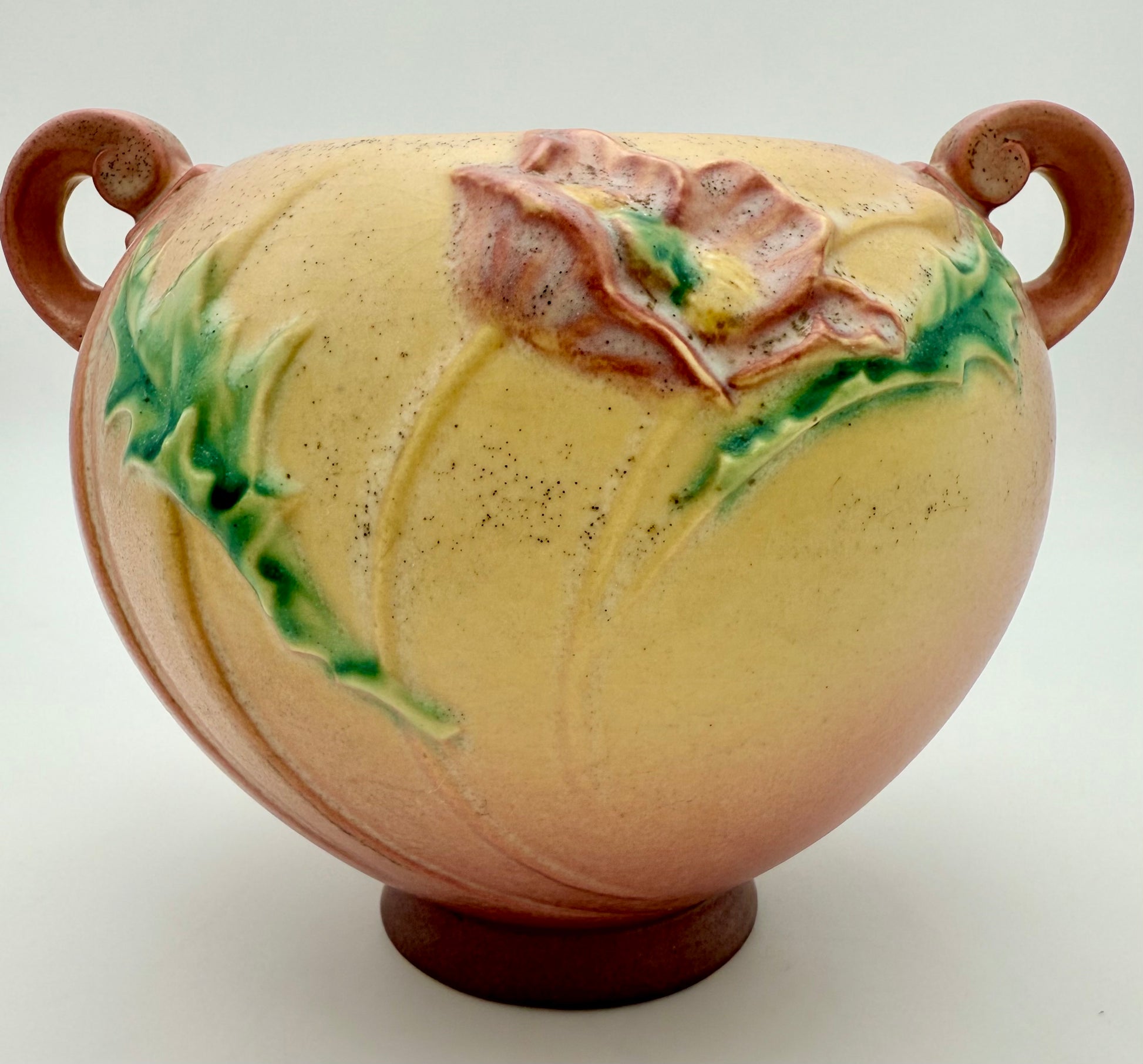 This piece features the desirable pink-to-buttercream shading with soft green leaves and a warm matte texture characteristic of the Poppy line introduced in 1935.