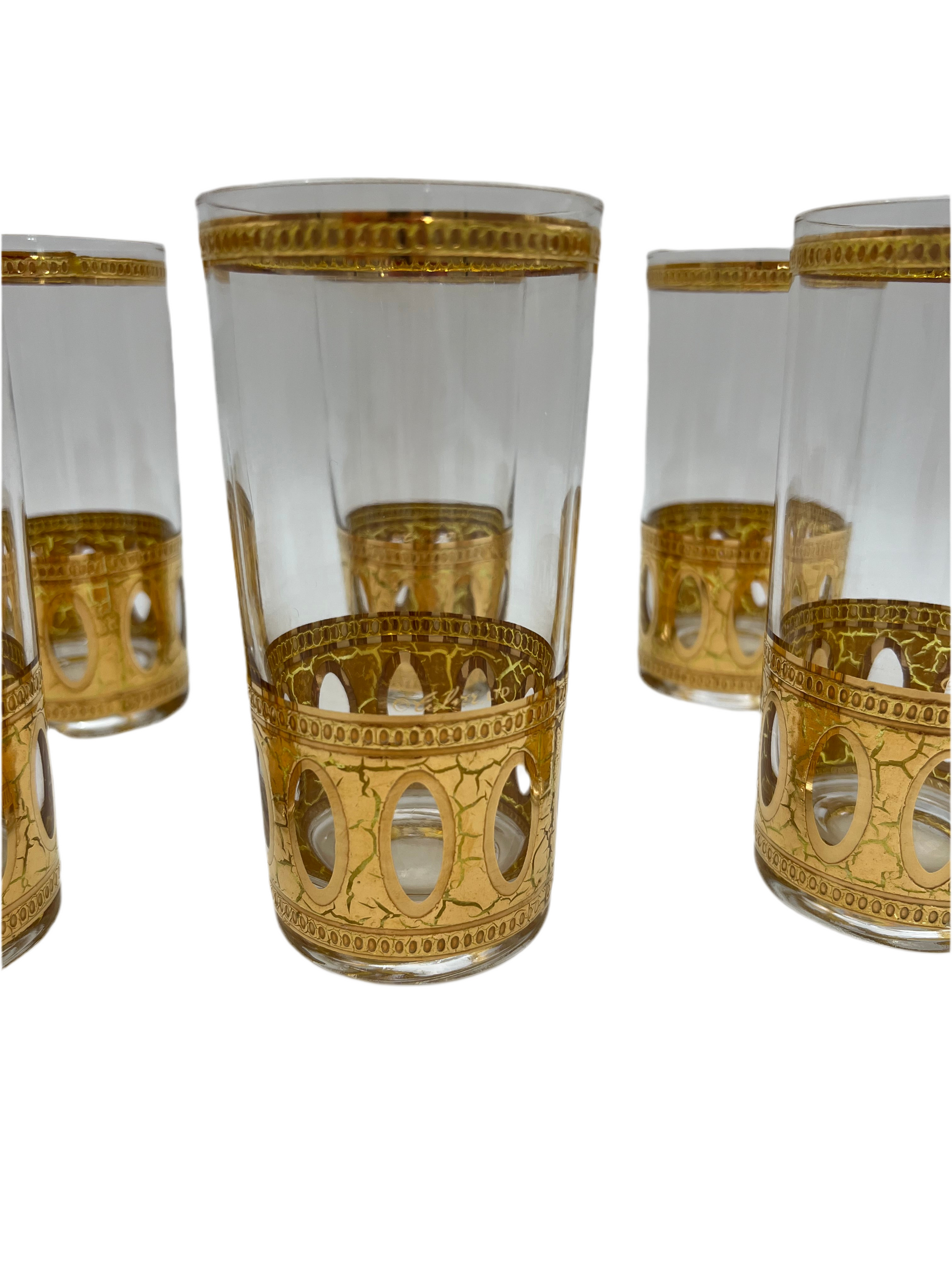 DETAILS • Maker: Culver, Ltd. • Pattern: Antigua (sometimes listed as “Antiqua”) • Era: 1960s Mid-Century Modern • Material: Clear glass with 22K gold overlay • Quantity: Set of 8 highball glasses • Dimensions: 5.5” H × 2.75” D • Weight (each): Approx. 9 oz • Condition: Excellent vintage condition — gold is vibrant with light, age-appropriate wear that adds authentic vintage charm. No chips or cracks.