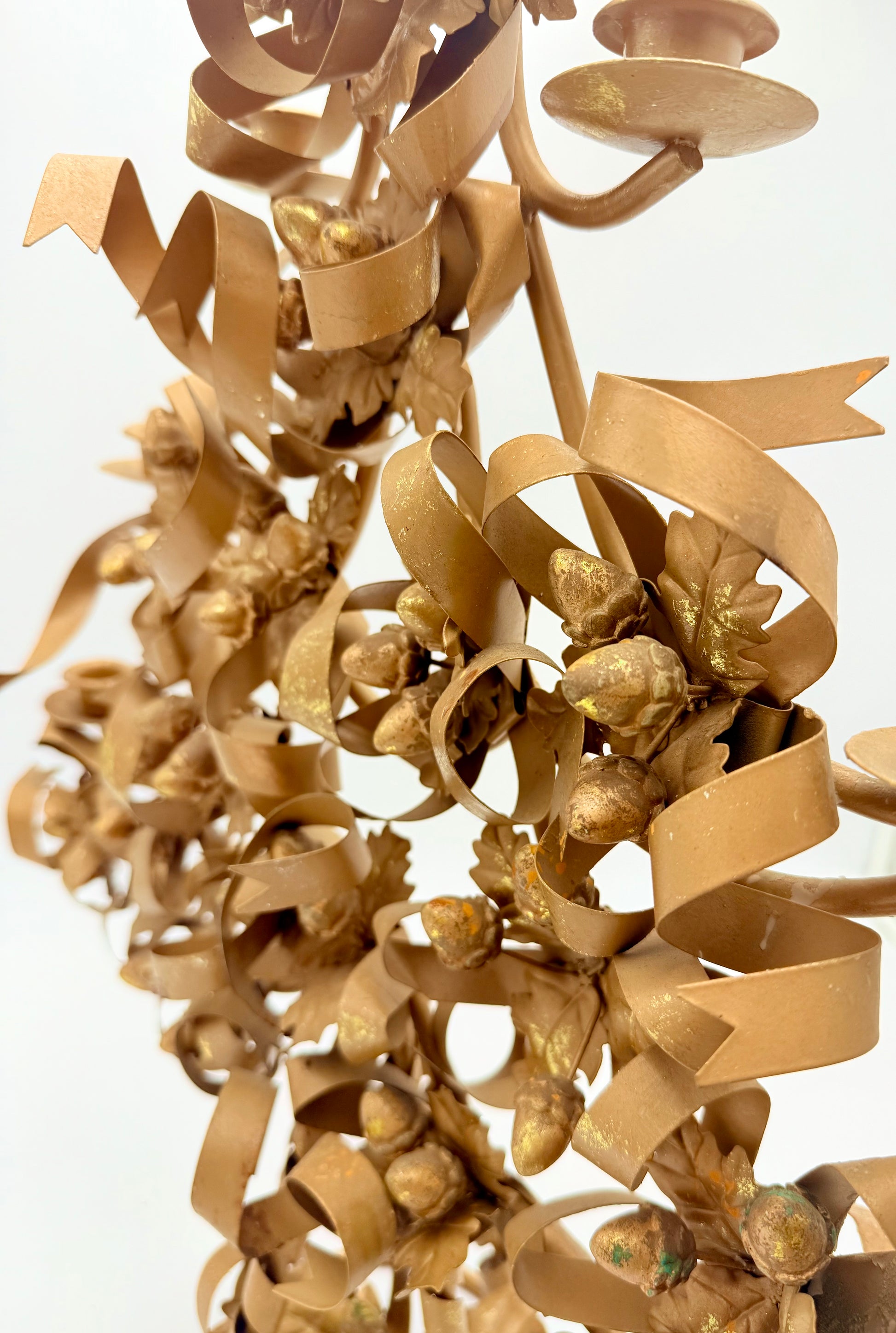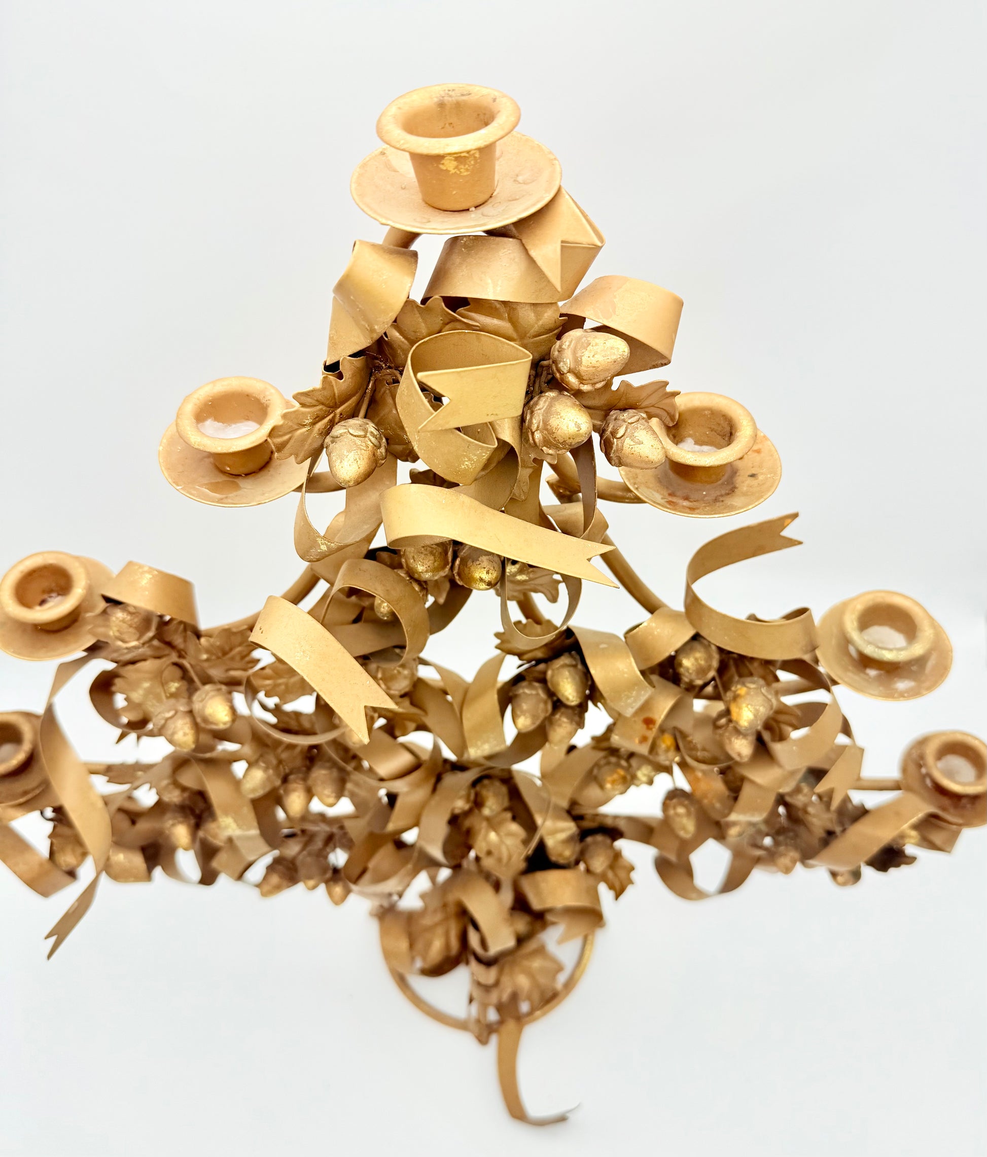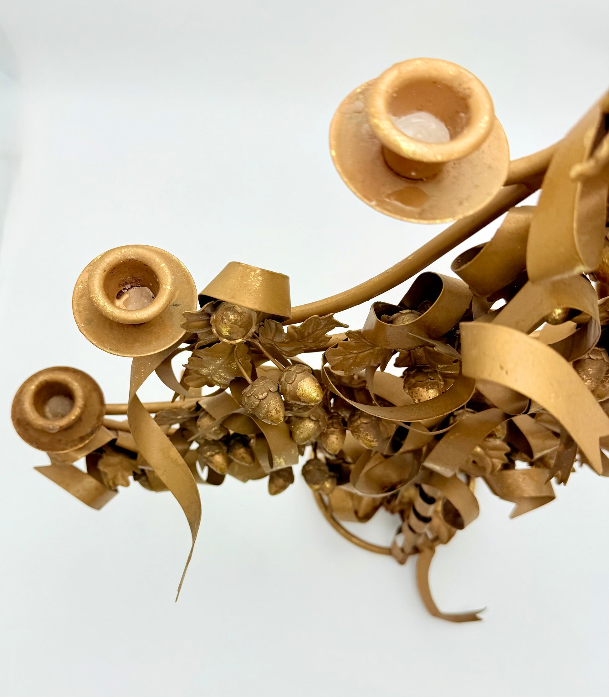 This spectacular vintage Italian gilt tole candelabra makes an unforgettable statement. Hand-crafted in Italy during the 1960s–1970s, it showcases flowing ribbons, oak leaves, and acorn clusters — all sculpted in metal and finished in shimmering gold.