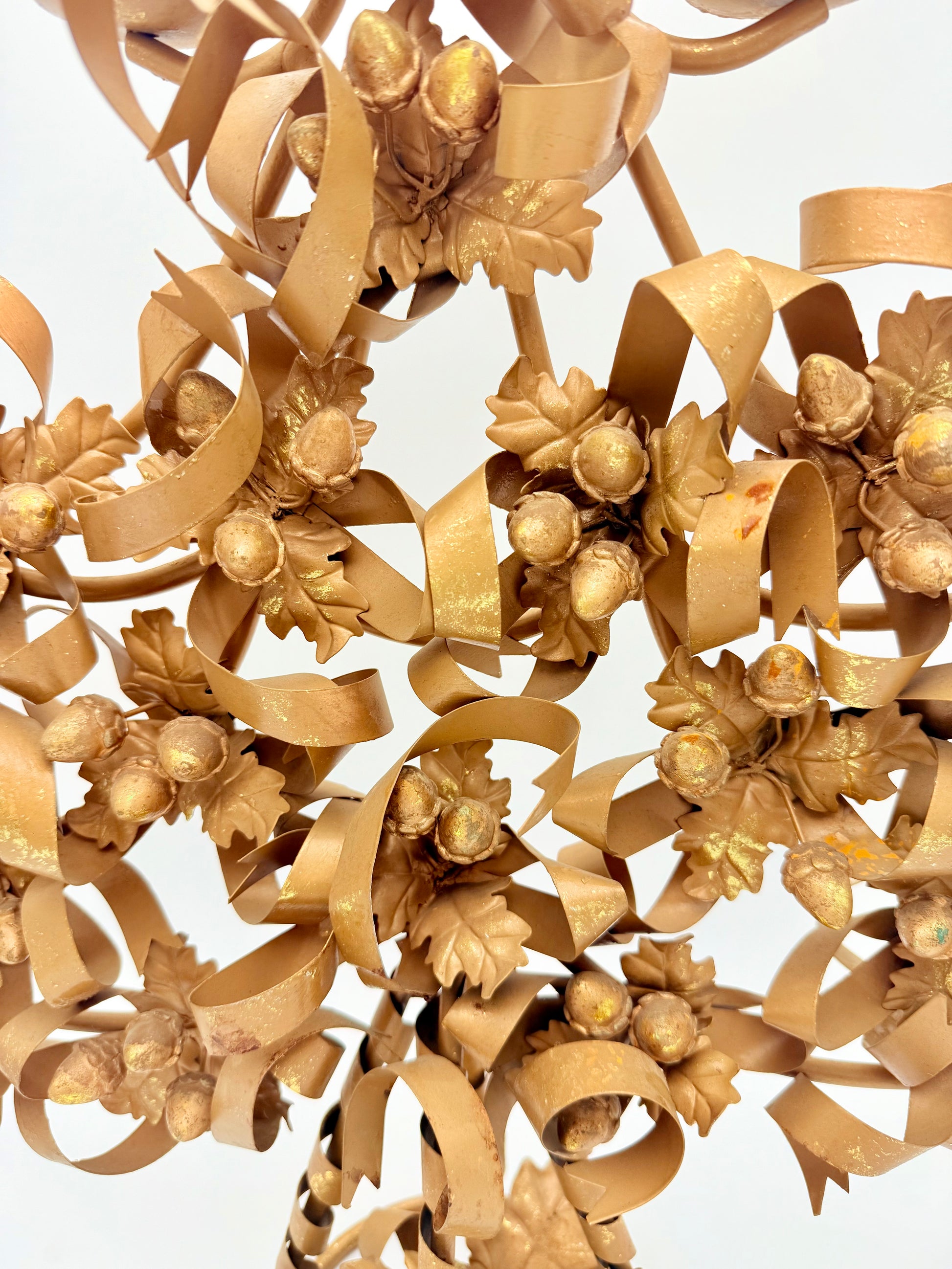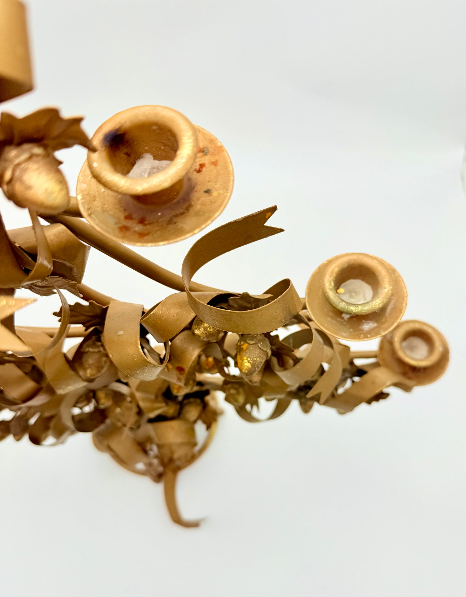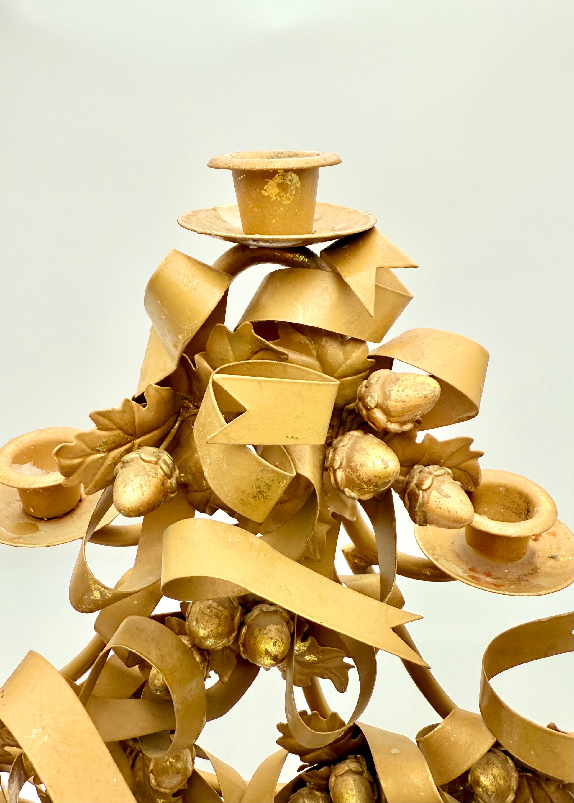 This spectacular vintage Italian gilt tole candelabra makes an unforgettable statement. Hand-crafted in Italy during the 1960s–1970s, it showcases flowing ribbons, oak leaves, and acorn clusters — all sculpted in metal and finished in shimmering gold.