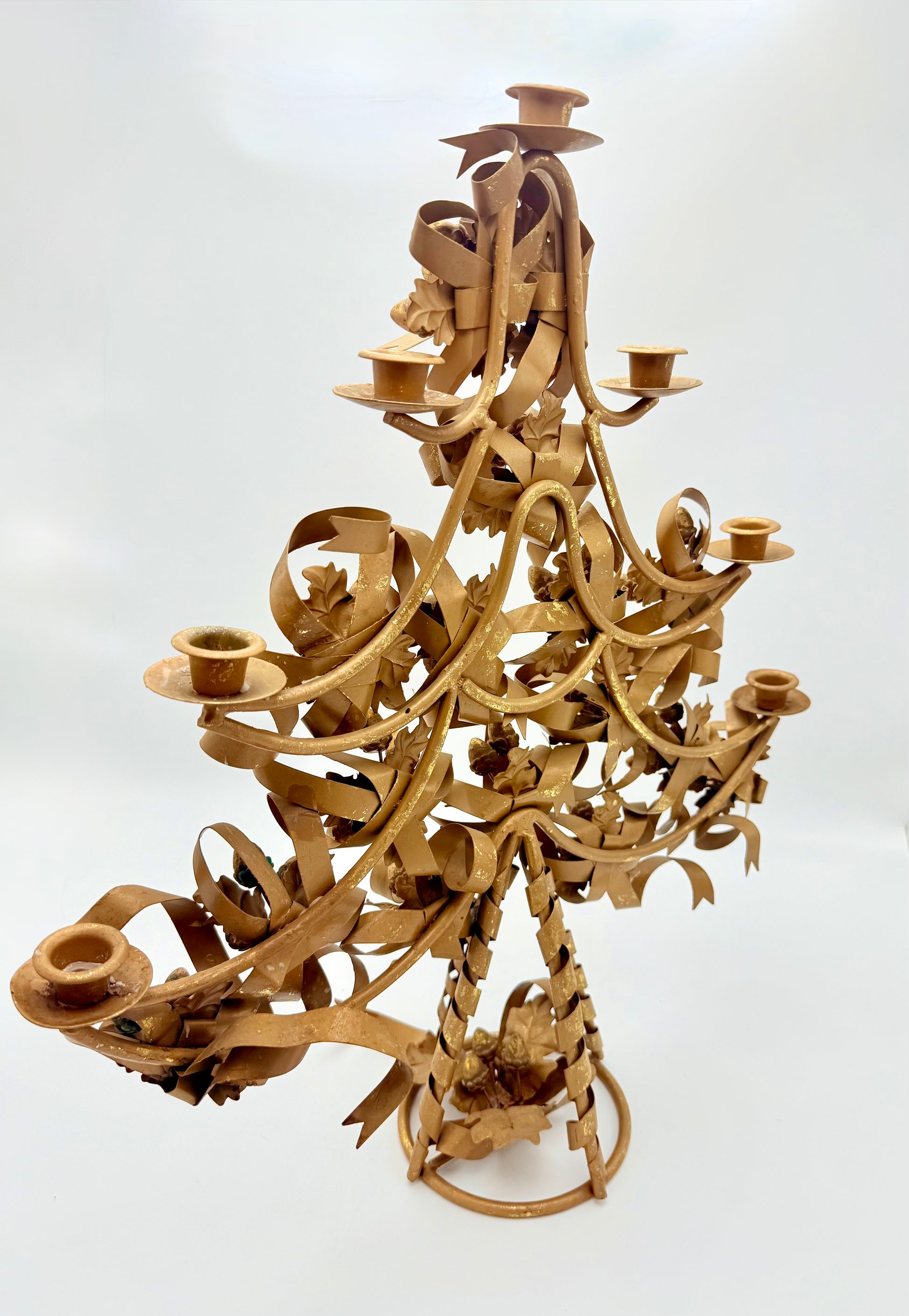 Formed like a stylized Christmas tree, this nine-light candelabra stands beautifully on a console, mantel, or dining table. Its intricate curling ribbons and layered gilt leaves capture the lavish charm of Hollywood Regency and the old-world craftsmanship of Florentine tole décor.