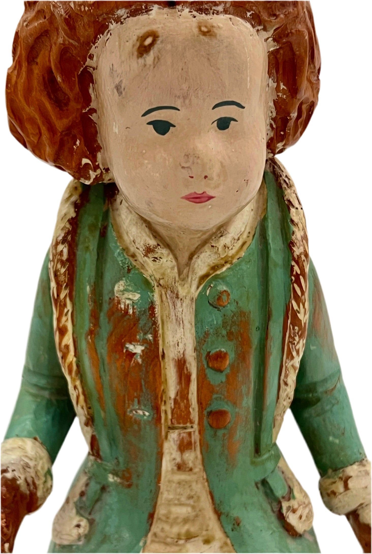 Indulge in the timeless beauty of this VINATGE ITALIAN DOLL WOOD SCULPTURE. Crafted by hand and painted with intricate detail, the rich wood and aged finish give it a sense of history and art. From the esteemed Sarreid Ltd. in Italy, this piece is a soft mint green color.  The figure would be an eclectic decor piece in any room!