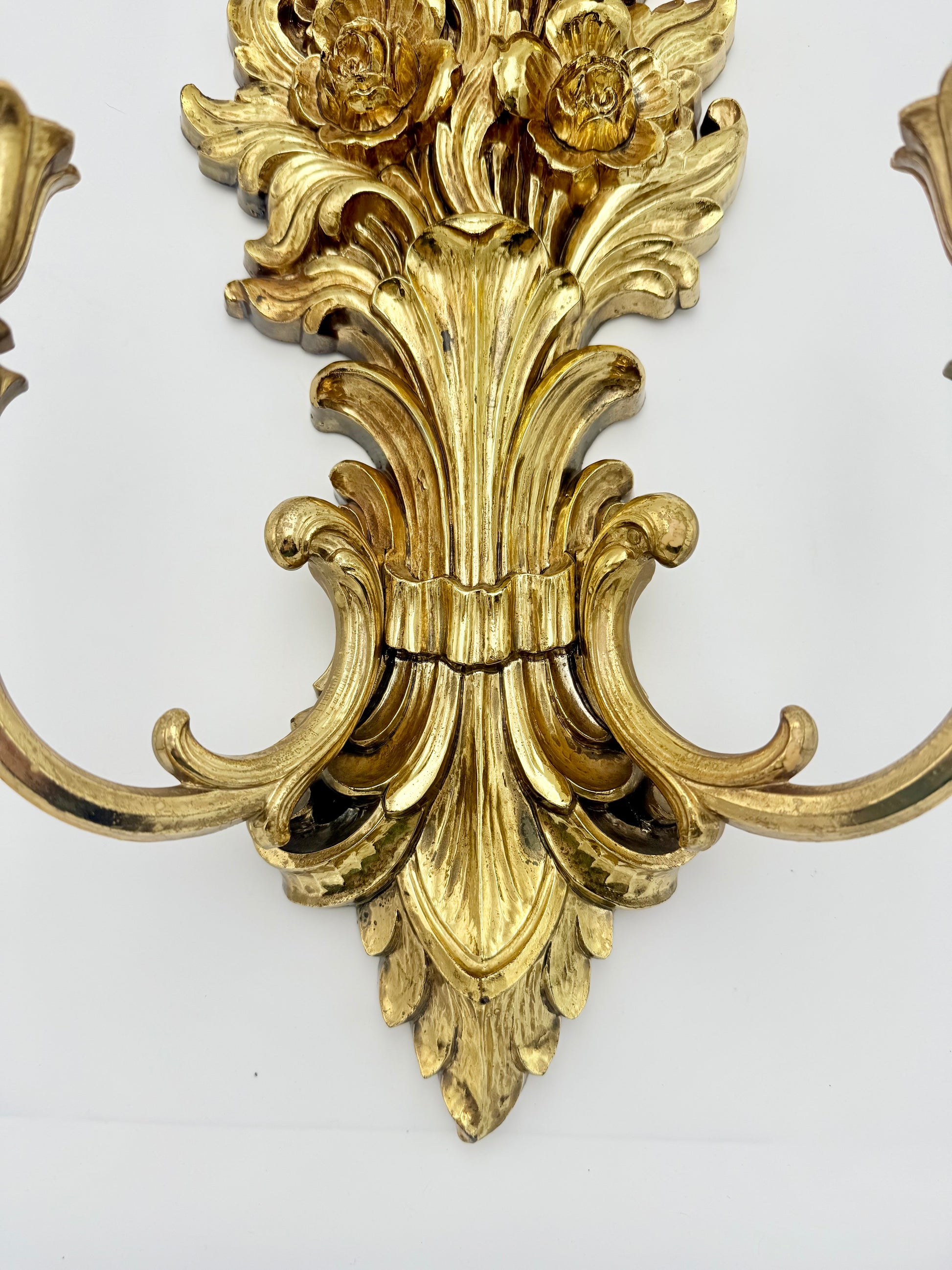 This stunning vintage 1973 Syroco wall sconce captures the lavish elegance of Hollywood Regency décor. Featuring a dramatic arrangement of sculpted flowers and scrolling acanthus leaves in rich antique gold, this two-arm candle sconce brings instant glamour to any wall.