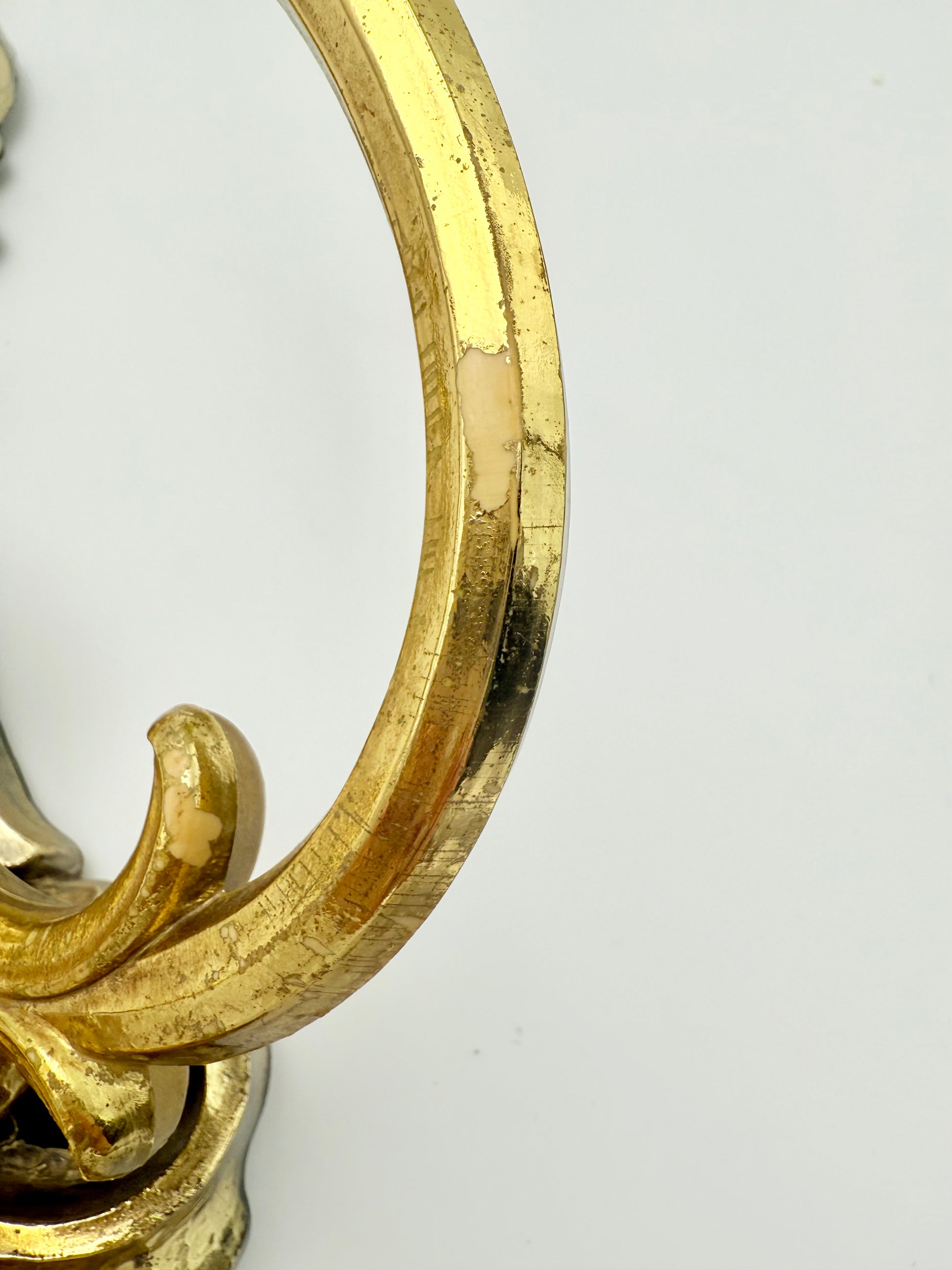 Good vintage condition with light wear from age. Some small areas of finish loss and minor scuffs on the gilt surface (see close-up photo). Candle arms are secure and stable. Displays beautifully and ready to hang.