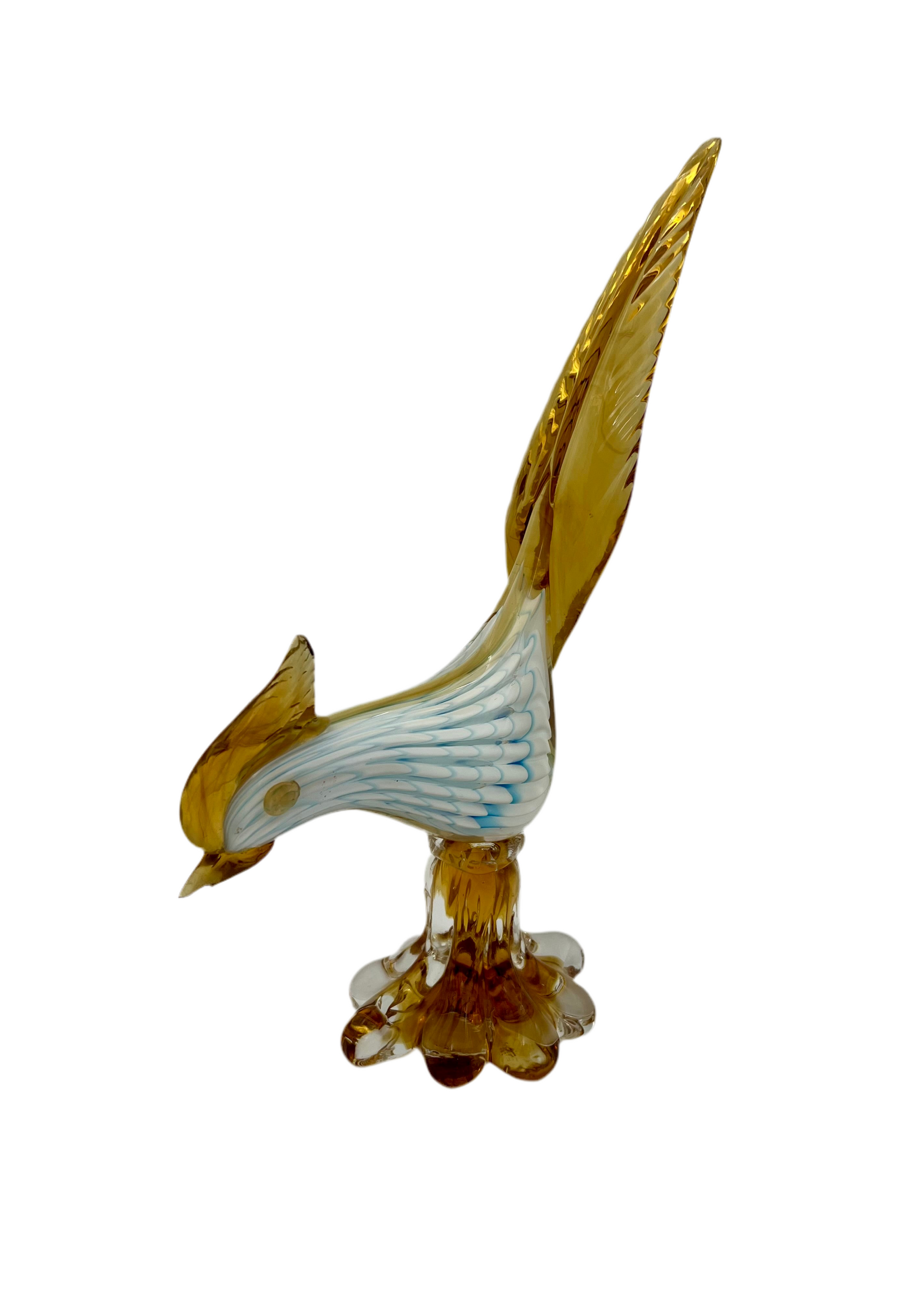 This elegant vintage art glass bird sculpture is a striking example of hand-blown studio glass craftsmanship. The form features a dramatically elongated, hand-pulled amber tail, an opalescent white body with delicately combed pale blue feathering, and a sculptural, flower-form base with rich amber glass pooling and clear lobed accents.