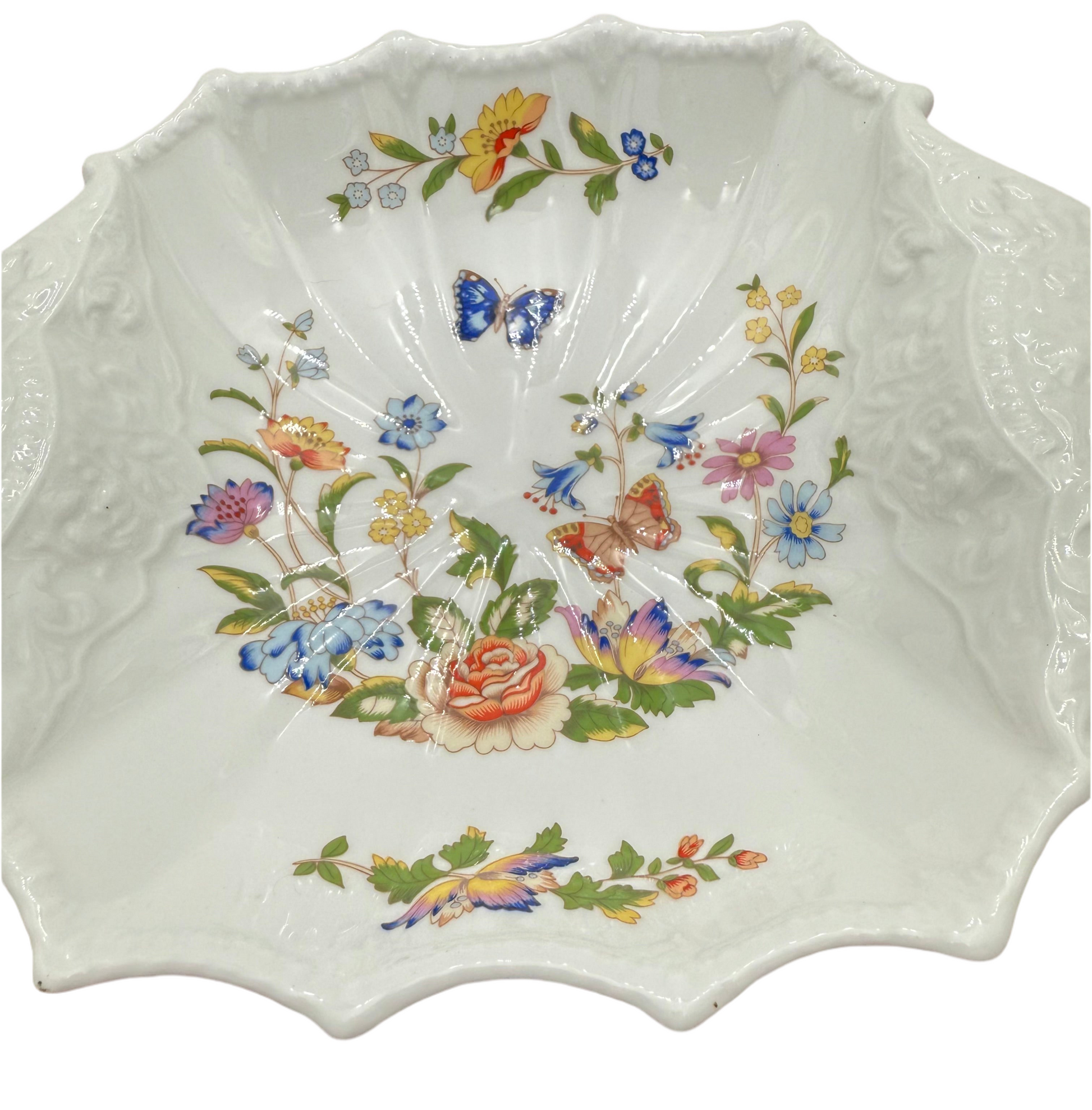 This vintage Ansley Cottage Garden scalloped shell dish, dating to circa 1970s–1980s, is a beautifully detailed example of fine English bone china. The piece features a romantic English garden scene with hand-applied florals and butterflies, framed by an elegant scalloped shell form with raised molded relief along the rim.
