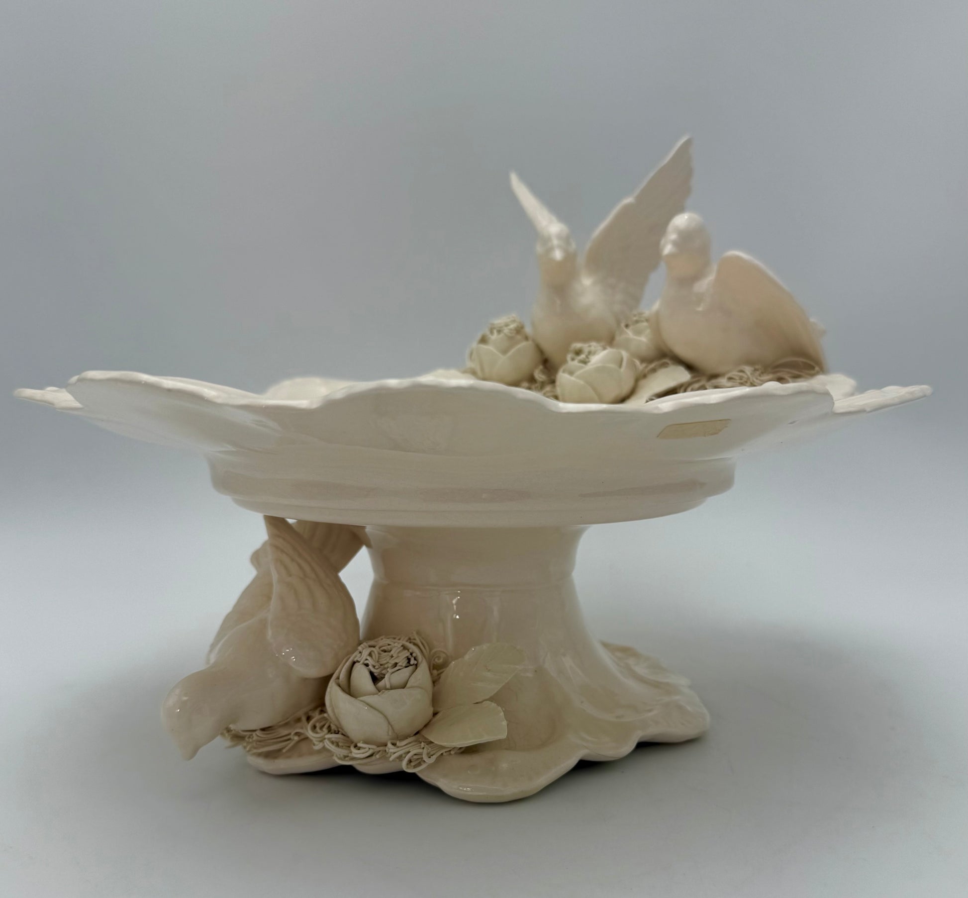 Bring a touch of European romance to your décor with this exquisite vintage Capodimonte-style porcelain centerpiece. This sculptural pedestal dish features three beautifully hand-formed doves, surrounded by intricate spaghetti-porcelain nests and highly detailed roses and leaves. Each element is individually applied by hand, showcasing the artistry and craftsmanship characteristic of mid-century Neapolitan porcelain workshops.