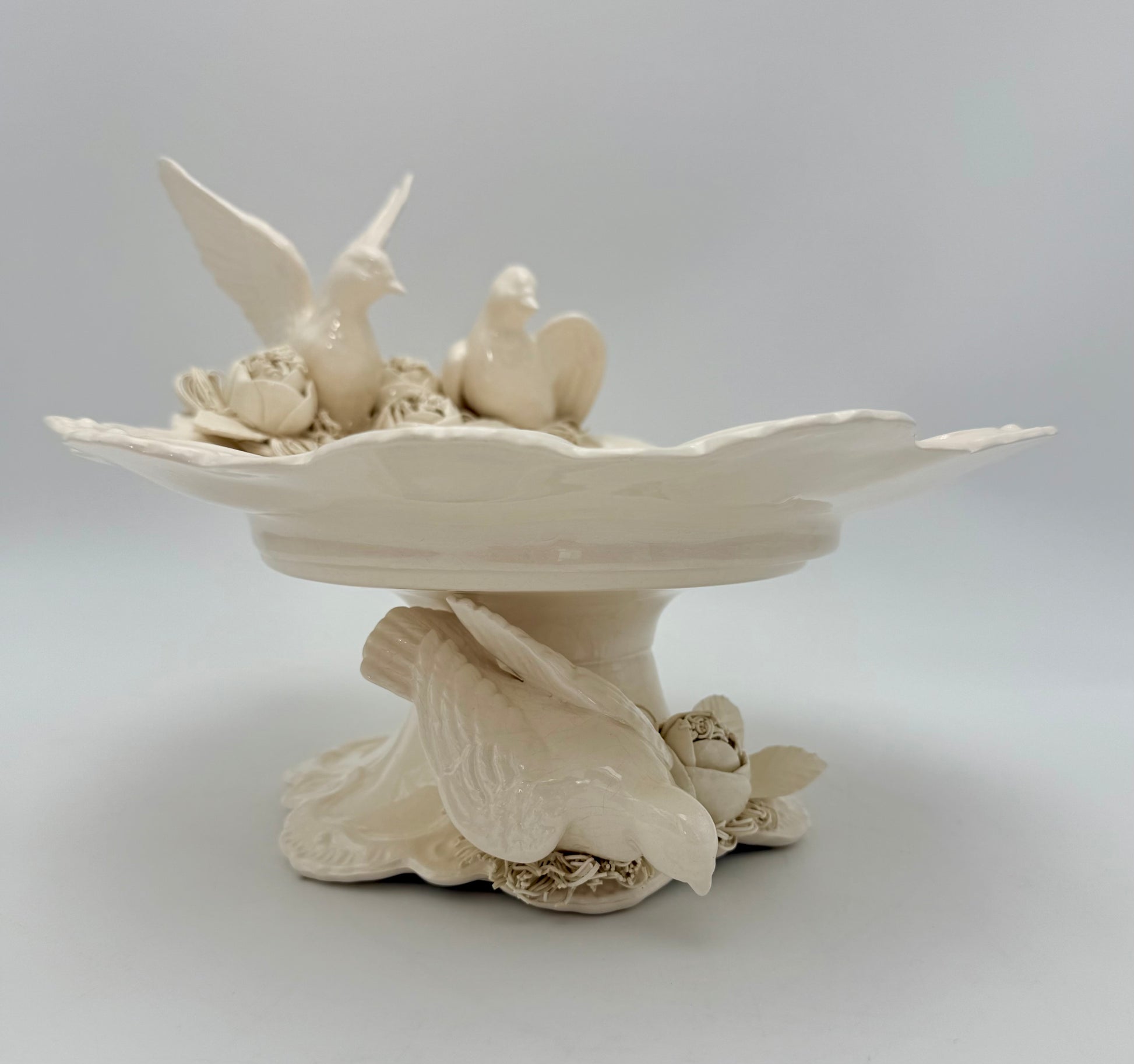 The scalloped dish sits on a raised pedestal adorned with coordinating florals and an additional applied dove, creating a full 360° display piece. Finished in a soft ivory glaze, this piece blends effortlessly into elegant, cottage, shabby chic, French country, and Eclectic Whimsy interiors.
