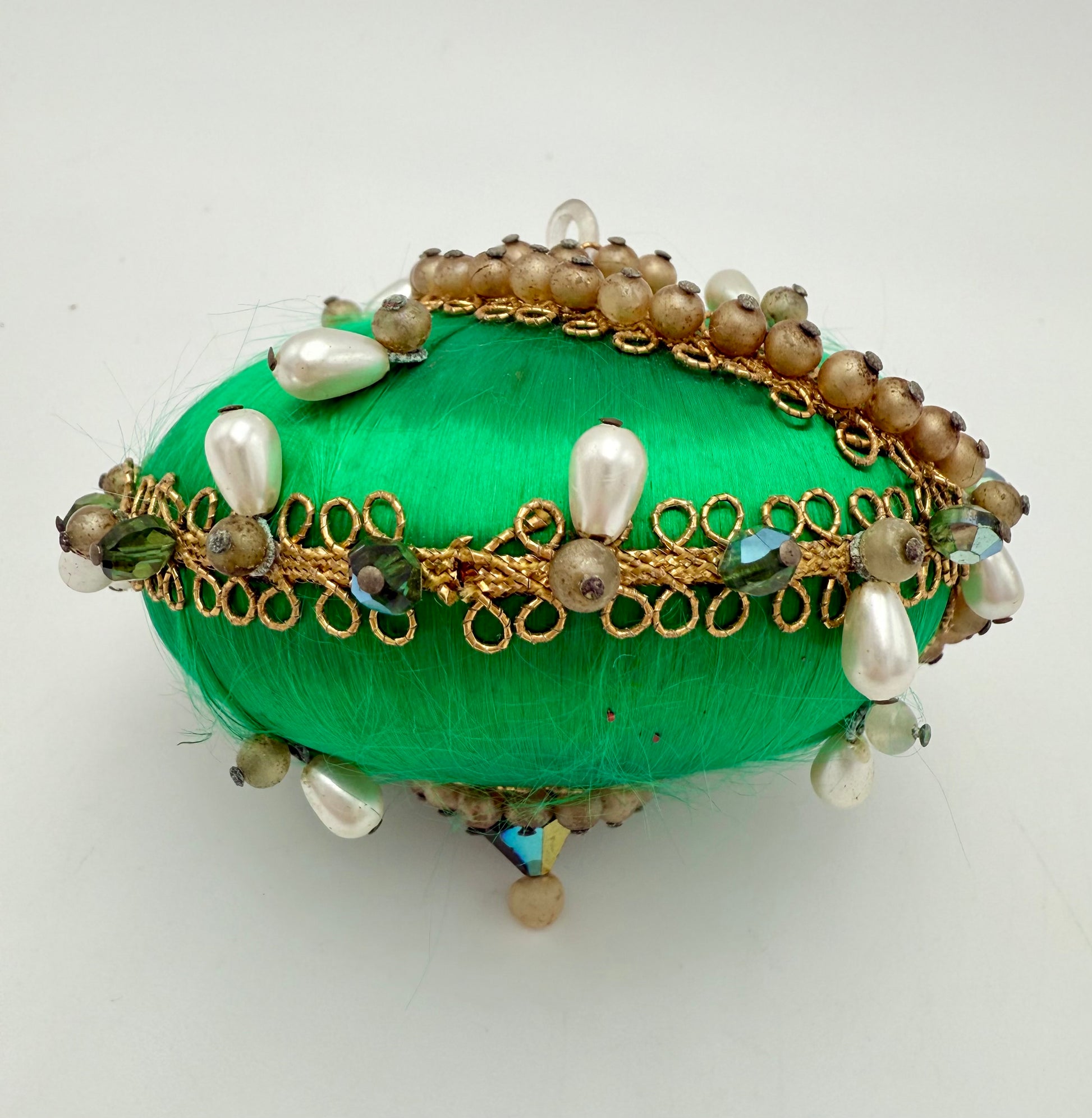 This stunning vintage ornament captures the glamorous sparkle of mid-century holiday décor. Wrapped in vivid emerald green satin thread and embellished with shimmering gold trim, faux pearls, and faceted green crystals, it’s a true retro treasure. The swirling beaded design gives it a whimsical, almost regal charm — perfect for adding a bold, Eclectic Whimsy touch to your holiday tree or display.