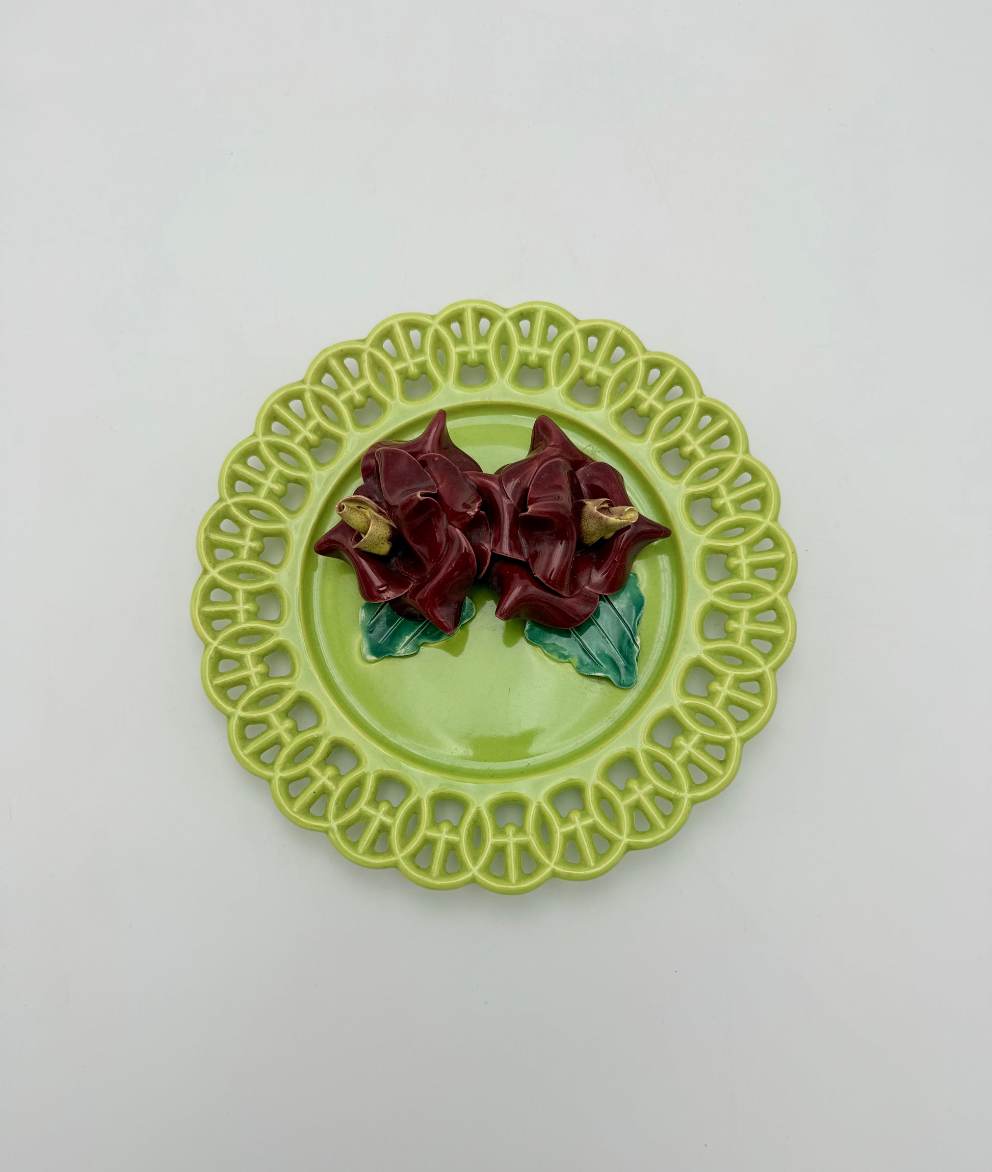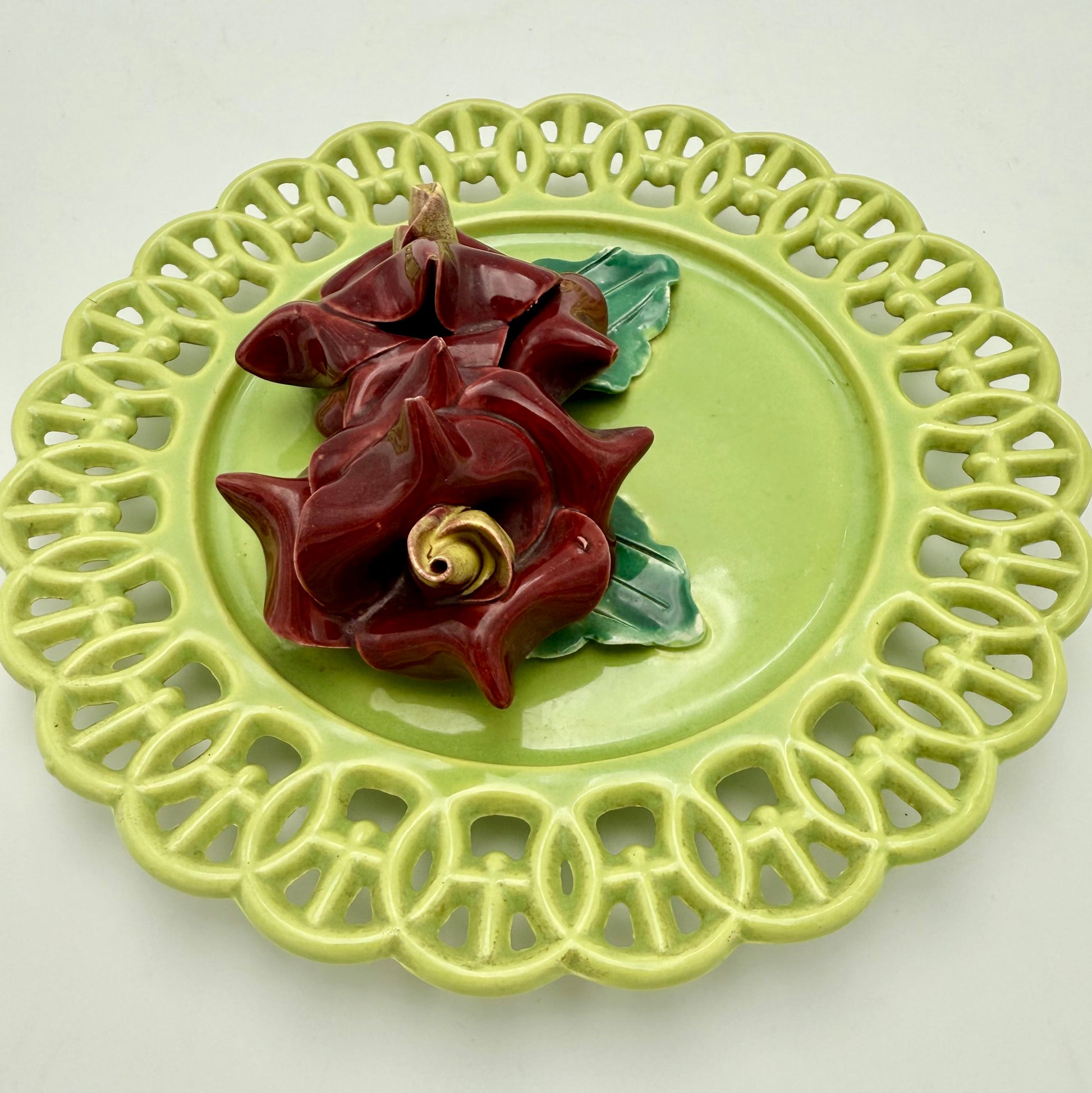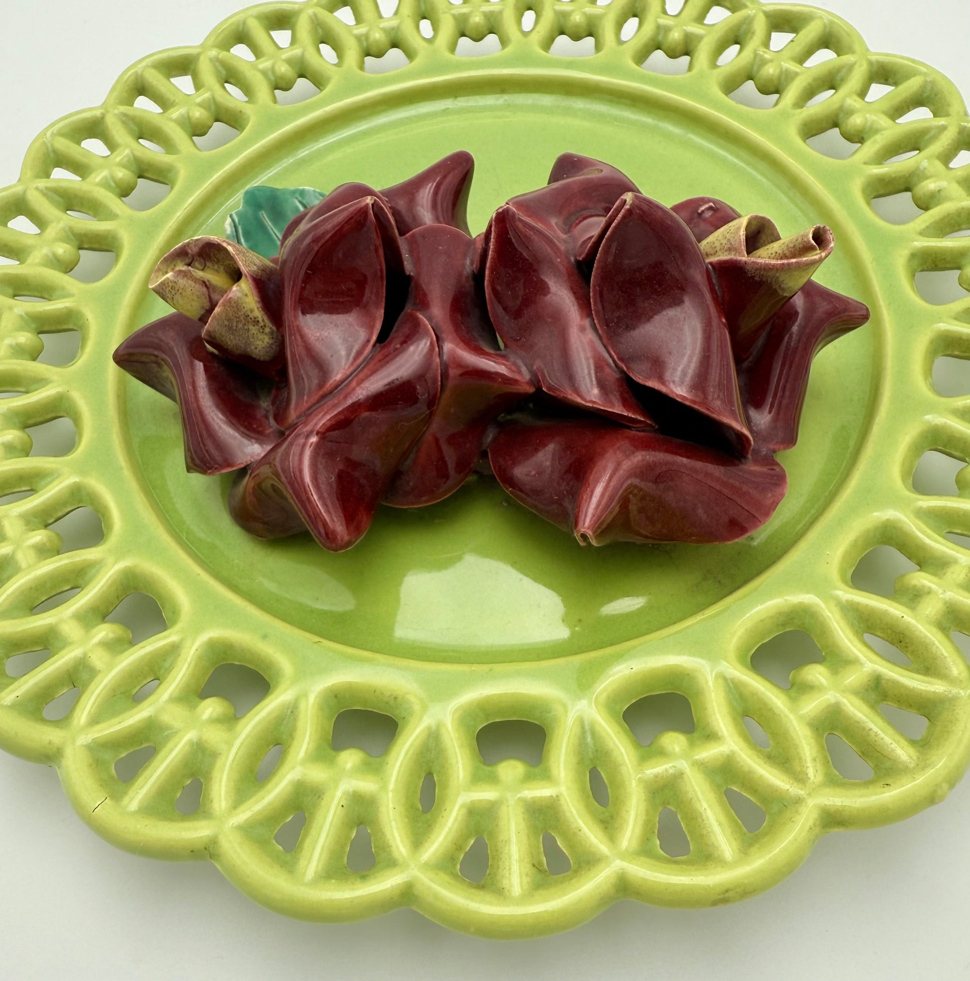 Beautiful mid-century Italian ceramic wall plaque featuring deep burgundy hand-sculpted flowers with green leaves, set on a glossy chartreuse reticulated plate. The applied florals show the classic Capodimonte-style folds and sculptural detail, giving this piece a rich dimensional look perfect for vintage décor lovers.
