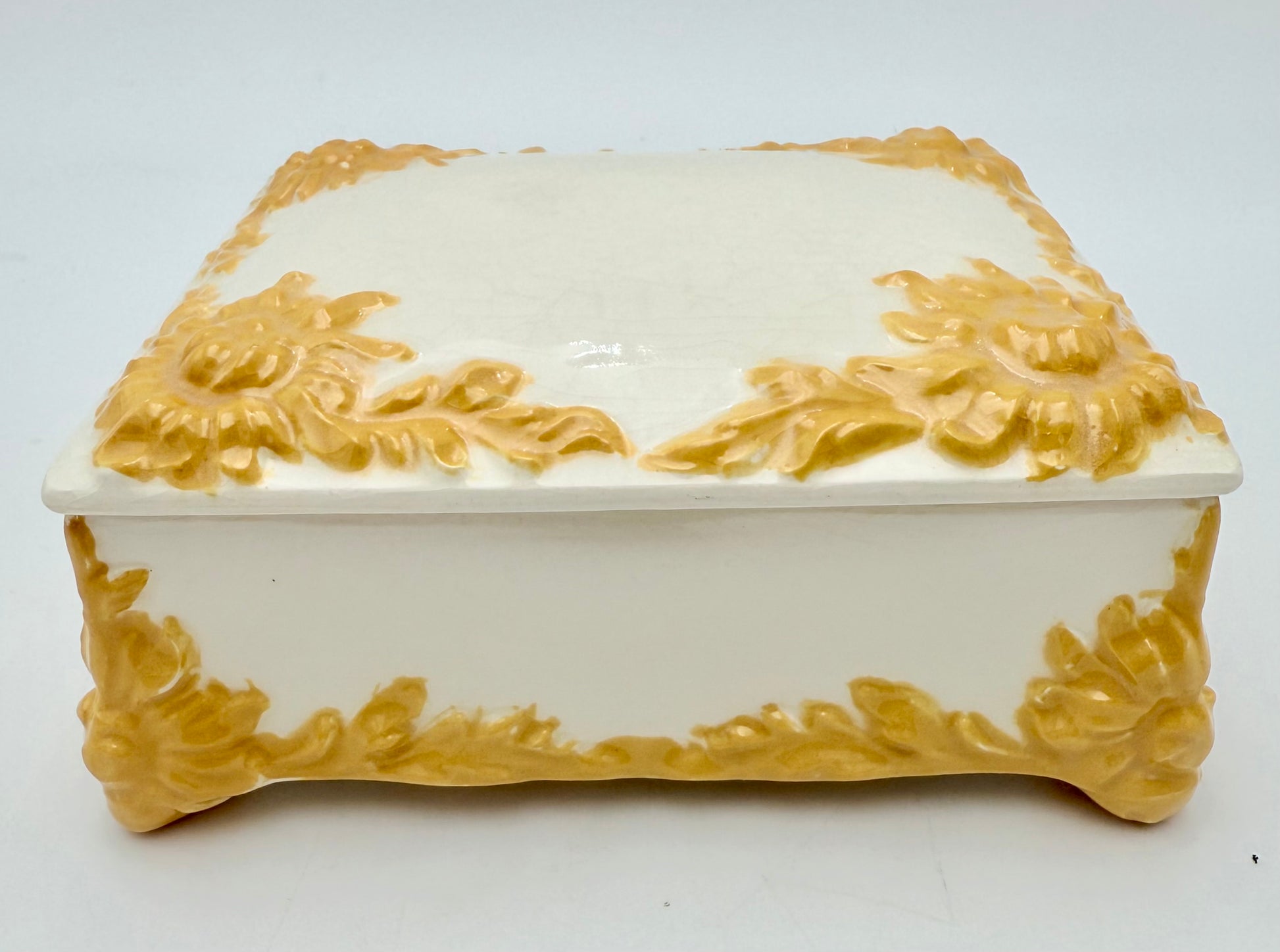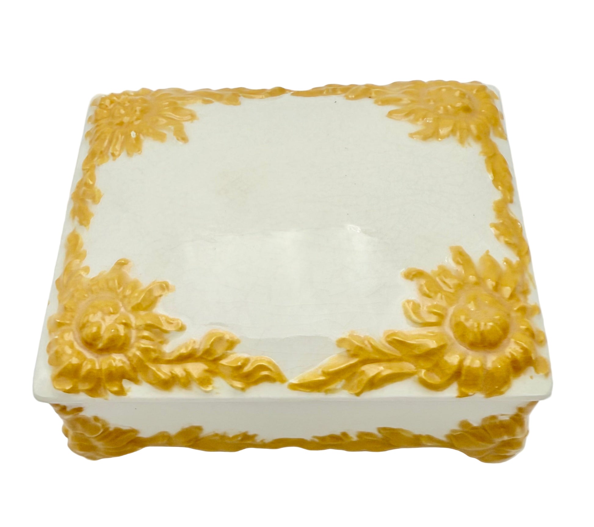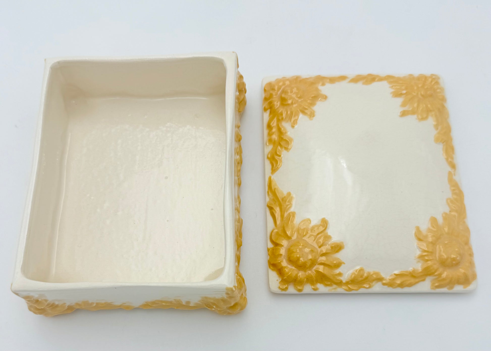 Add a touch of warm European charm to your vanity or dresser with this beautiful vintage ceramic trinket box. Crafted in the mid-century Italian style, the piece features raised sunflower and leaf relief in a rich honey–ochre glaze, set against a creamy ivory crackle-glazed body.