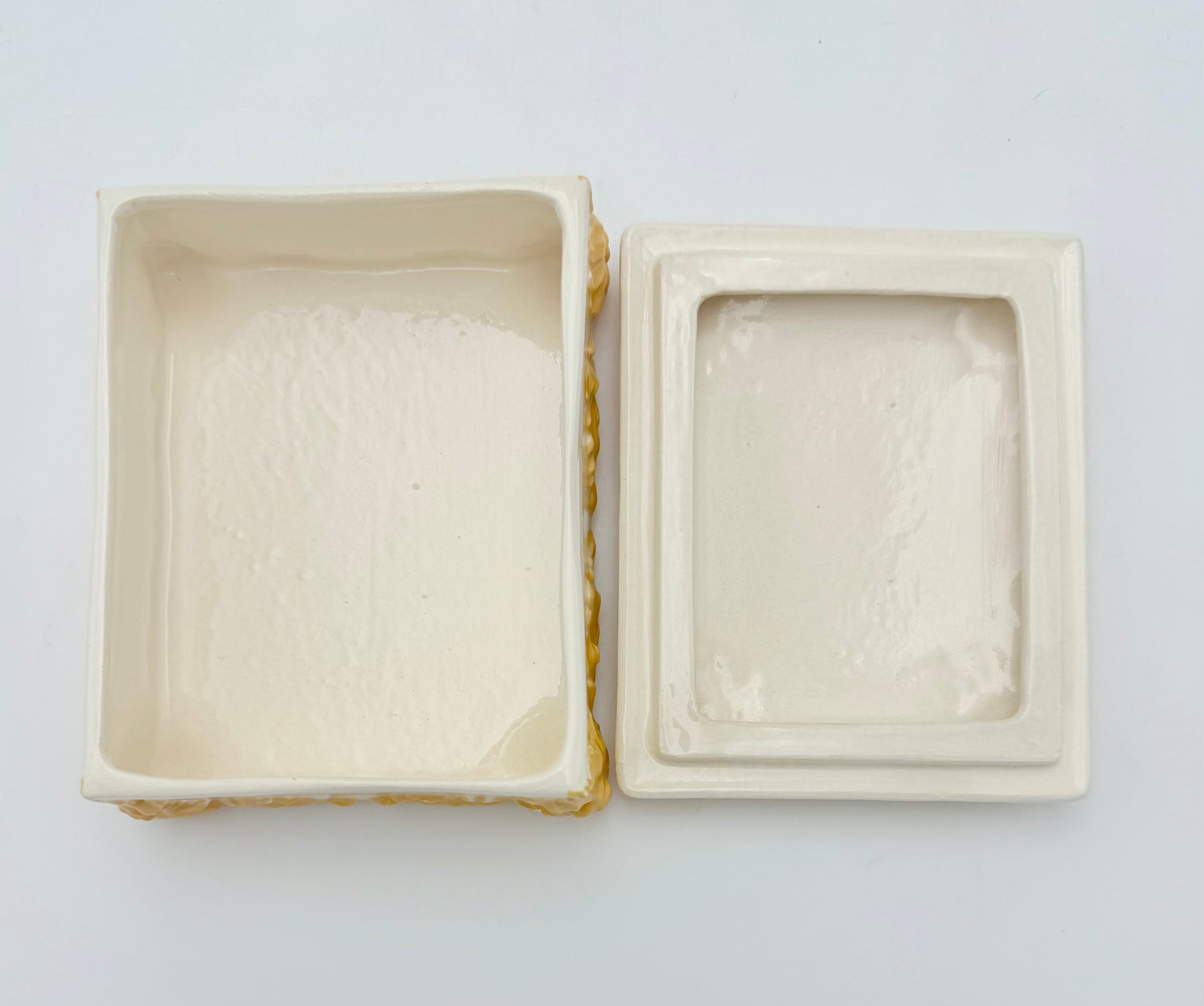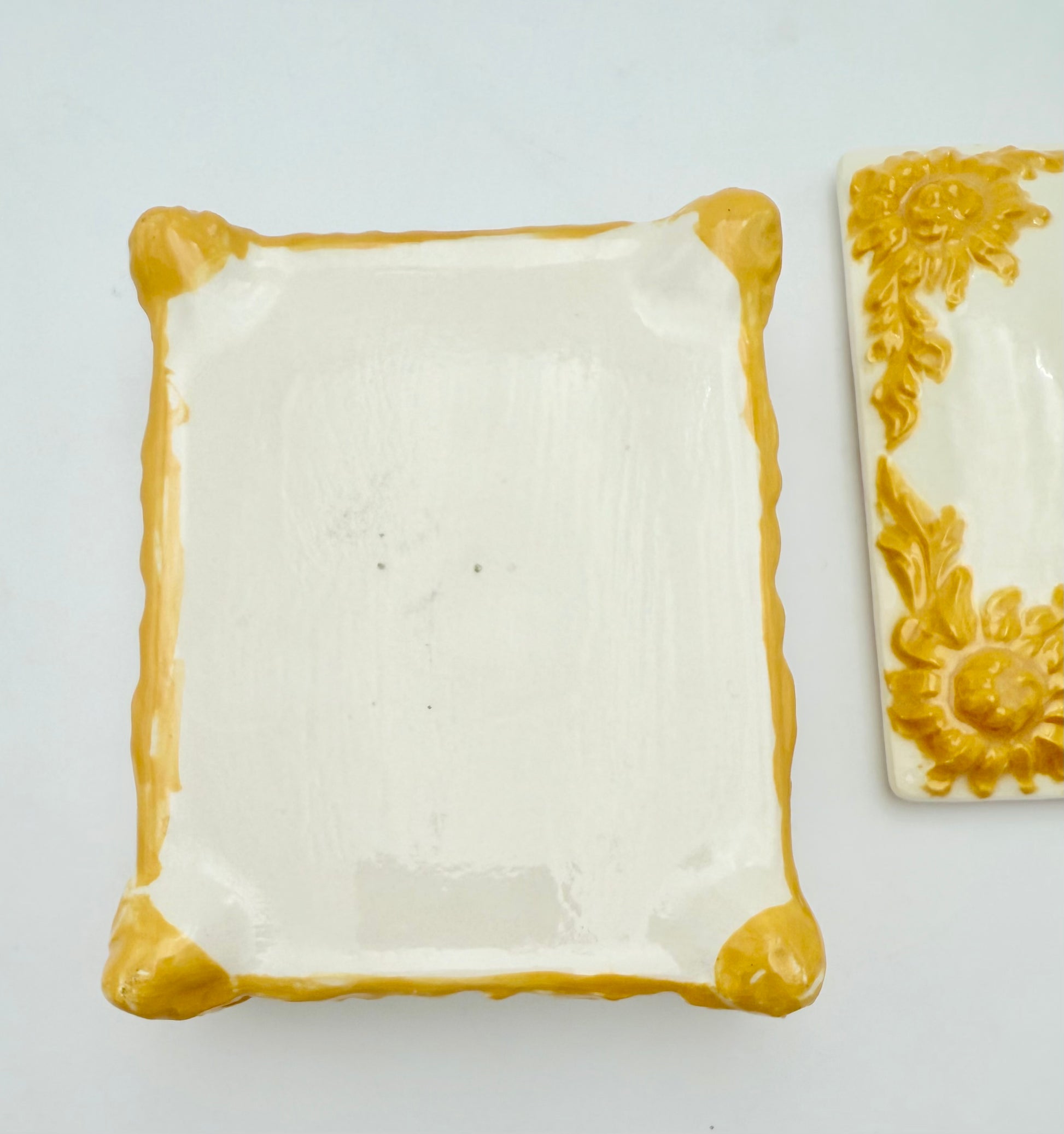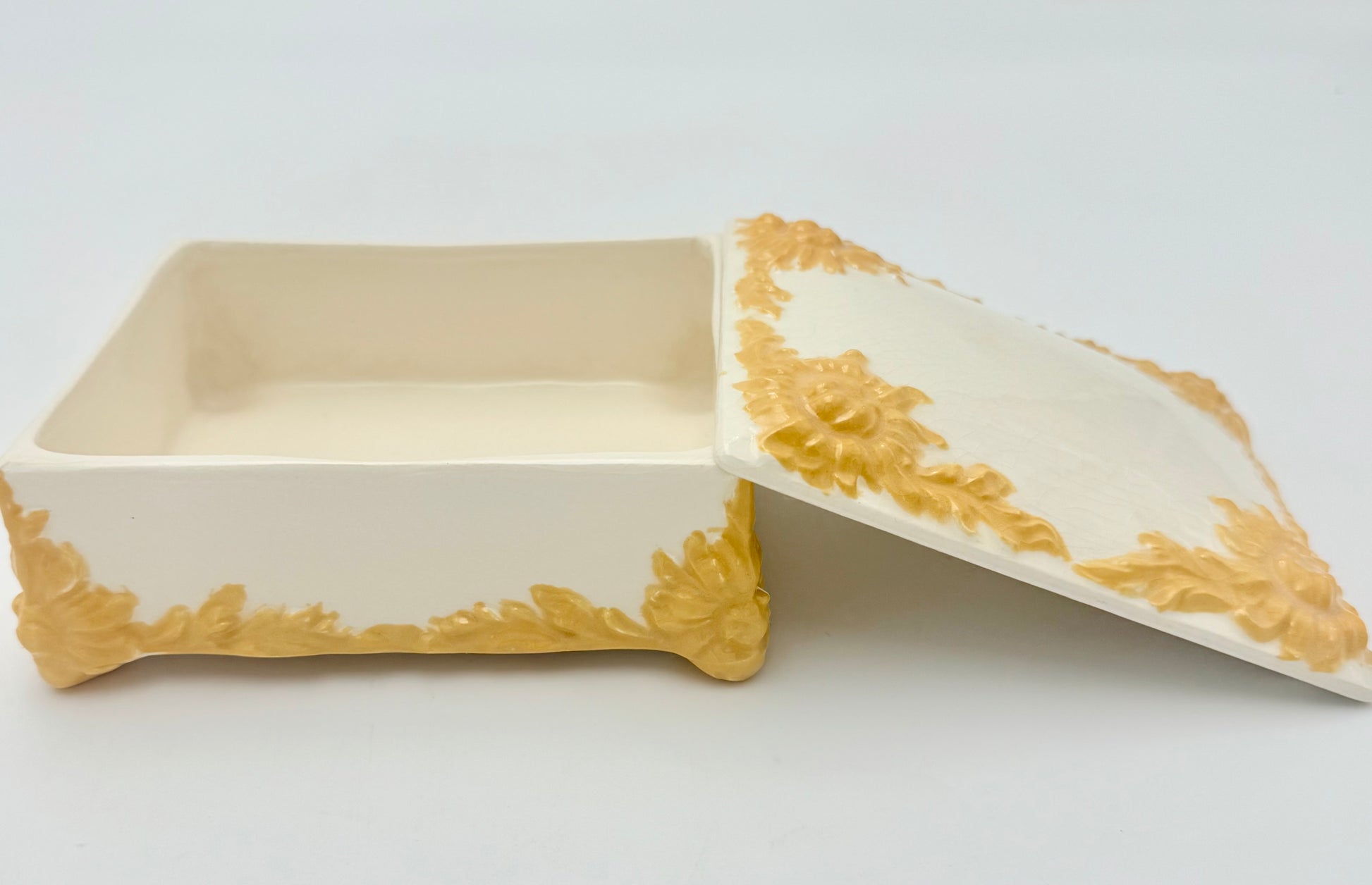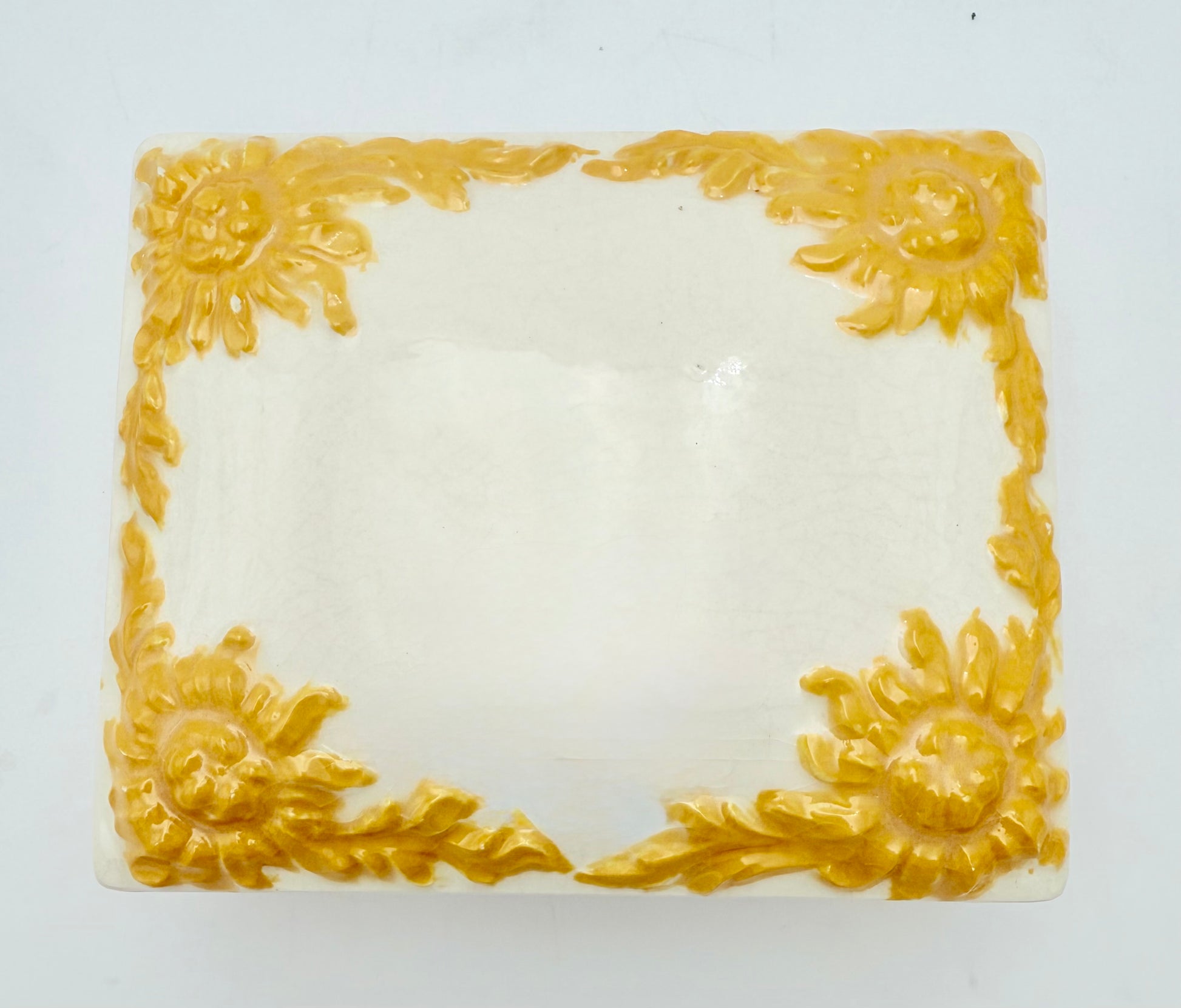 Add a touch of warm European charm to your vanity or dresser with this beautiful vintage ceramic trinket box. Crafted in the mid-century Italian style, the piece features raised sunflower and leaf relief in a rich honey–ochre glaze, set against a creamy ivory crackle-glazed body.