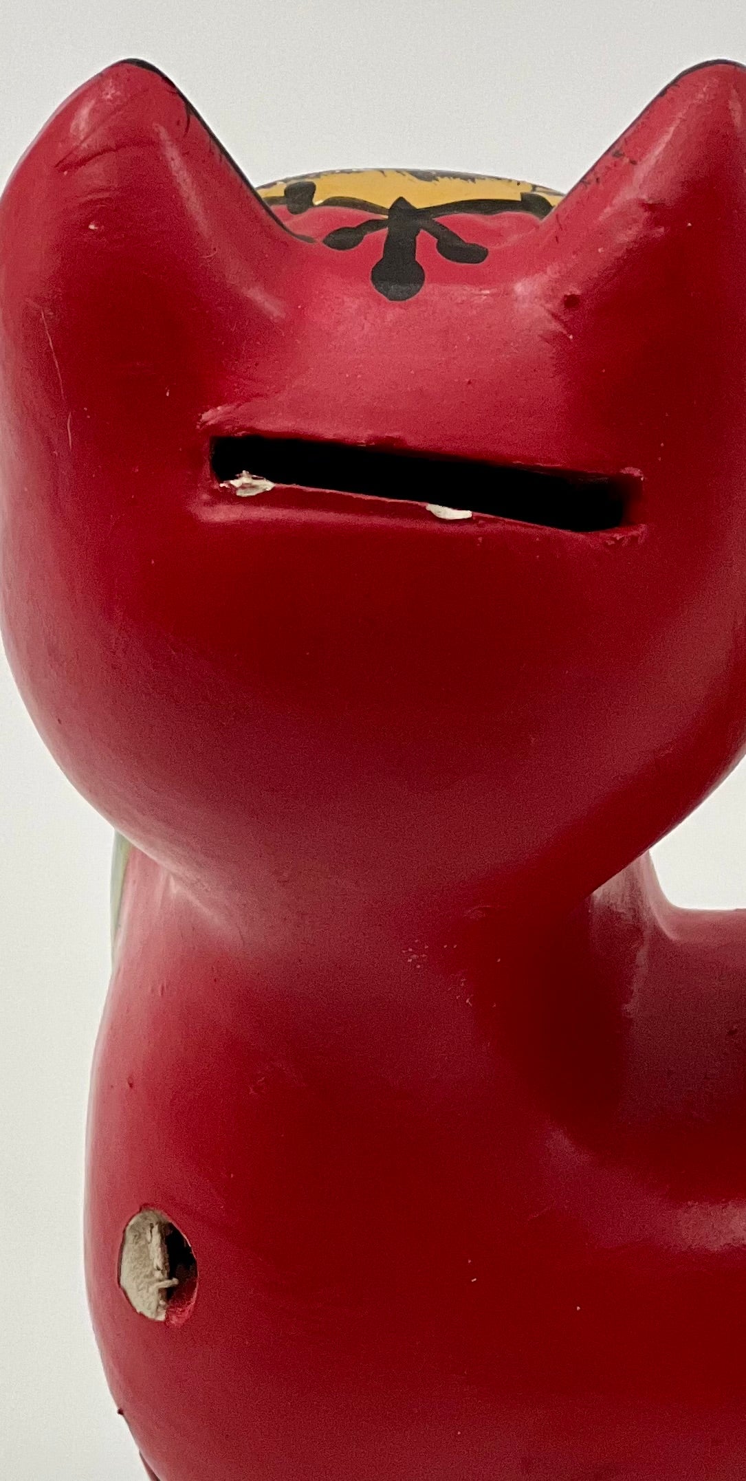 This delightful vintage cat coin bank is a hand-painted folk art piece featuring expressive facial details, bold red and green coloration, and charming stitched costume motifs. The playful stance, raised tail, and whimsical bow tie give this piece strong mid-century folk art character and decorative appeal.