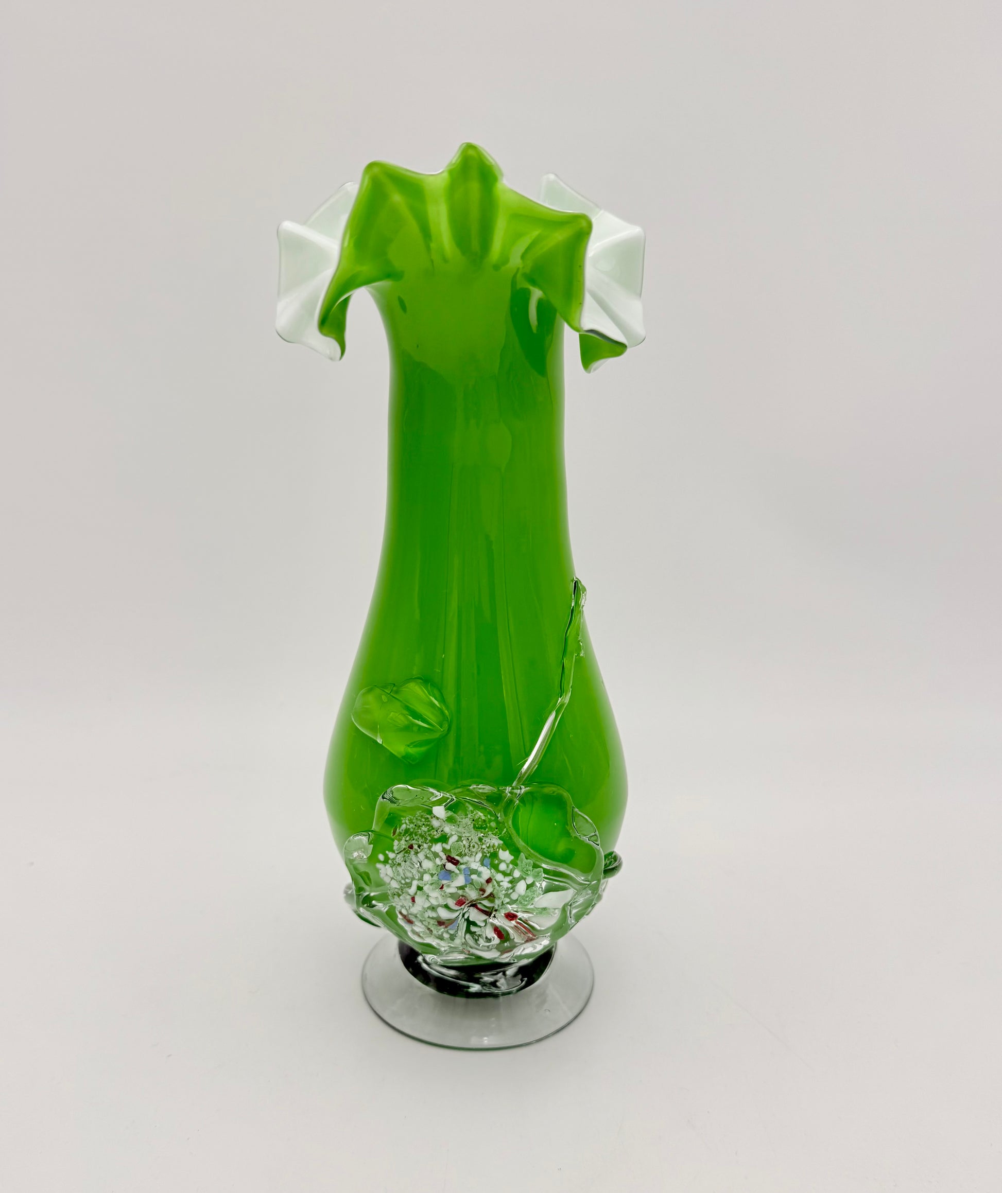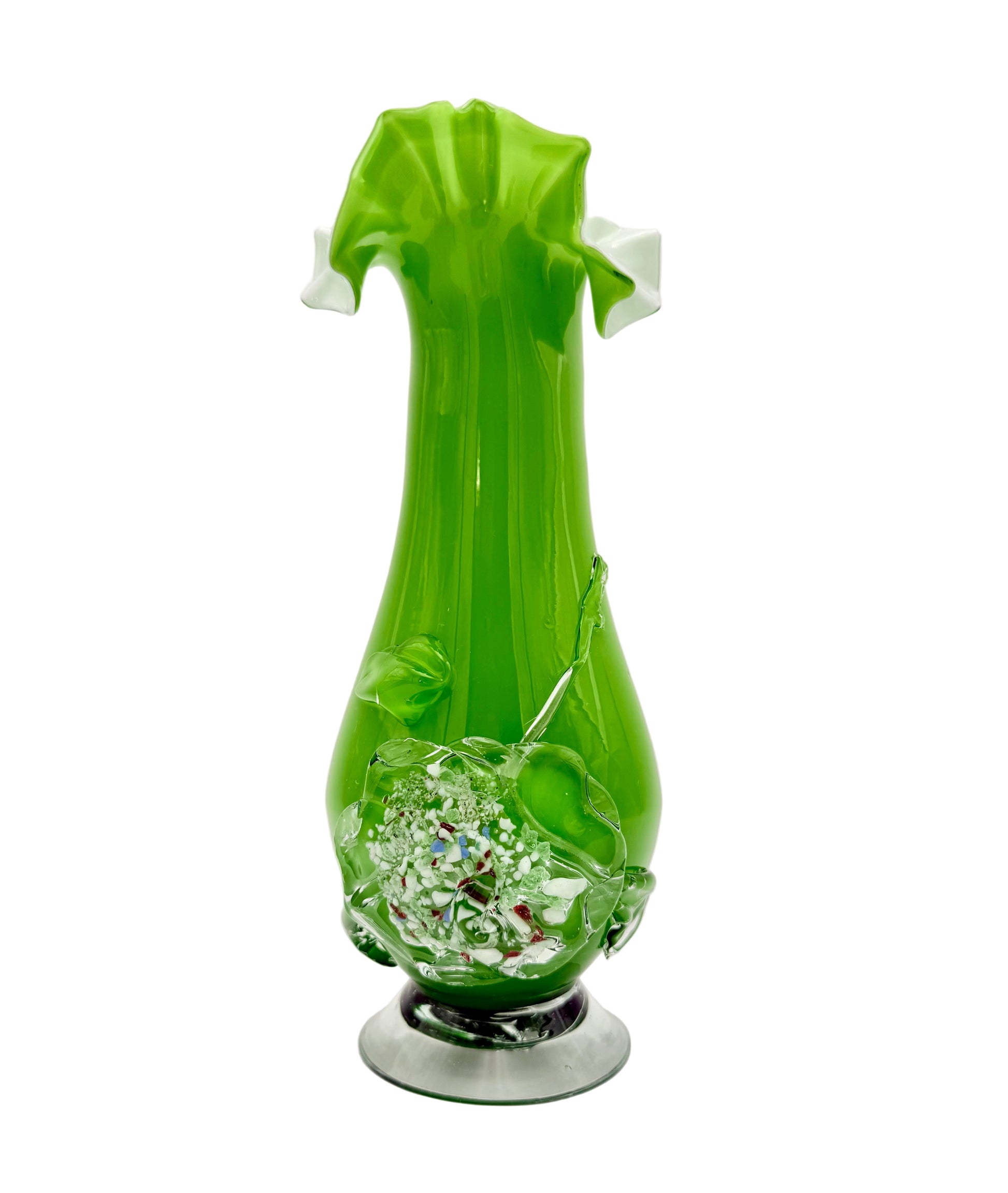 Beautiful, vivid, and sculptural — this hand-blown art glass vase features a striking apple-green body with a ruffled white cased rim and intricate applied clear-glass leaves and vines. A bold frit-glass floral burst decorates the front, incorporating pops of white, red, blue, and green for a true studio-glass statement.