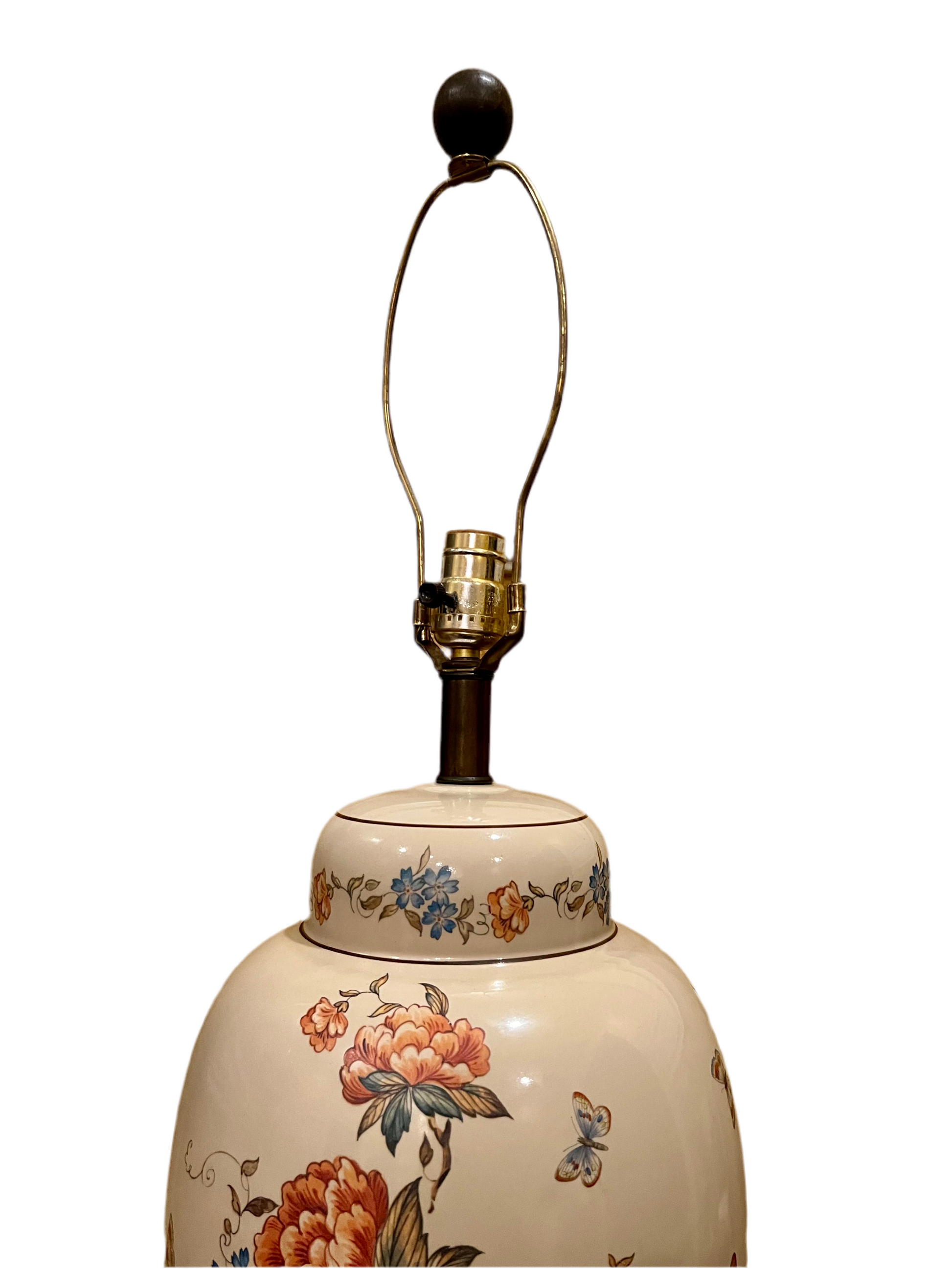 Bring timeless charm to your home with this vintage handmade ceramic lamp by Nathan Lagin Co., Inc. Its ginger-jar silhouette, hand-painted floral and butterfly motif, and warm cream glaze make it a true statement piece. Perfect for adding an eclectic, romantic glow to any interior.