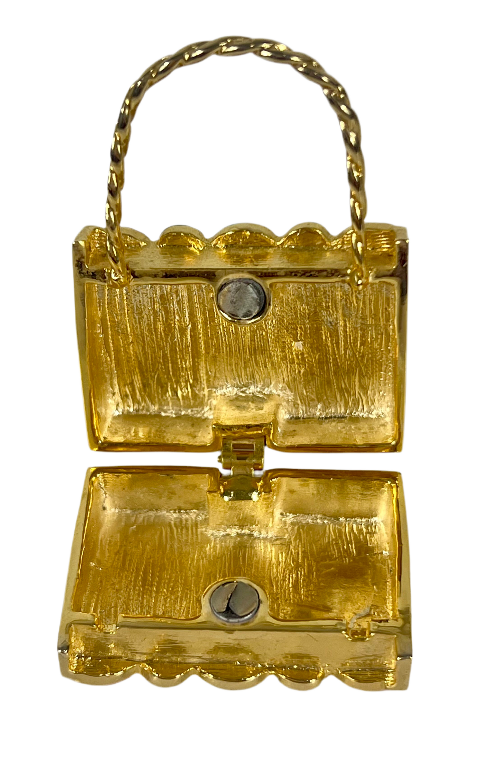 A little pop of joy! This tiny handbag trinket box sparkles with pastel enamel swirls—mint, aqua, blush, citrus—and clear rhinestones on a textured gold-tone body. Twisted handle, scalloped edge, and a hinged lid for rings, pills, or tiny love notes.