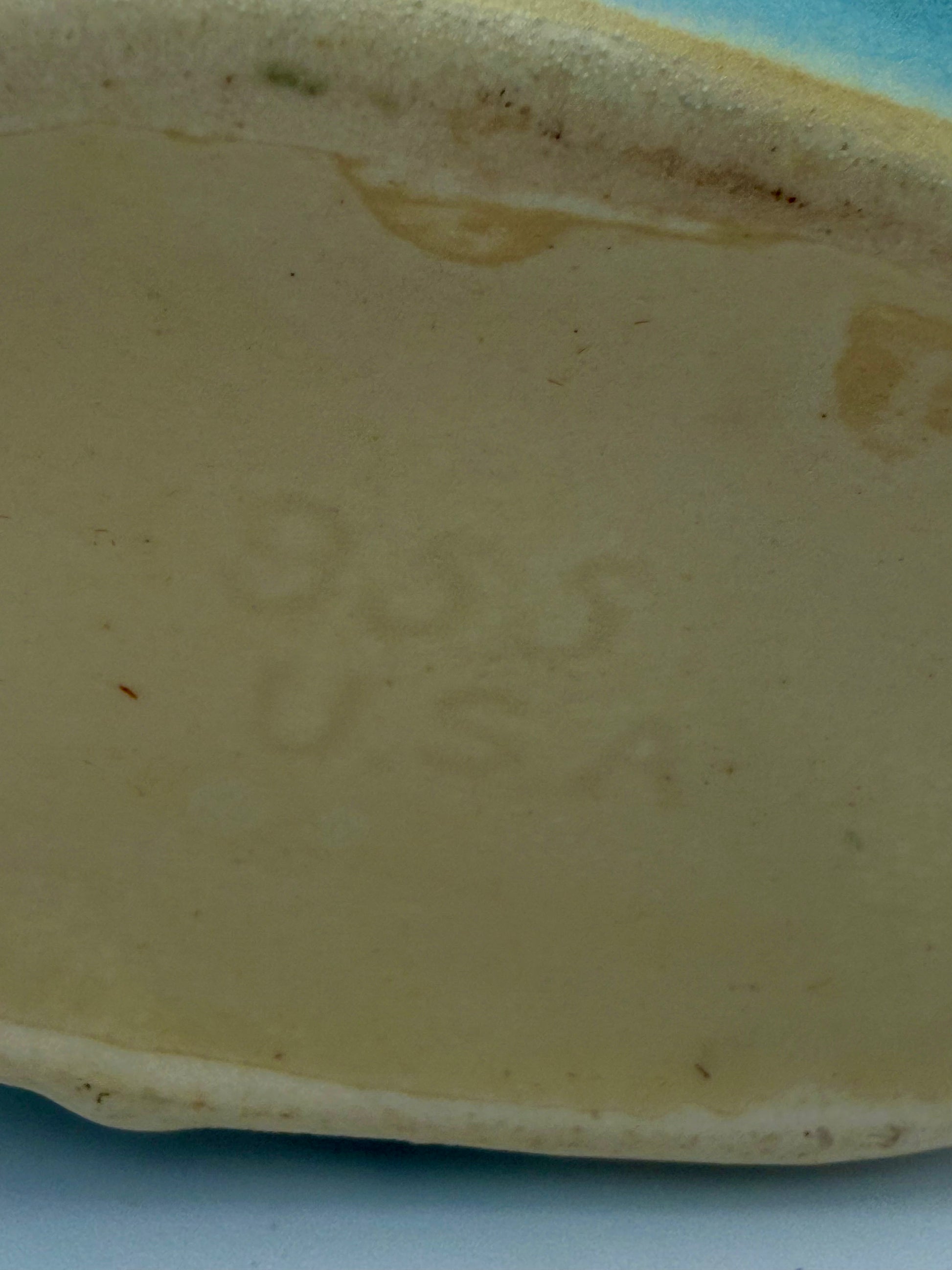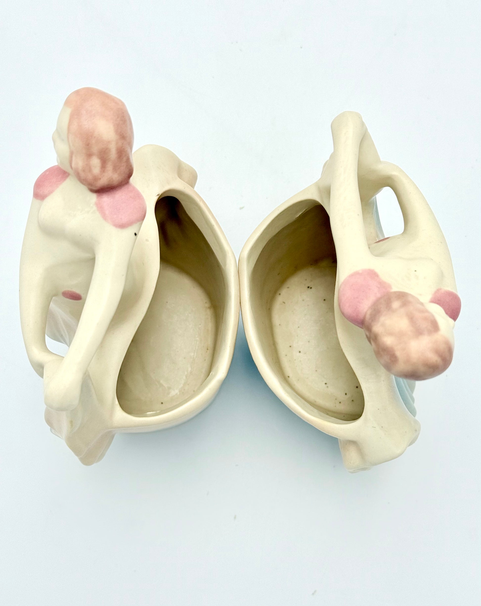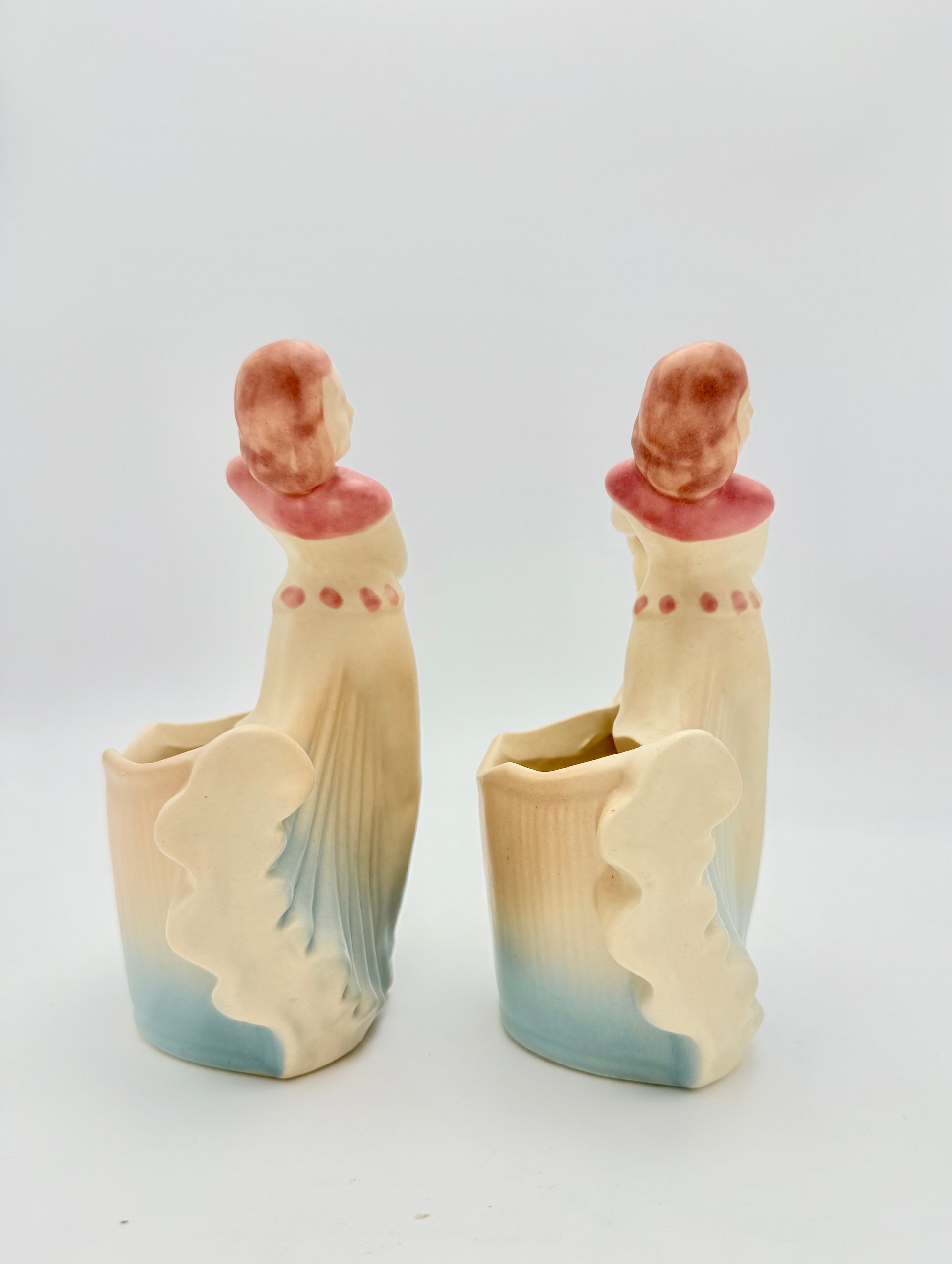 A graceful pair of vintage figural lady vases marked “955 USA”, attributed to Shawnee Pottery, circa 1940s–1950s. Each vase depicts an elegant woman with outstretched arms and a flowing, shell-inspired skirt that sweeps into soft pastel hues of blush and powder blue. The matte glaze gives them that timeless Art Deco-meets-Hollywood Regency charm — perfect for adding vintage romance to a vanity, mantle, or shelf vignette.
