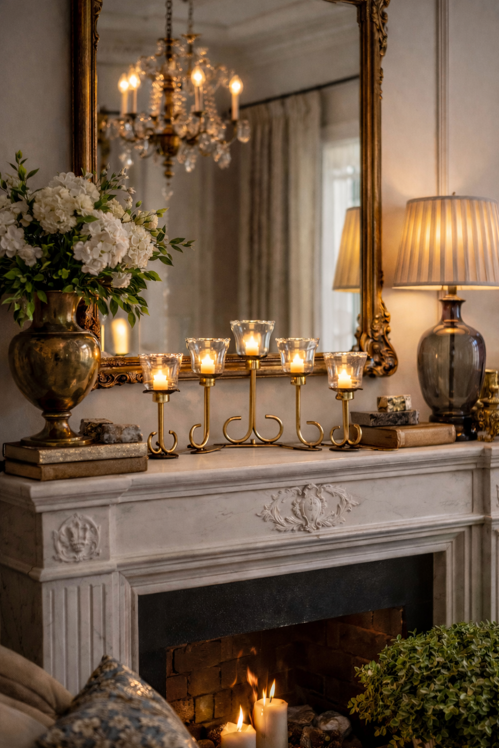 Designed at a refined 12-inch height, this candelabra was intentionally proportioned for use on mantels, dining tables, and sideboards, providing dramatic candlelight without overwhelming surrounding artwork or mirrors. The piece features a purpose-built modular design, with mechanically fastened arms that allow it to be displayed either in a classic fan or horseshoe formation for a formal centerpiece, or reconfigured into a linear arrangement ideal for a mantel or long surface.