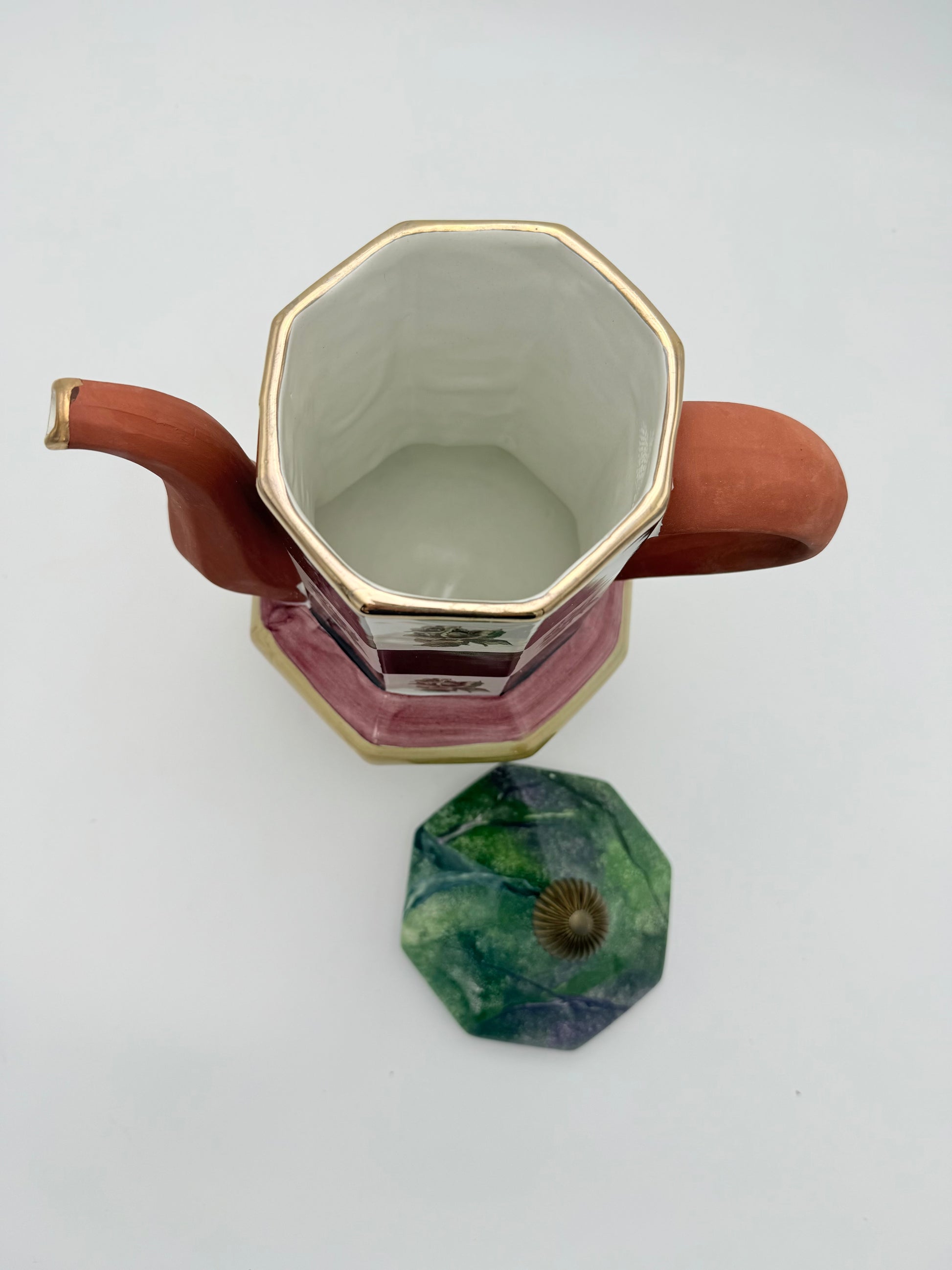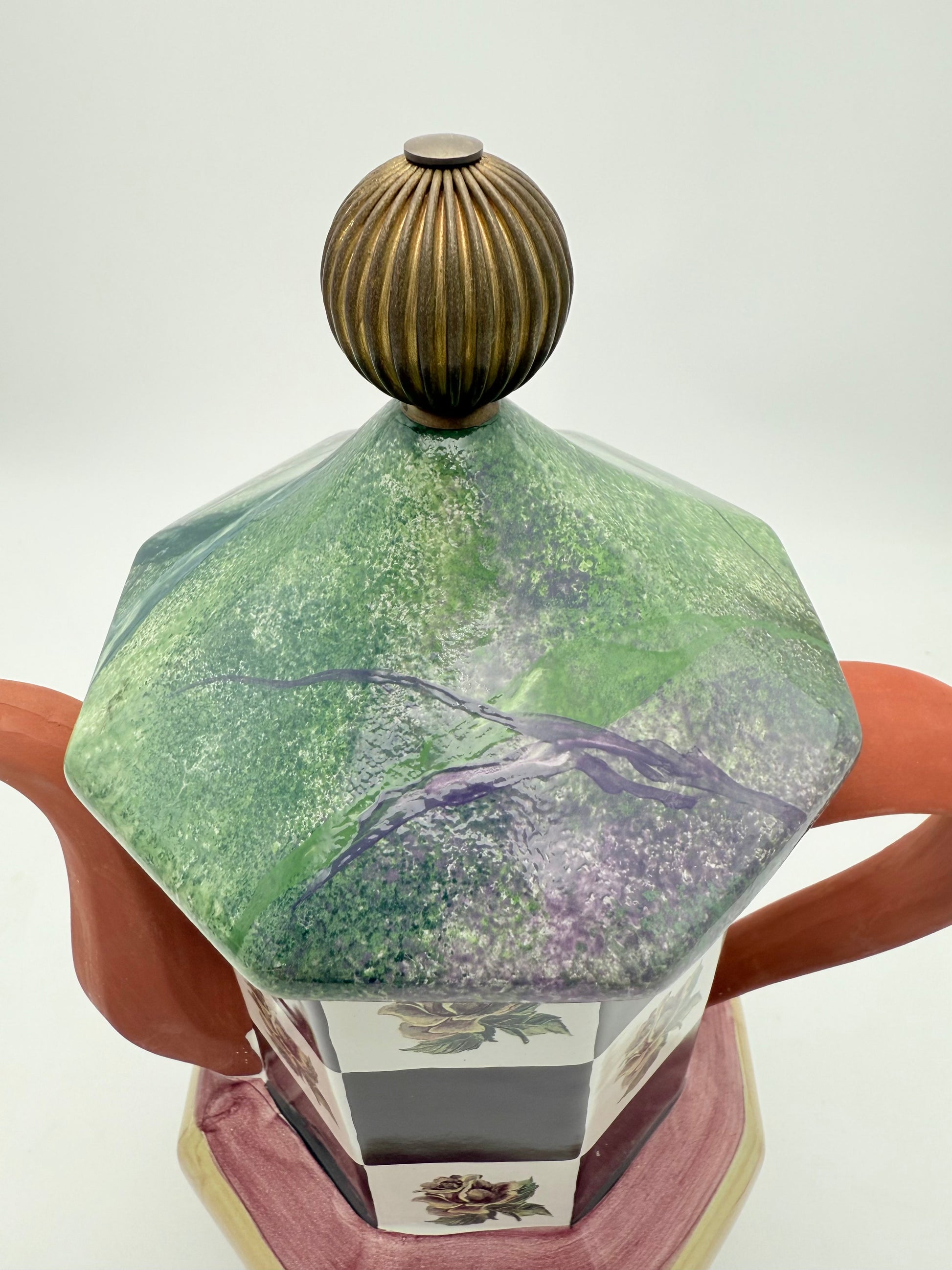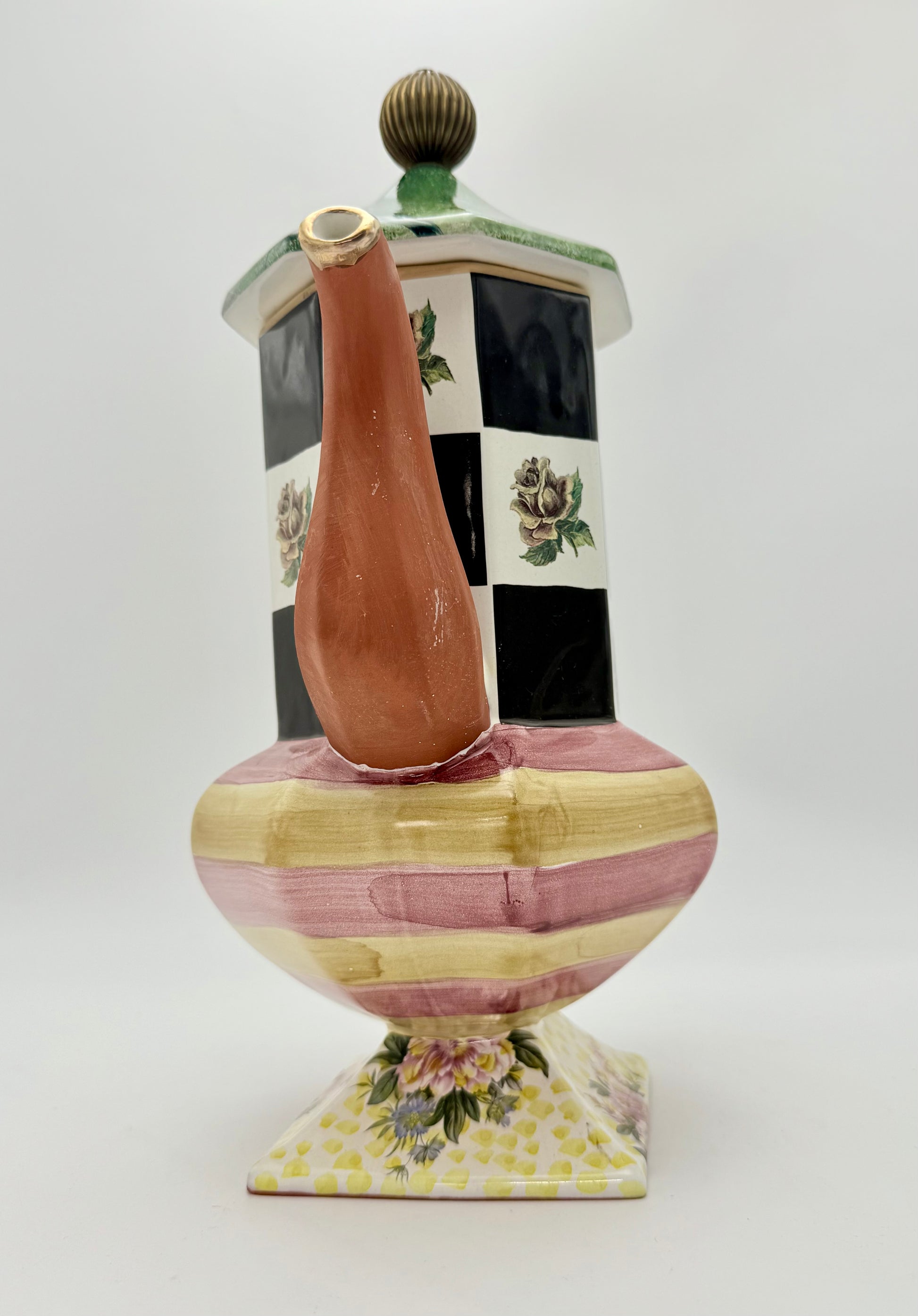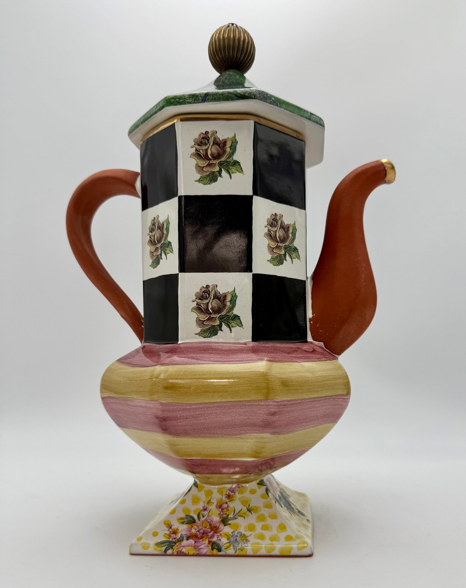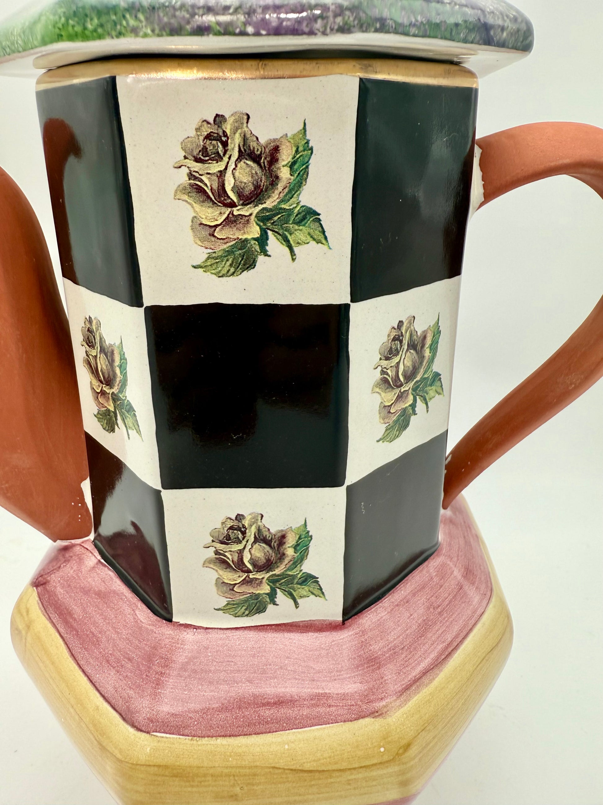 Bring bold personality and artistic charm to your home with this striking 1997 Frank & Mustard ceramic teapot. Known for their whimsical, mixed-pattern studio pottery, Frank & Mustard pieces combine folk-art creativity with the playful elegance of Mackenzie-Childs. This large decorative teapot is a standout example, featuring checkerboard panels with roses, striped body sections, sculptural lid with finial, and a floral patterned pedestal base.