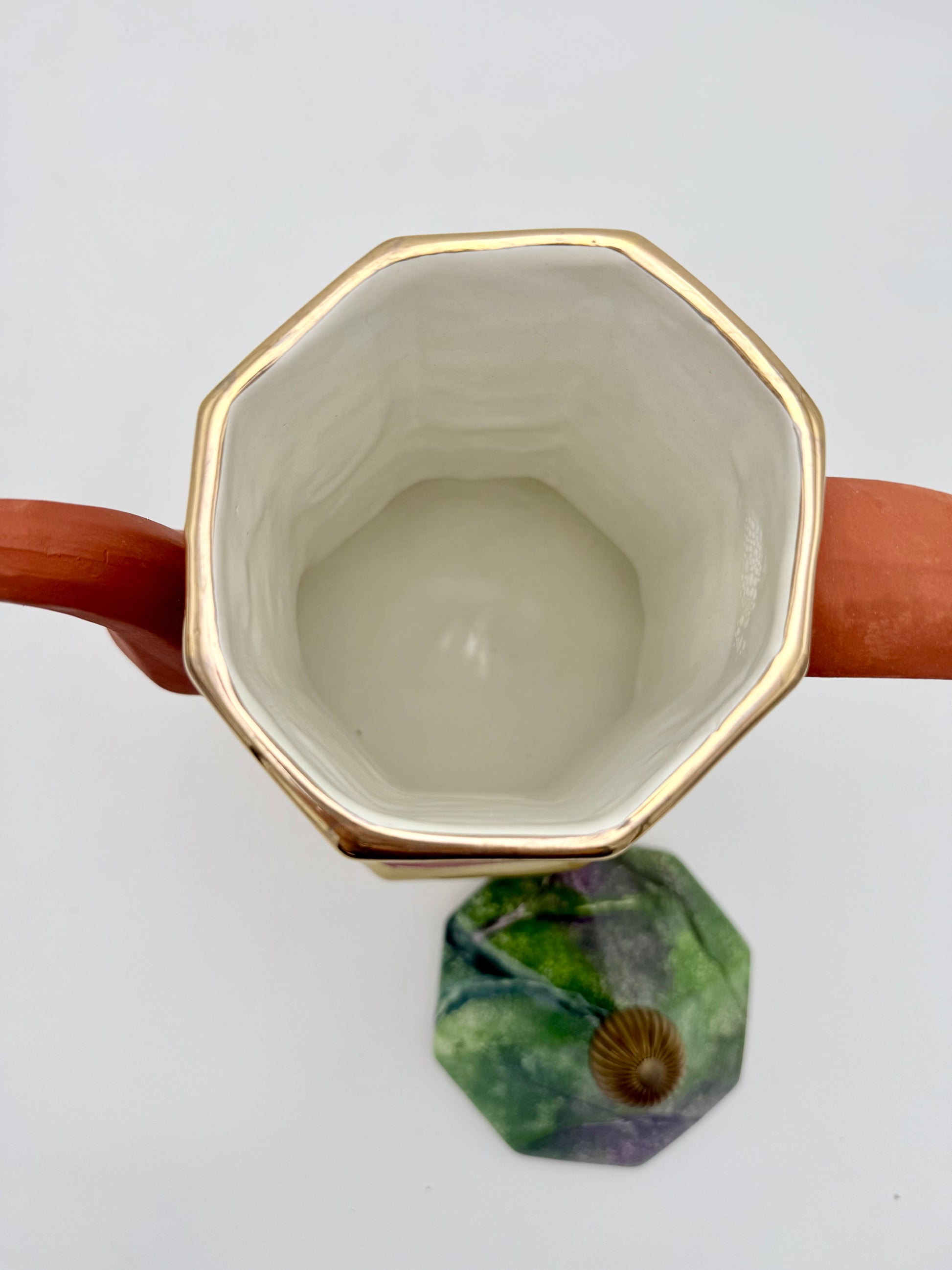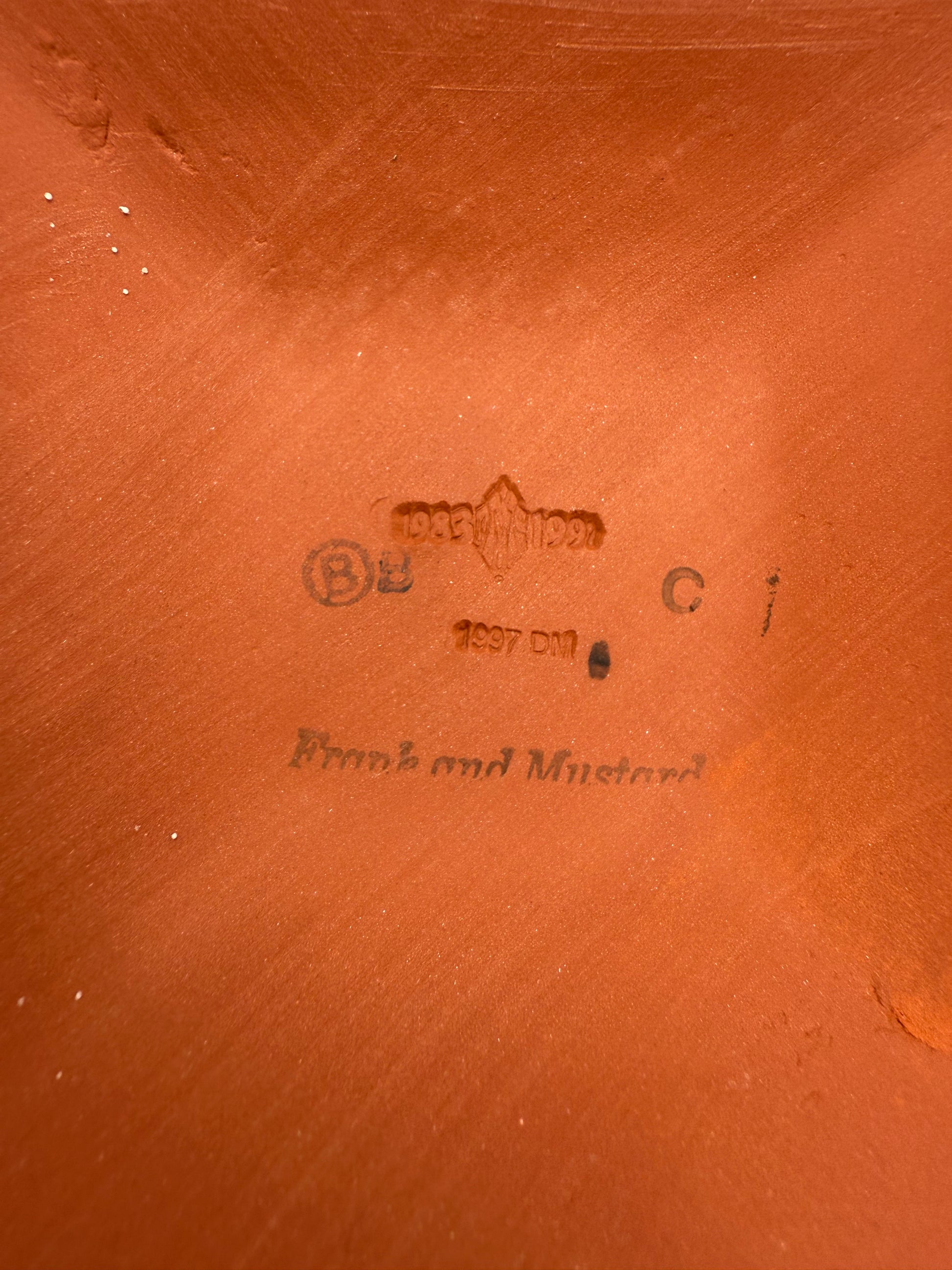 Hand-painted in 1997 and fully marked on the underside, this one-of-a-kind piece showcases the studio’s signature collage-style design and imaginative color combinations. It’s a rare size and makes a dramatic statement on open shelving, kitchen counters, hutches, china cabinets, or as part of an Eclectic Whimsy vignette.